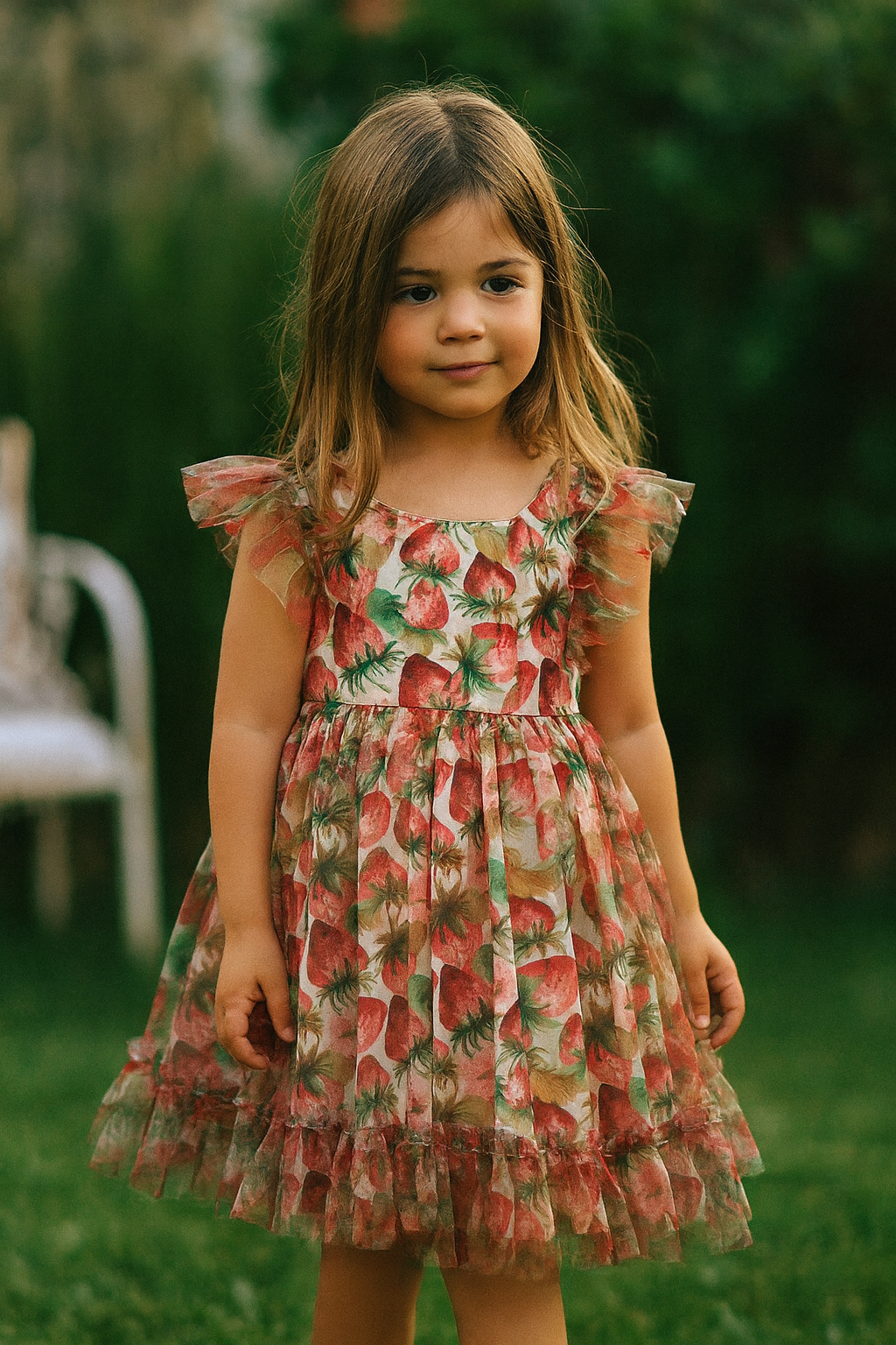 - Tessuto: leggero cotone e strati in tulle vaporoso, caratterizzato da una fantasia di fragole rosse su fondo chiaro, che dona freschezza e vivacità.