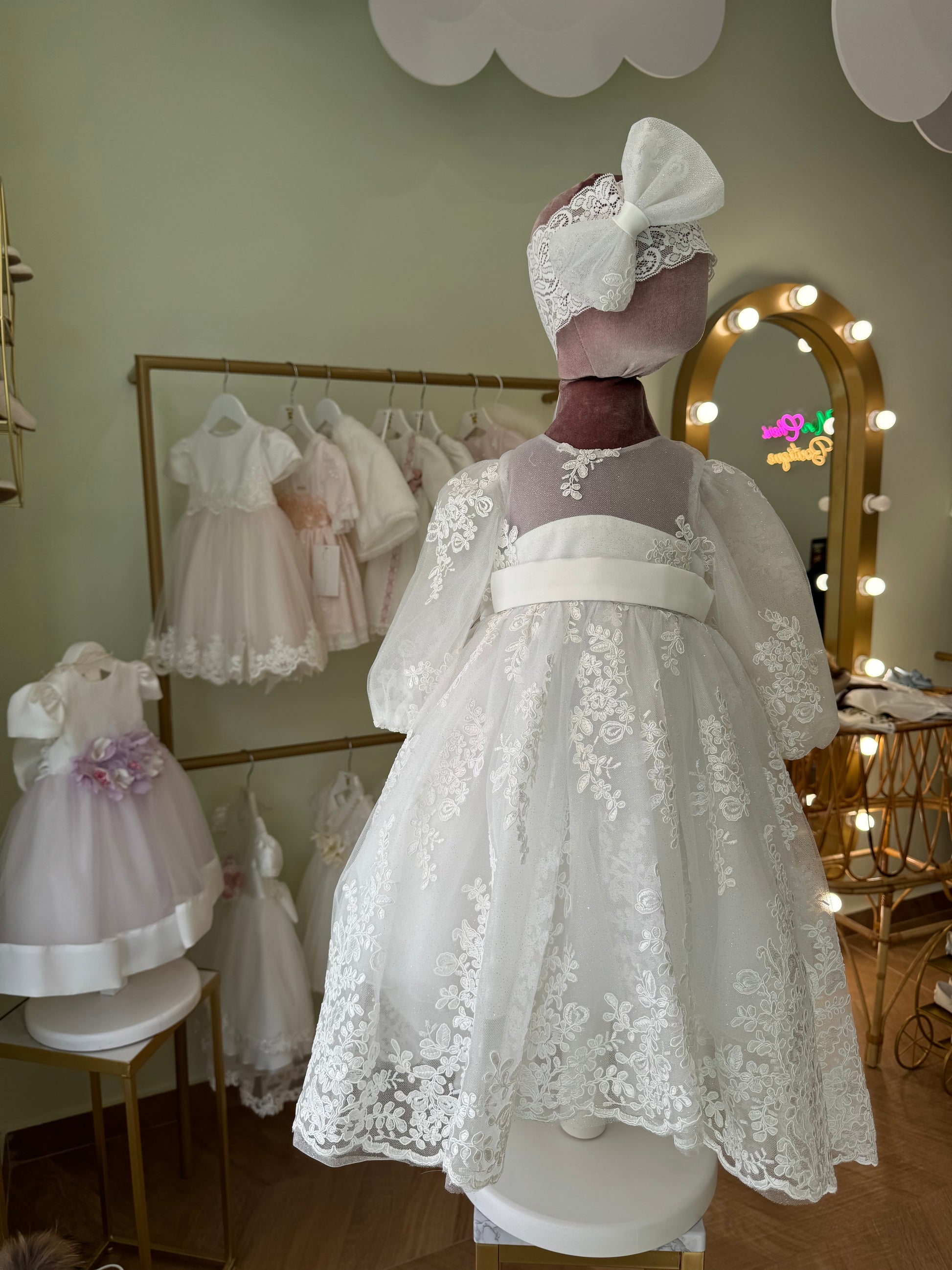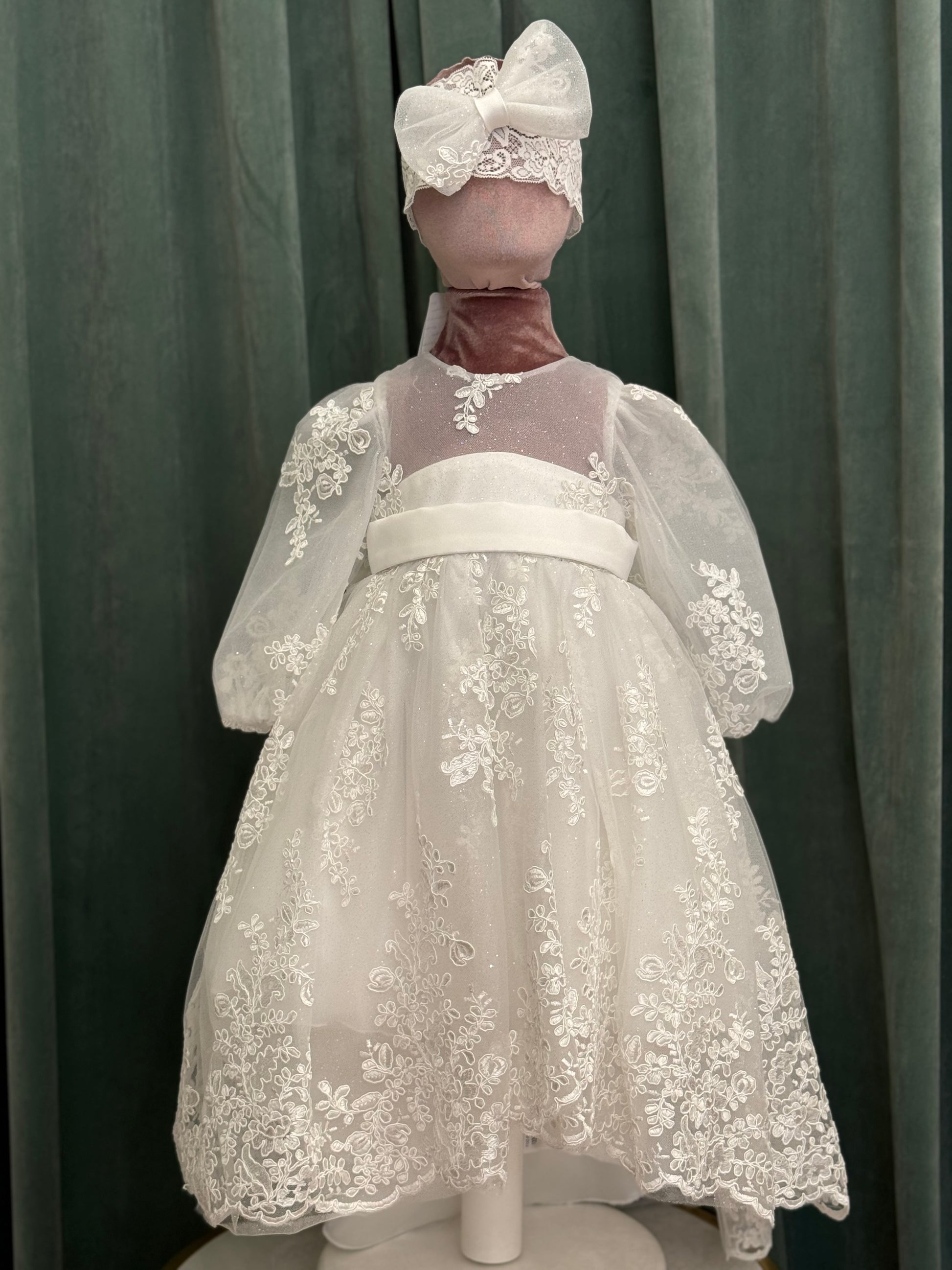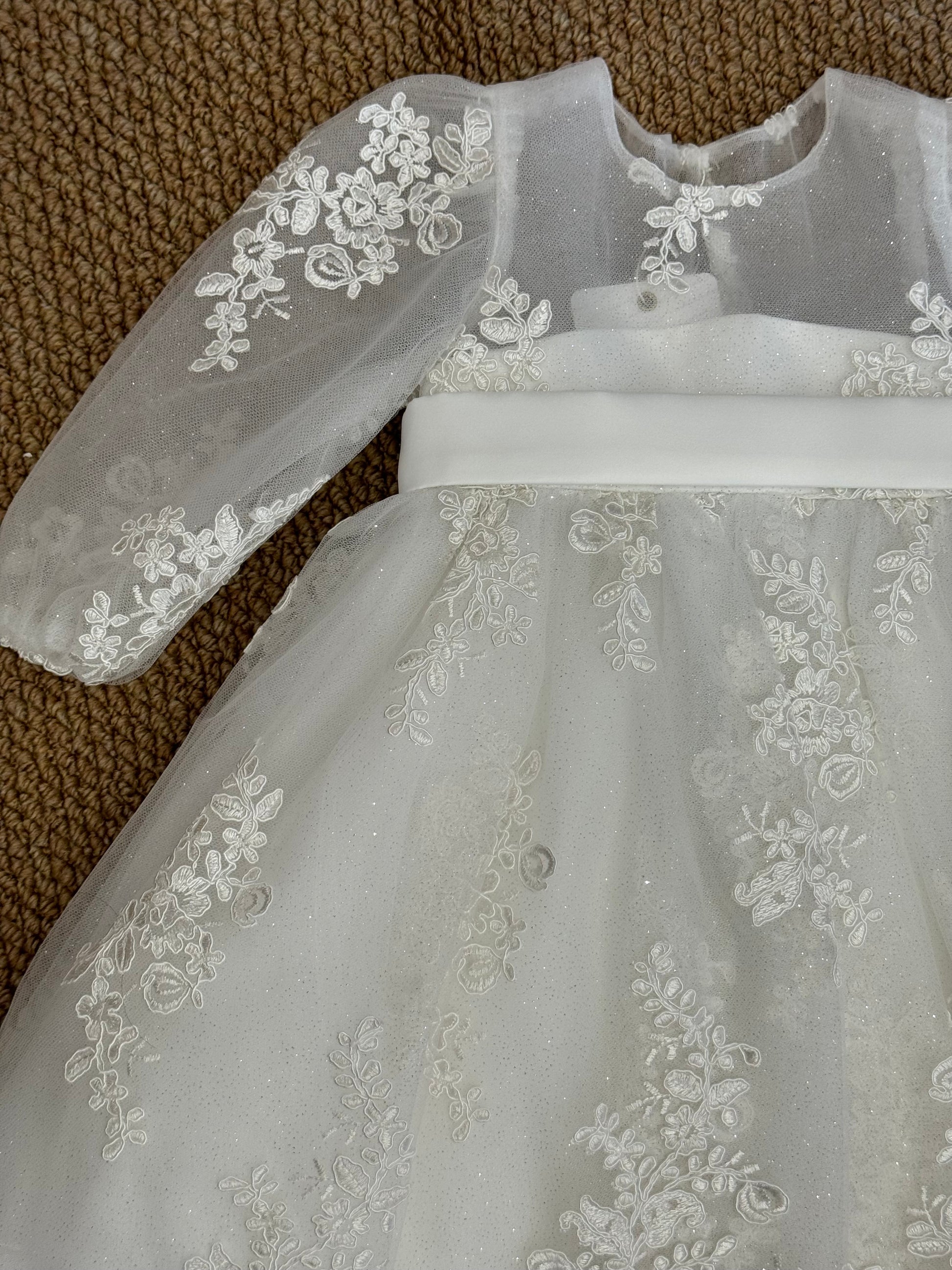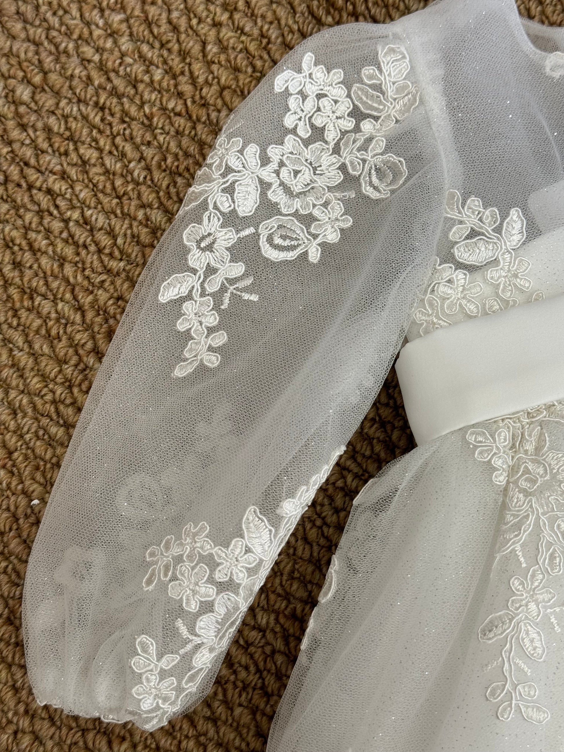 corpetto trasparente nella parte superiore, in tulle ricamato. Le maniche lunghe e leggermente a sbuffo realizzate in tulle trasparente con ricami floreali tono su tono.