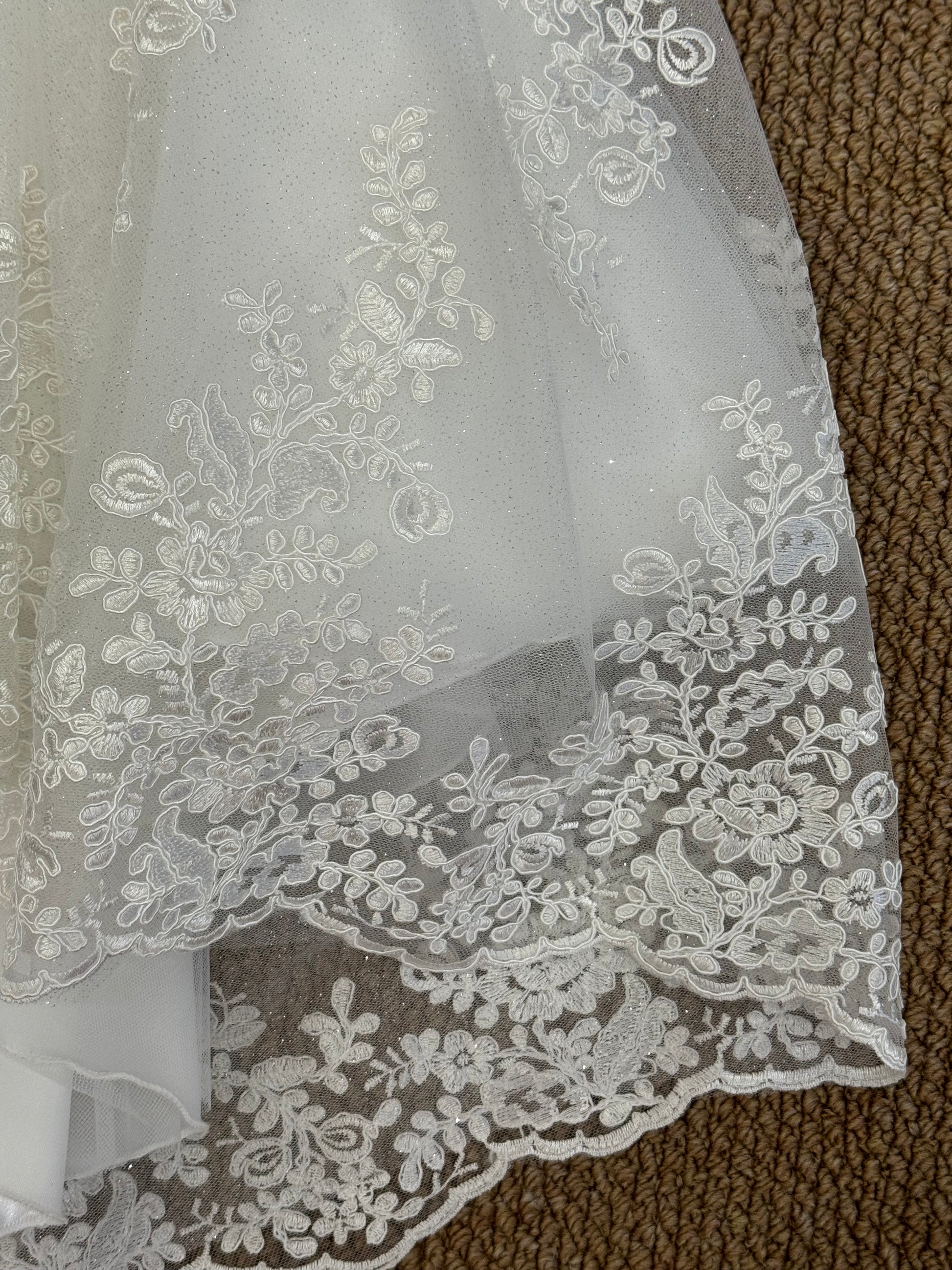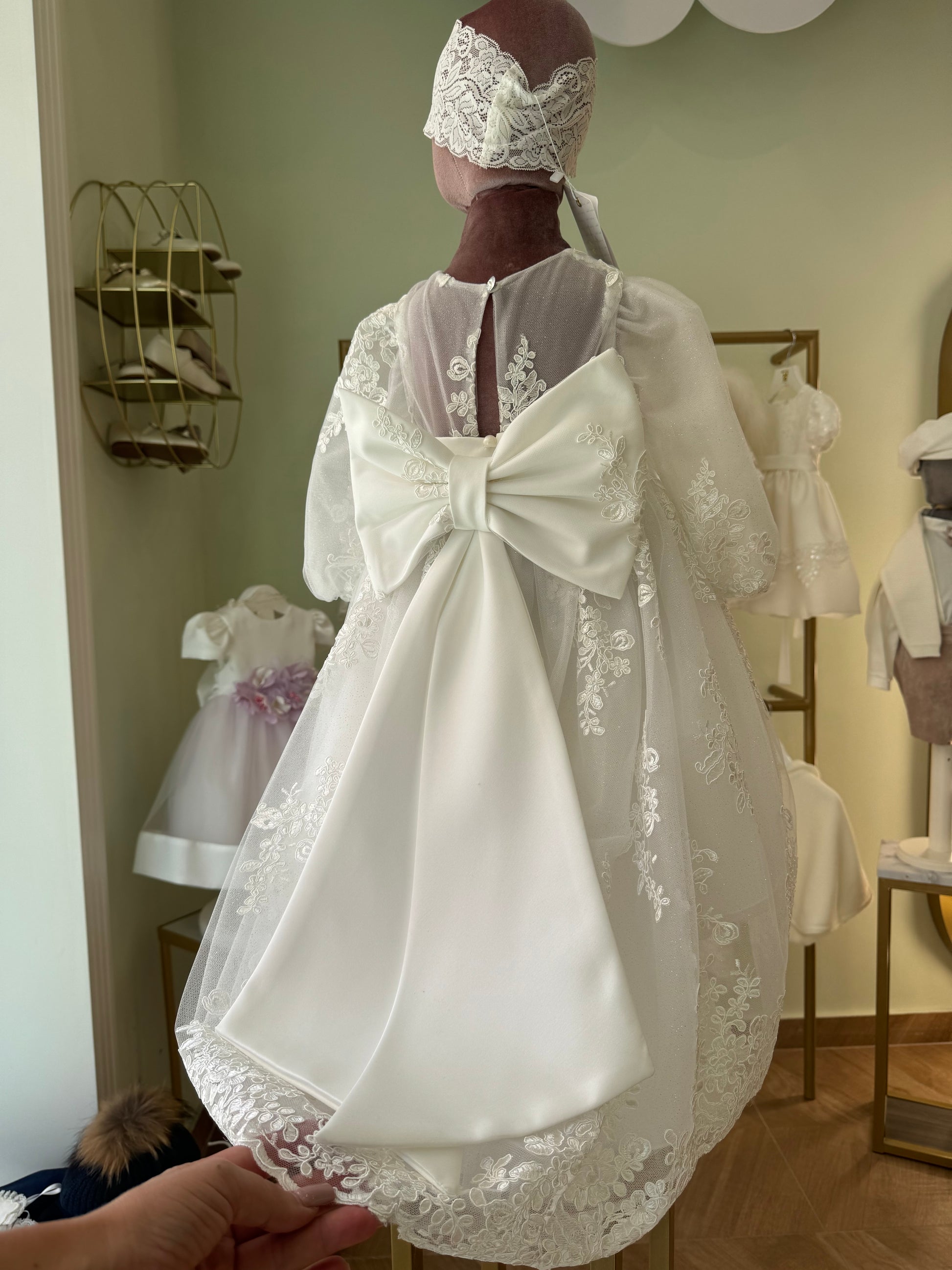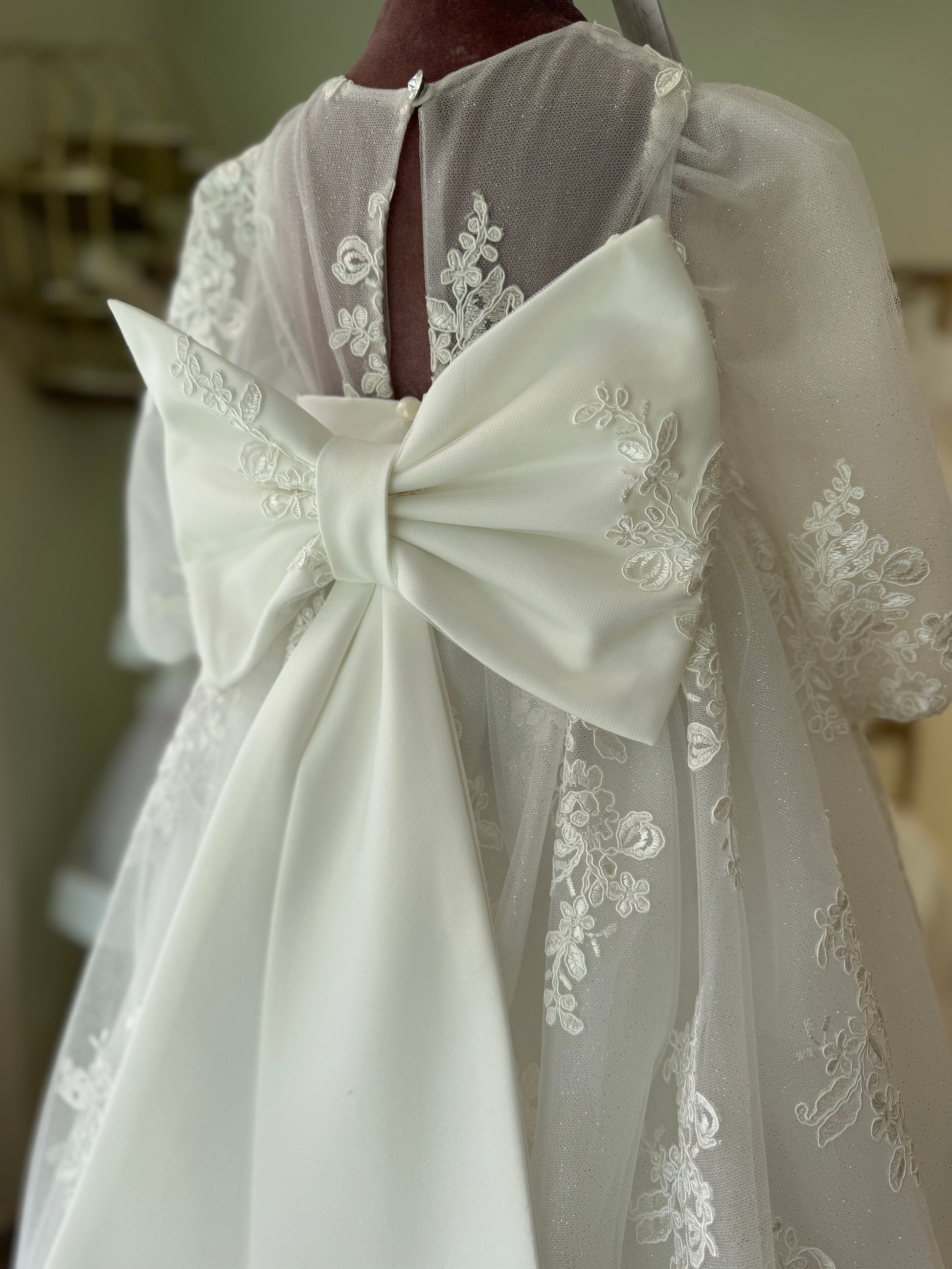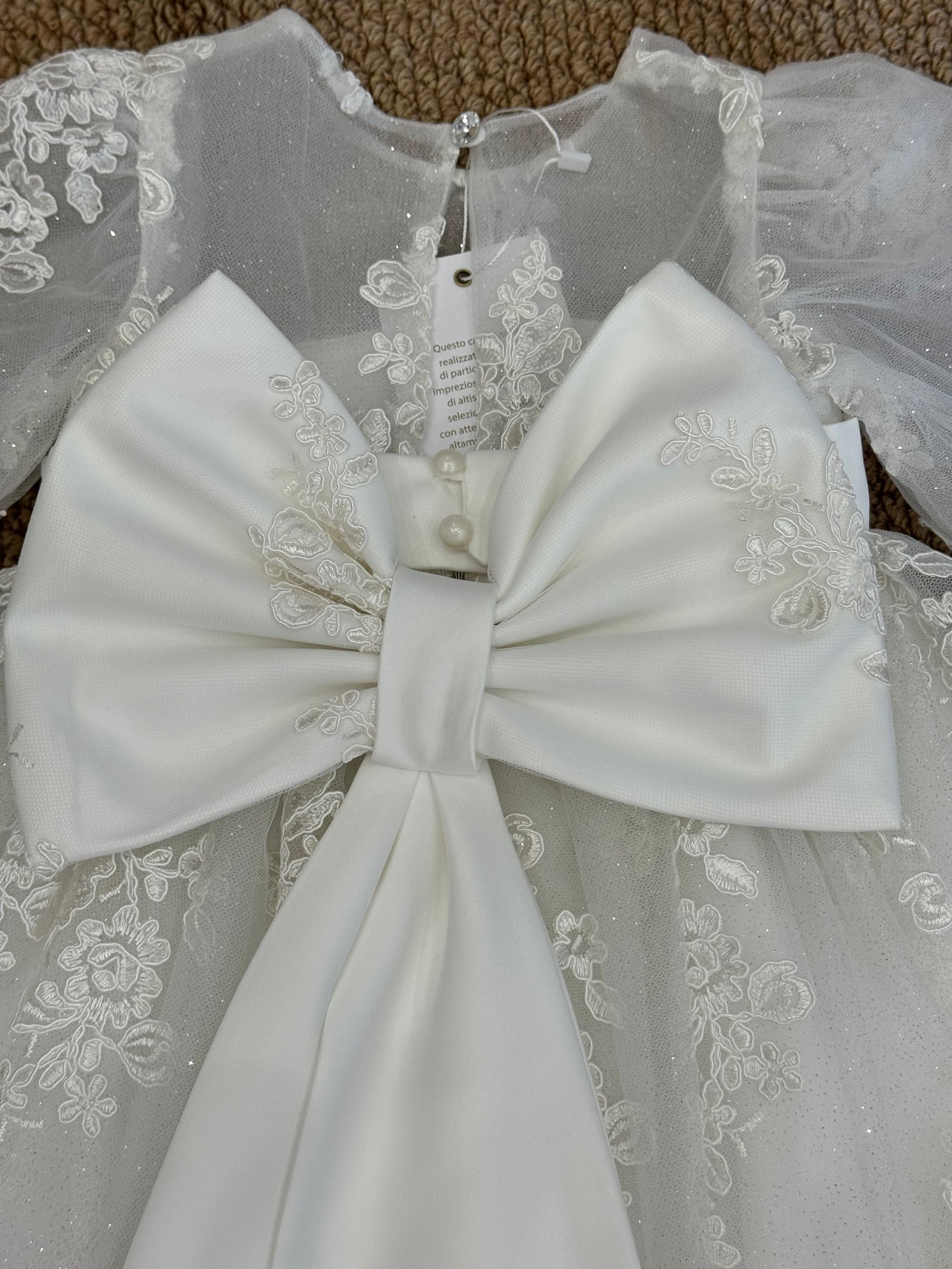 corpetto trasparente nella parte superiore, in tulle ricamato. Le maniche lunghe e leggermente a sbuffo realizzate in tulle trasparente con ricami floreali tono su tono.