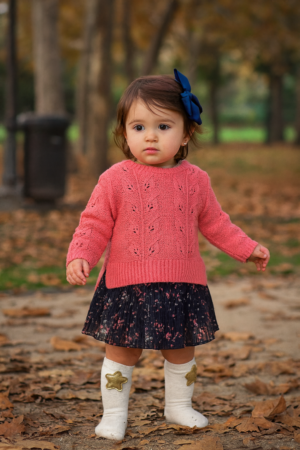 Abito in caldo cotone blu notte con gonna in velo a plissettata con micro fantasia floreale più in coordinato il suo maglioncino traforato in corallo che richiama il colore dei fiorellini .