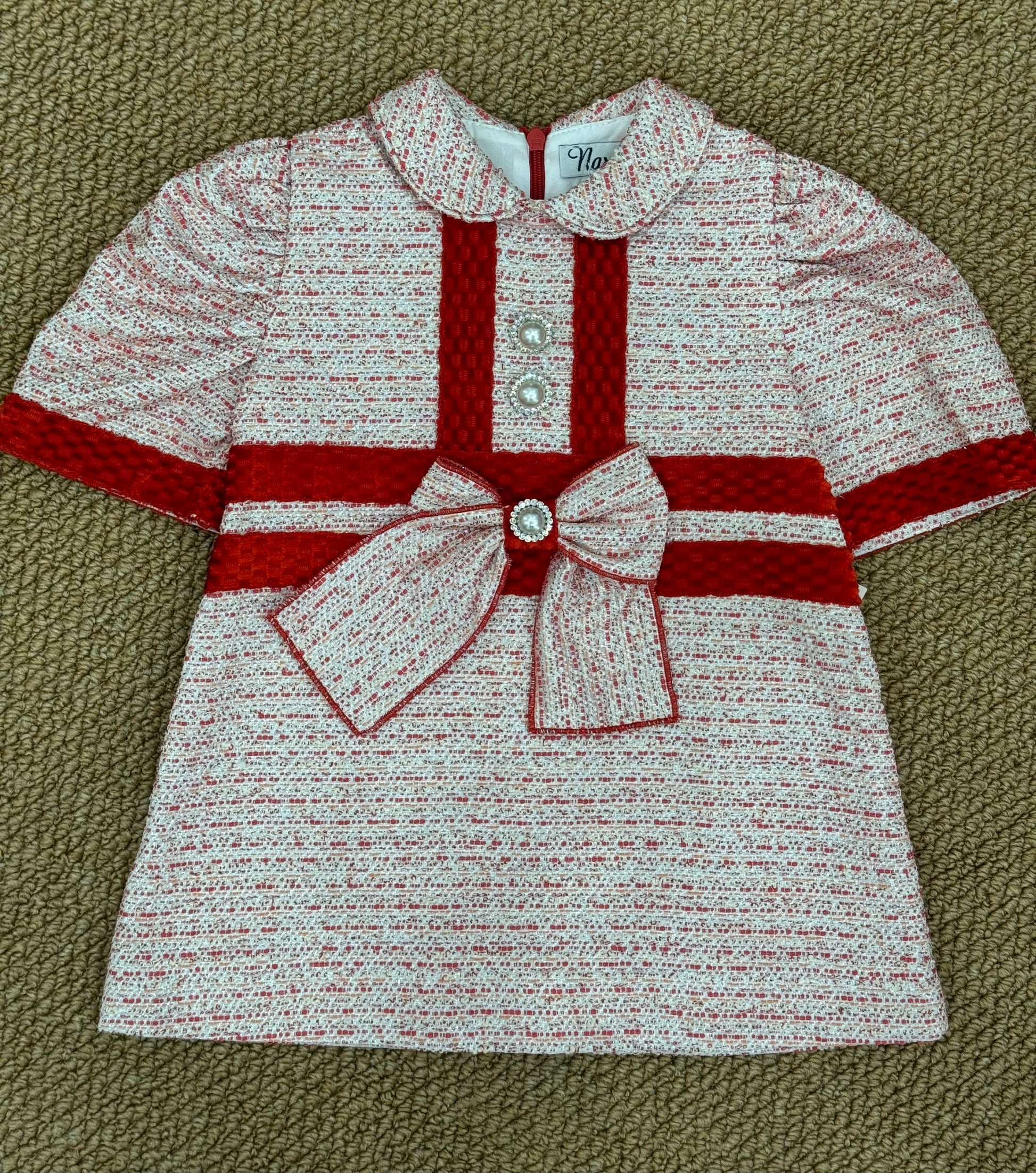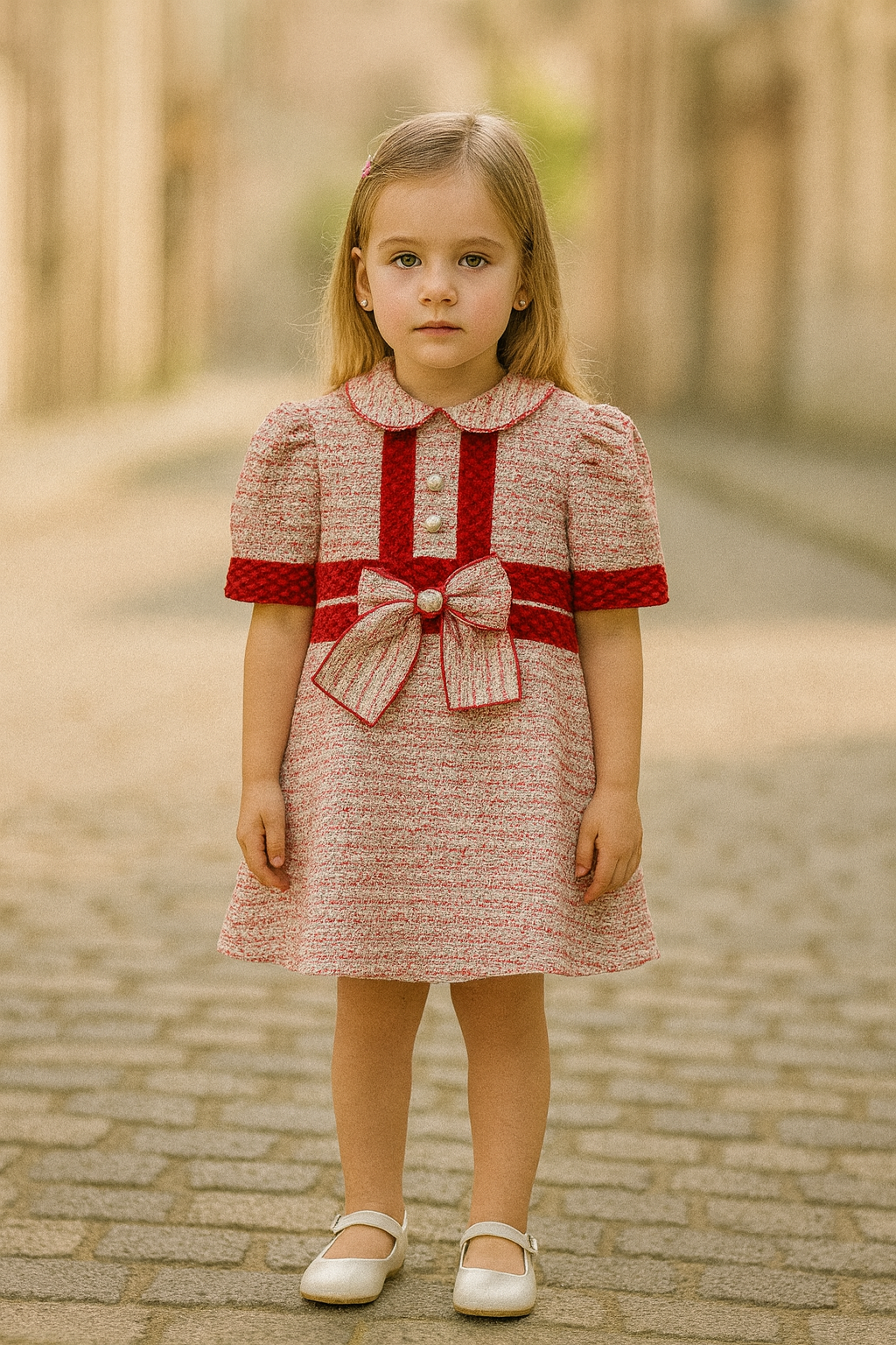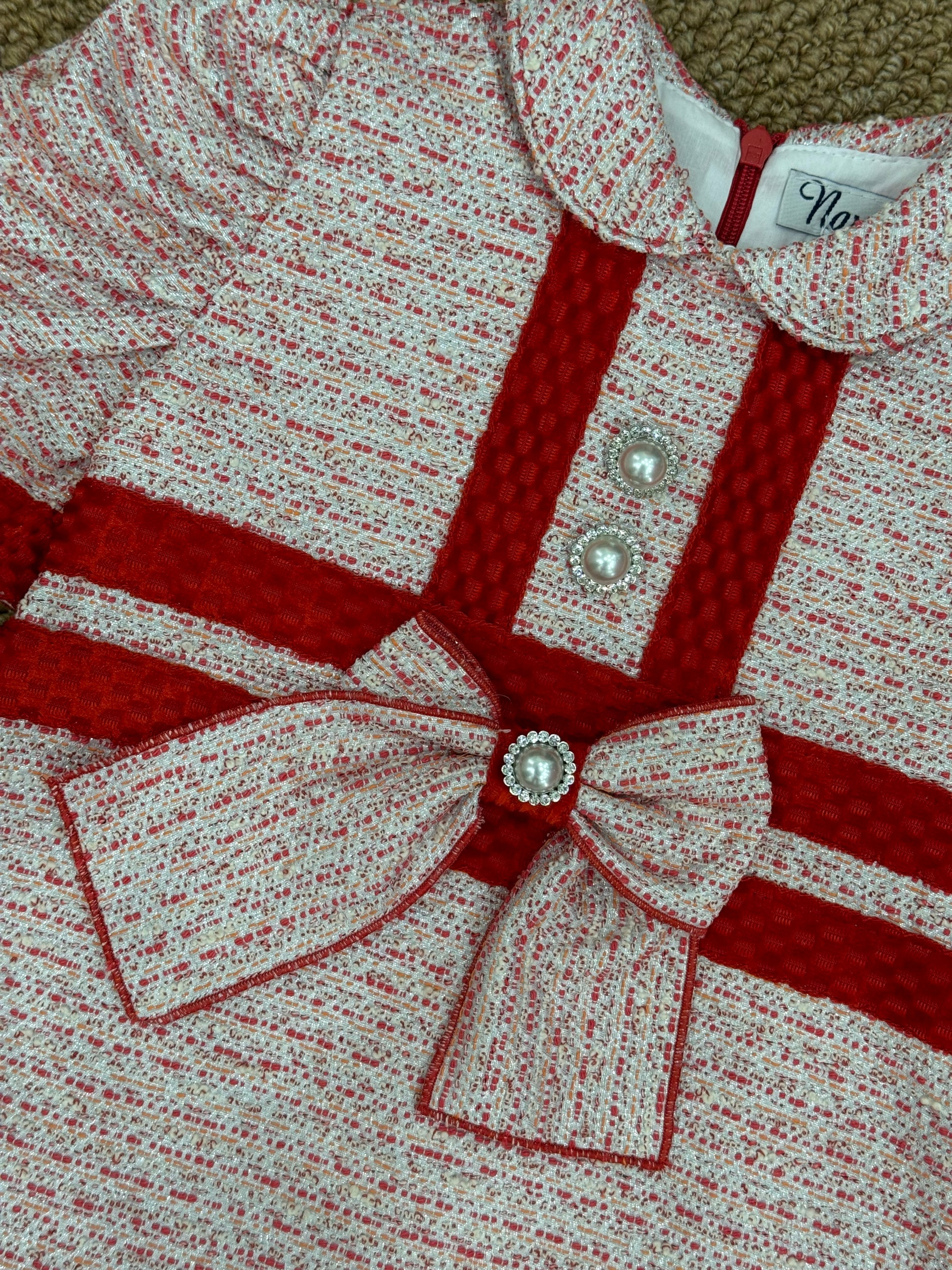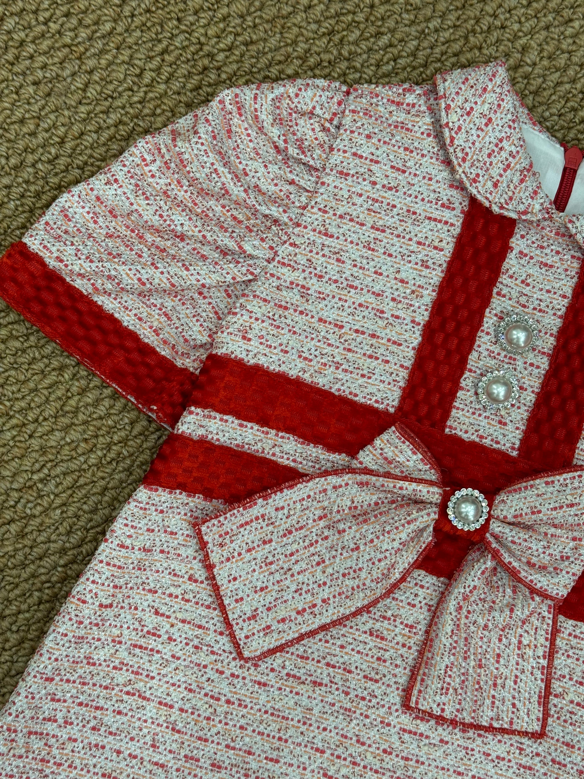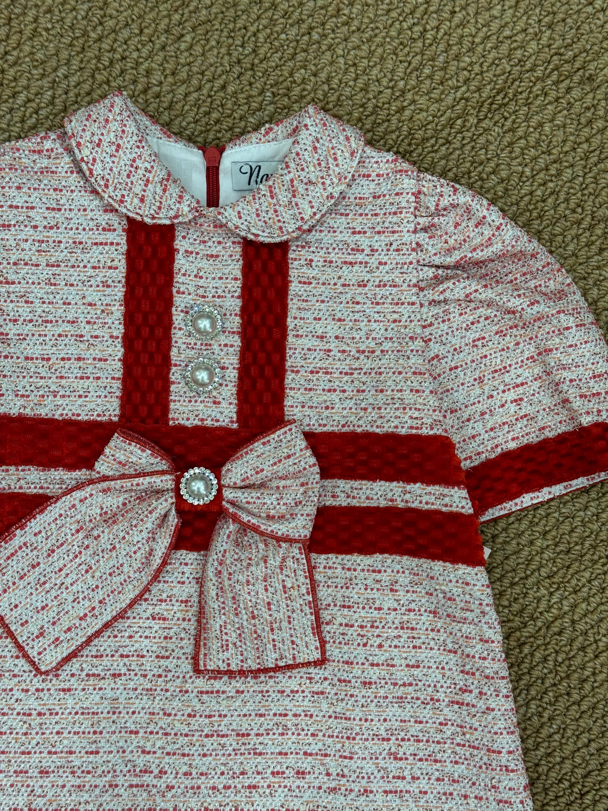L’abito è un vestitino elegante da bambina, realizzato in tessuto tweed nei toni del bianco panna e rosso, perfetto per le festività o cerimonie.