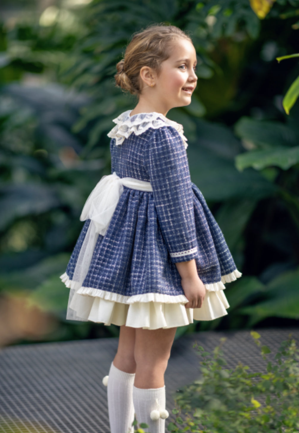 Abito in blu fantasia tweed con dettagli in pizzo e fiocco sul retro in tulle taglio lungo.