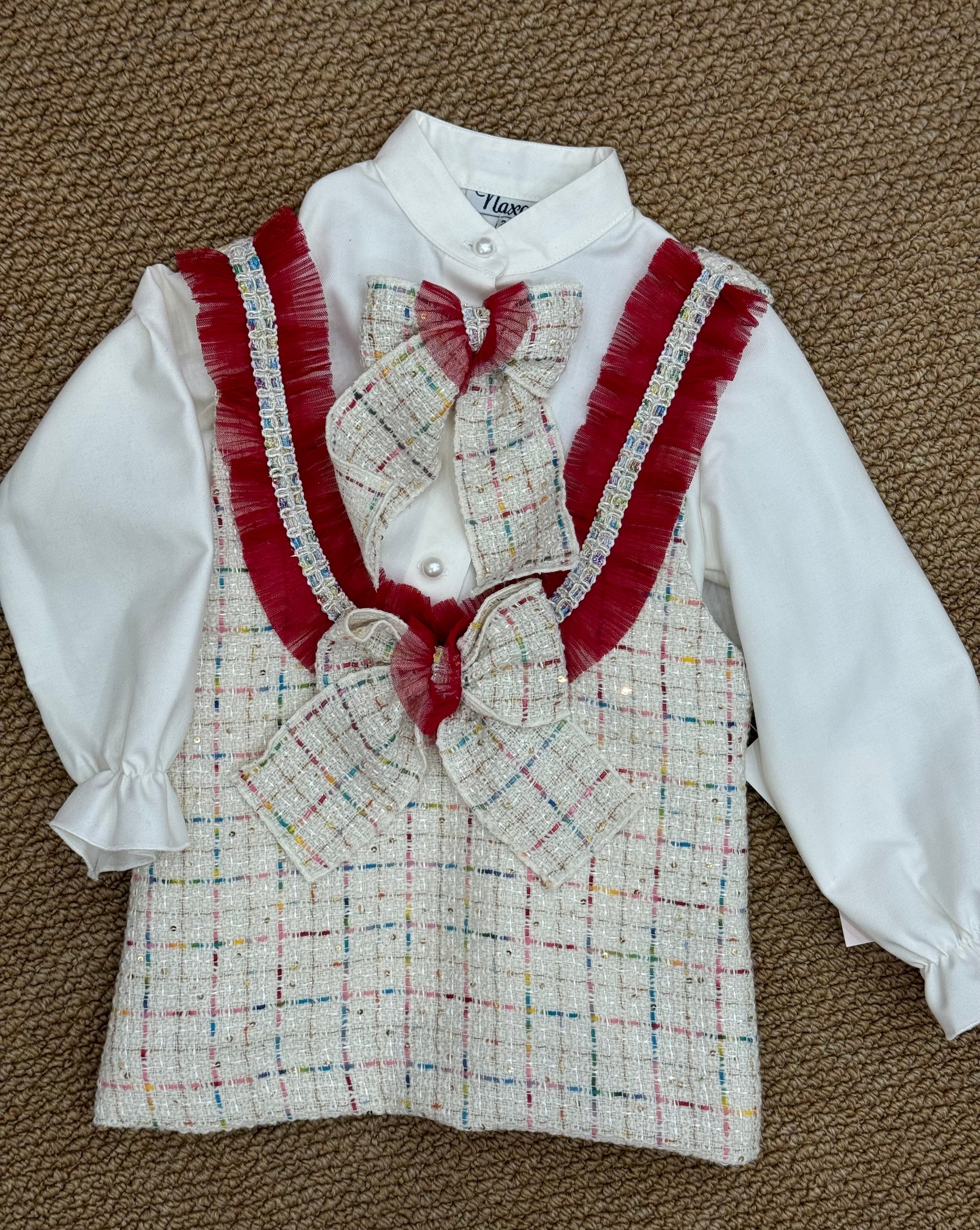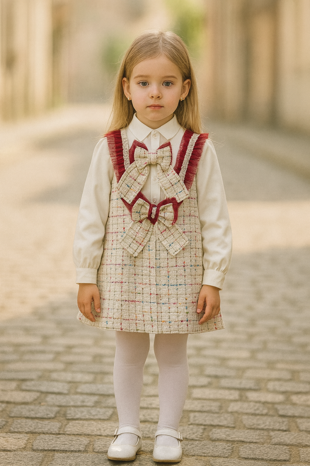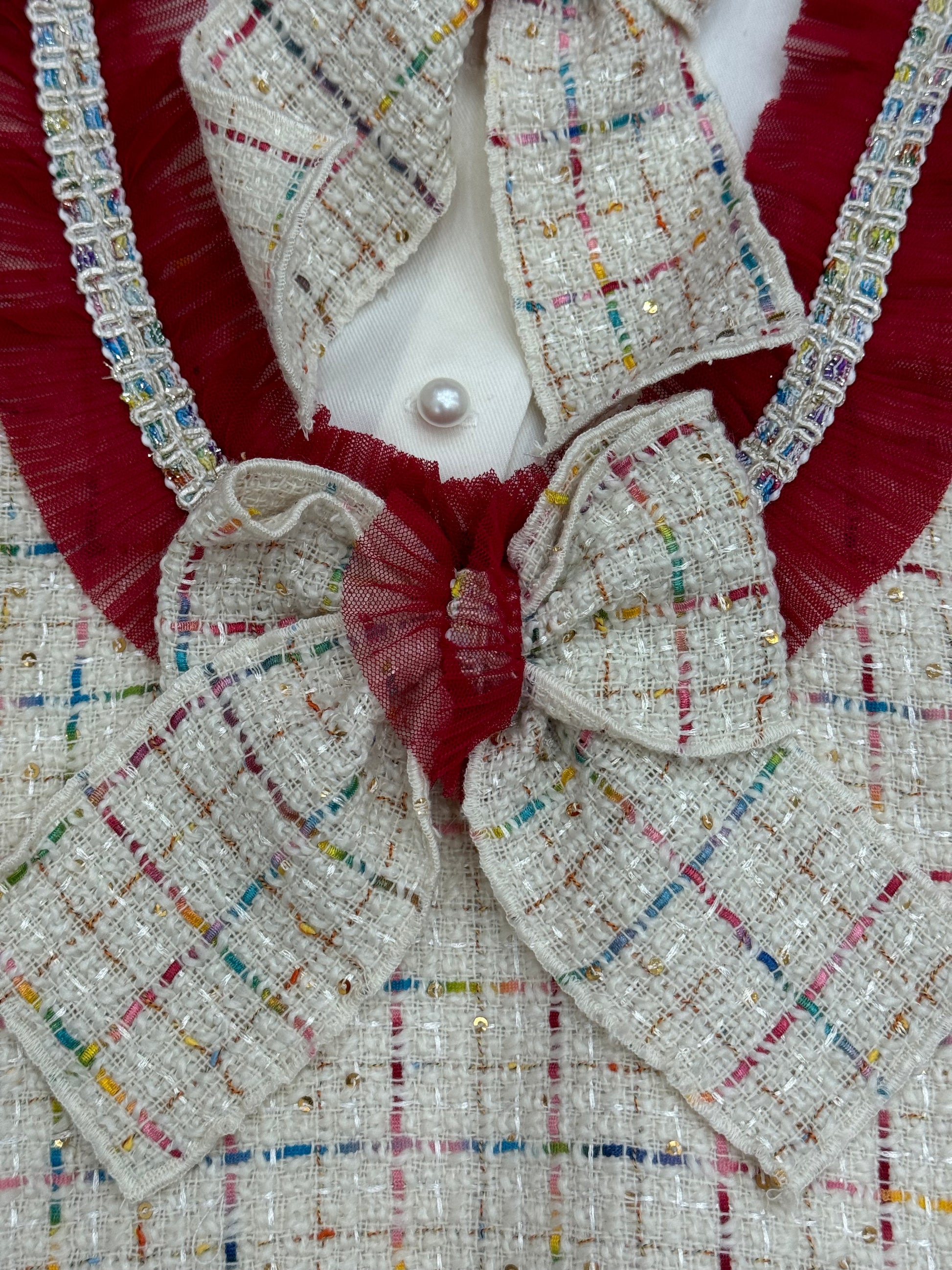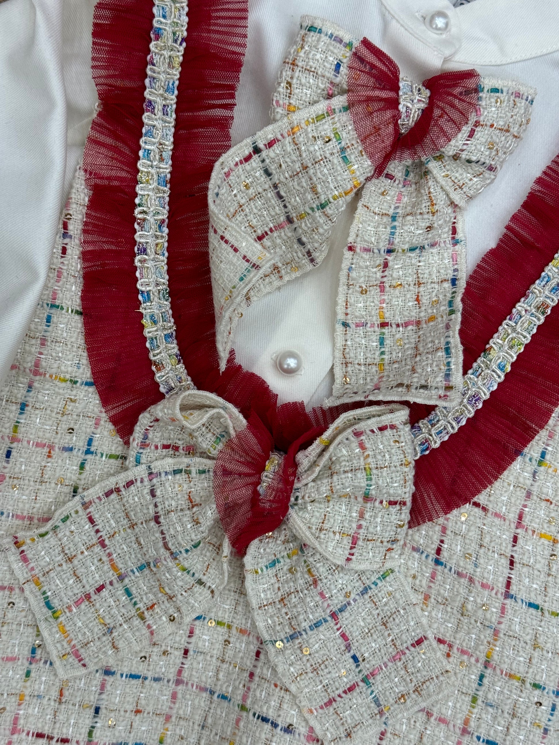 L ‘ Abito in tweed panna è intrecciata con fili colorati nei toni del rosso, blu, giallo e verde, creando un effetto luminoso e vivace. È impreziosita da un altro fiocco centrale realizzato nello stesso tessuto, arricchiti da tulle rosso e passamaneria , che conferiscono volume e romanticismo.