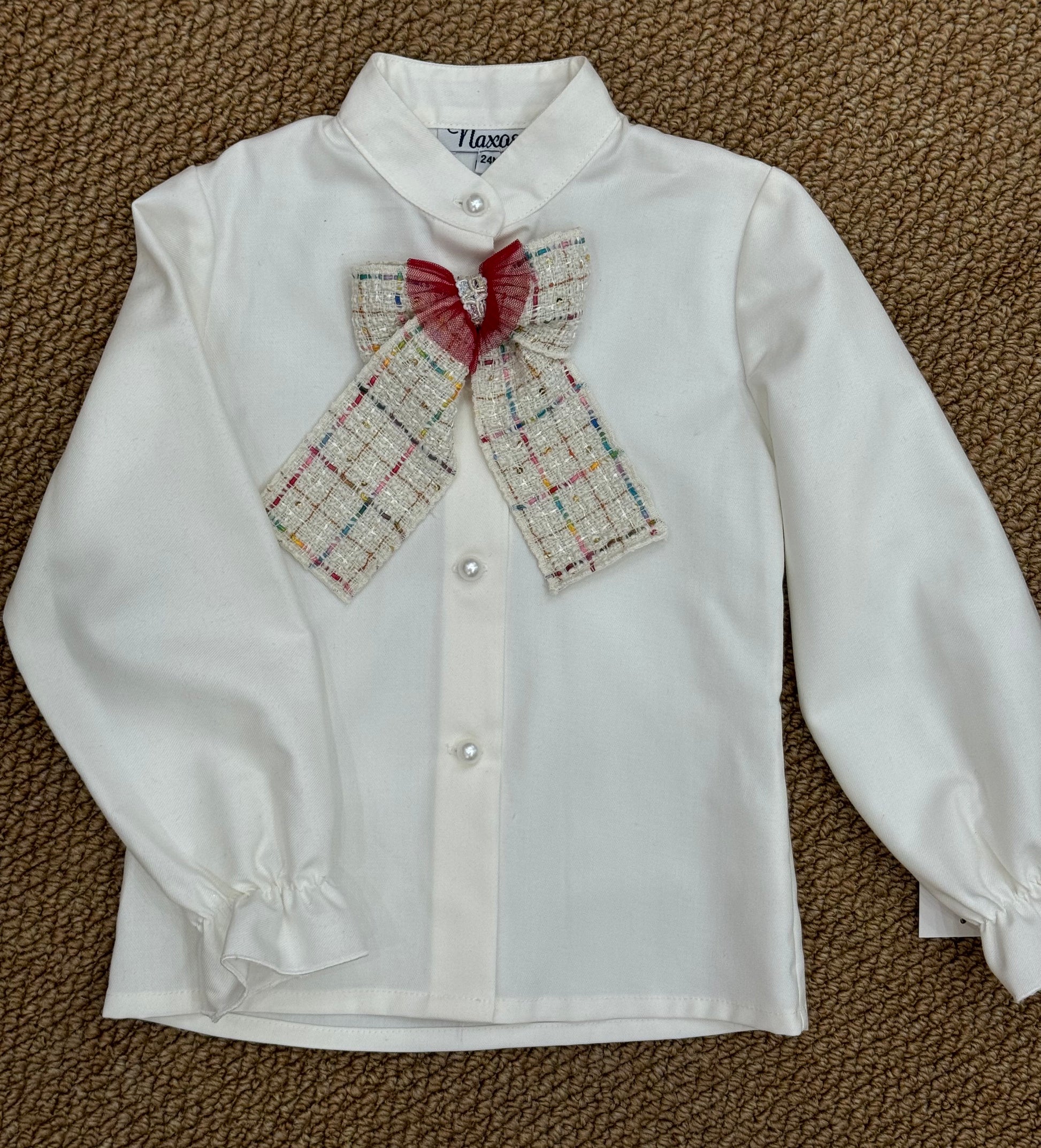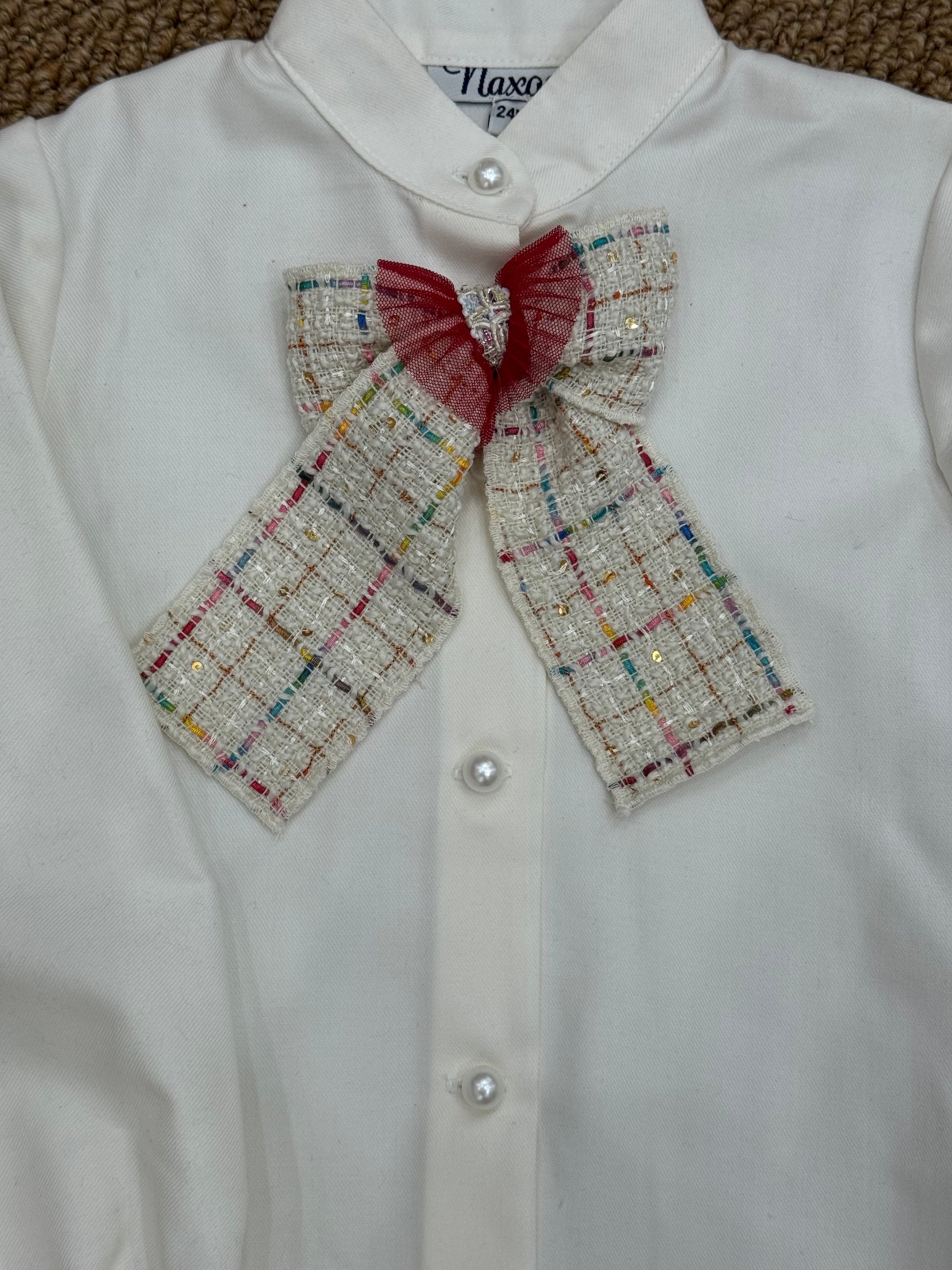 La camicia in cotone bianco presenta un colletto alla coreana con bottone perla e maniche lunghe con polsini arricciati, che donano un tocco raffinato, fiocco in tessuto tweed come l’abito.