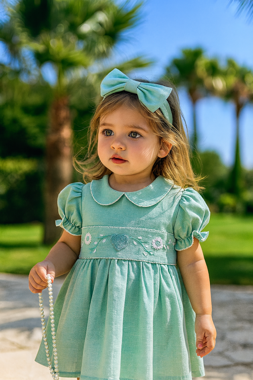 Il vestito è un delizioso abitino estivo per bambina, realizzato in un morbido tessuto cotone verde acqua chiaro dal tono fresco e raffinato.