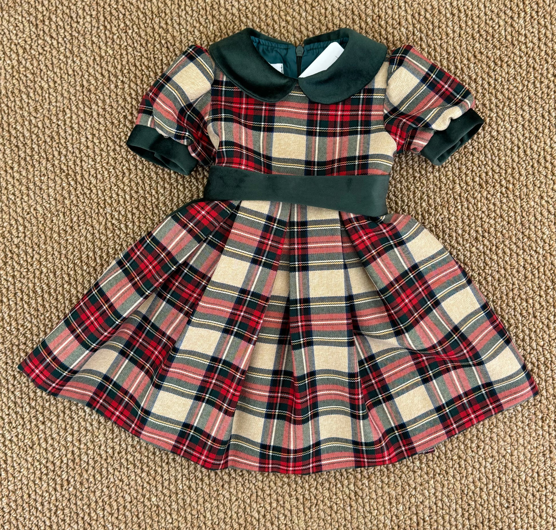 Elegante abito in tartan , ideale per le festività natalizie e le occasioni speciali. Il tessuto tartan conferisce un fascino tradizionale , arricchito da un fiocco in velluto verde che aggiunge un tocco di raffinatezza. Con le sue maniche corte e la linea svasata, questo abito assicura comfort e stile, rendendo la tua bambina protagonista di ogni momento speciale.