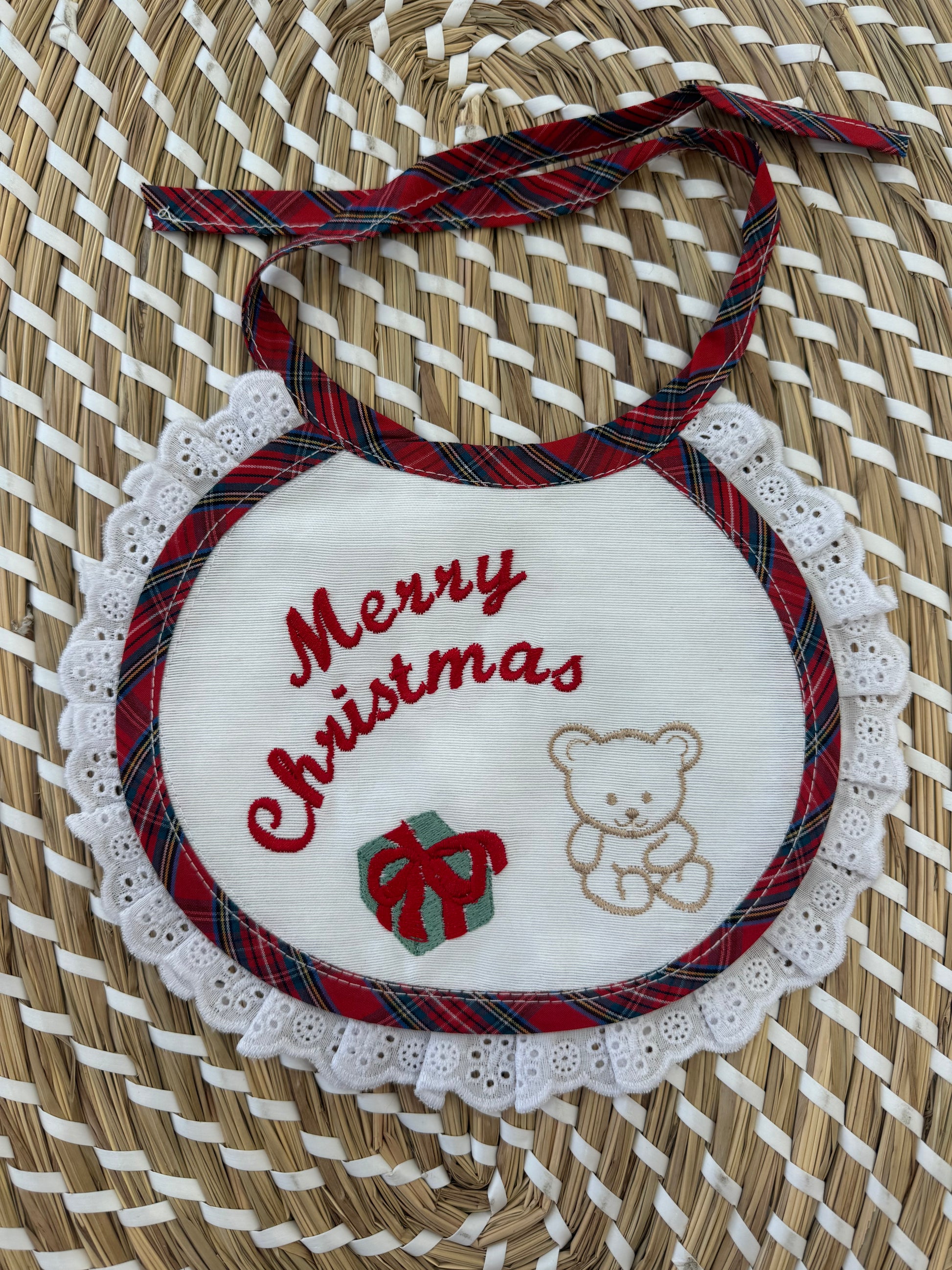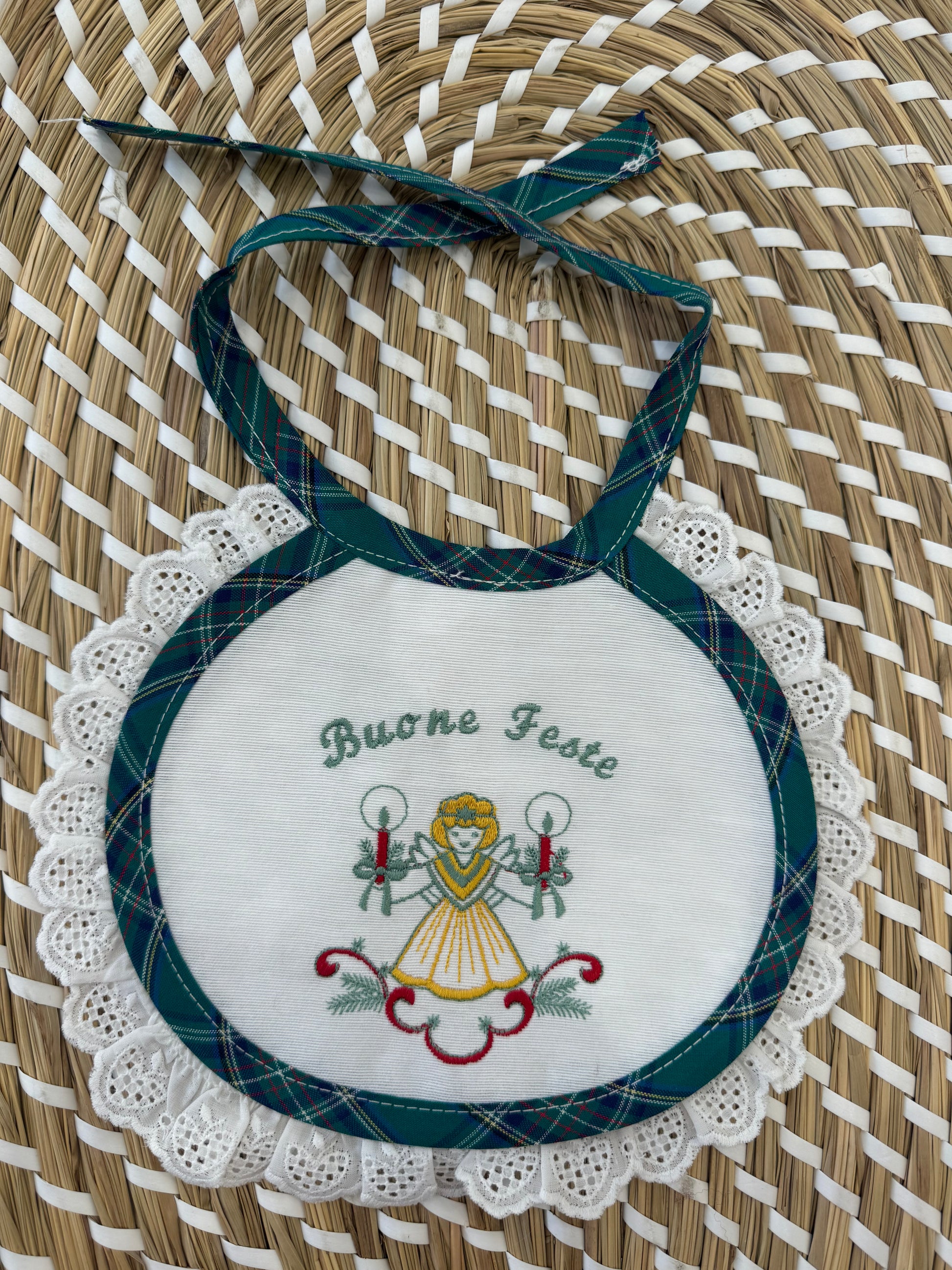 Bavetta in cotone doppio strato con ricamo tema Natalizio con passamaneria in tartan e pizzo.