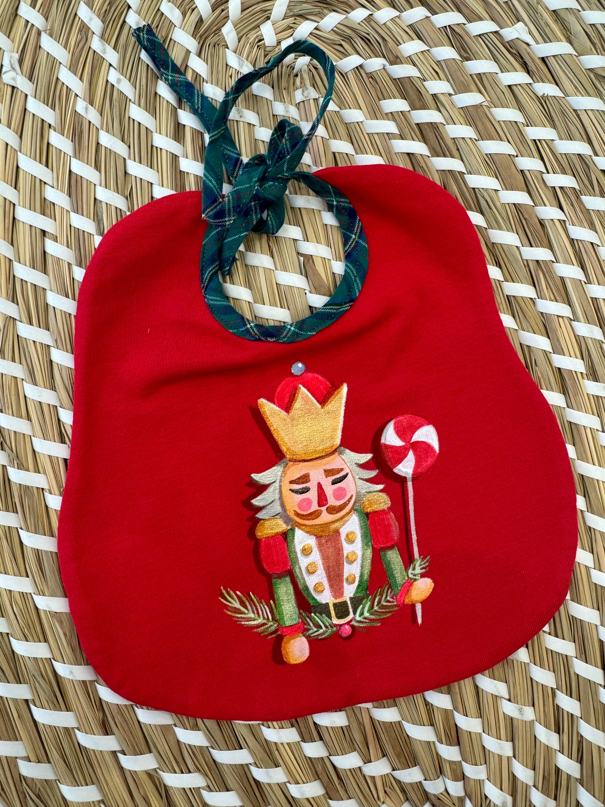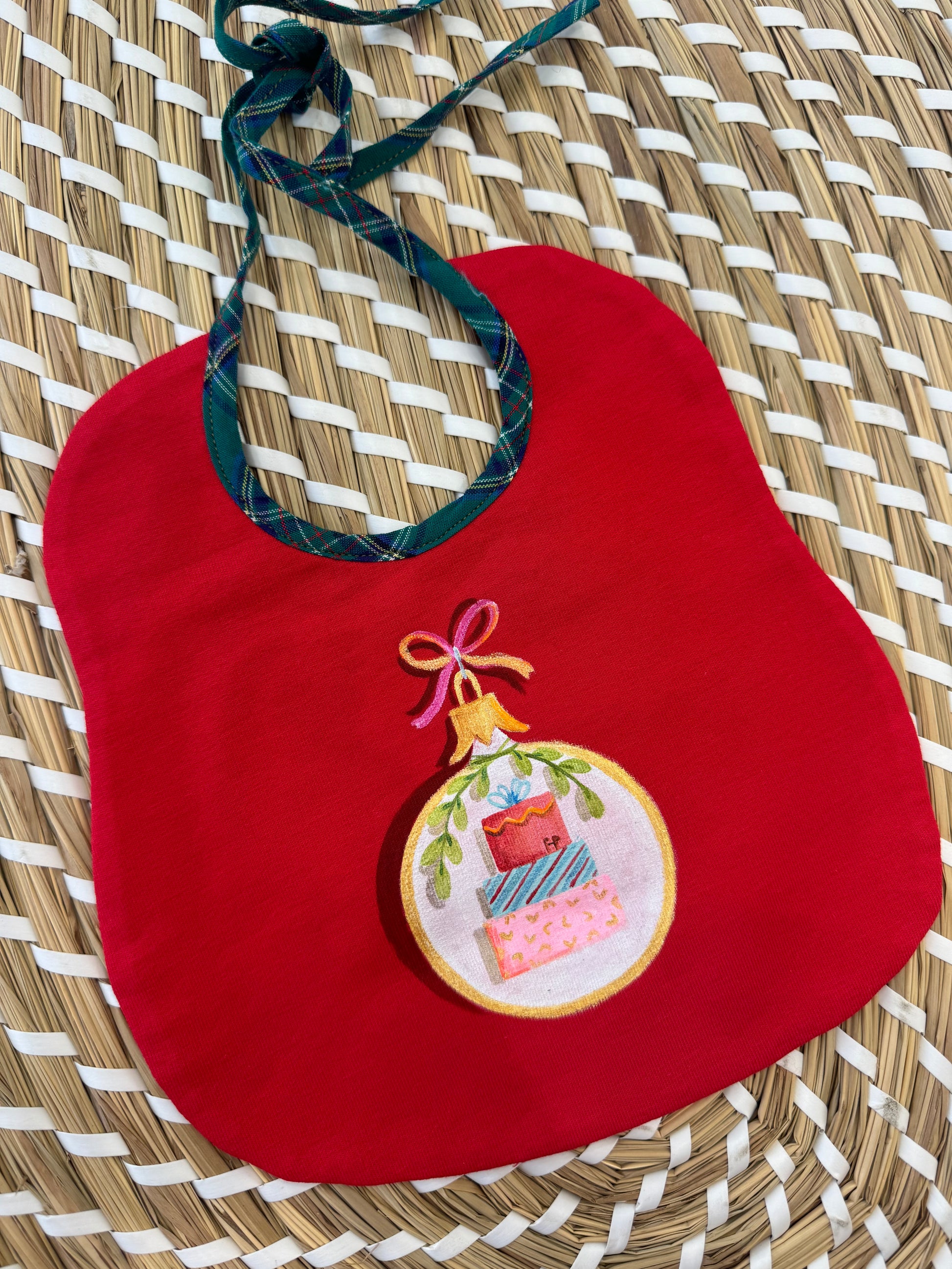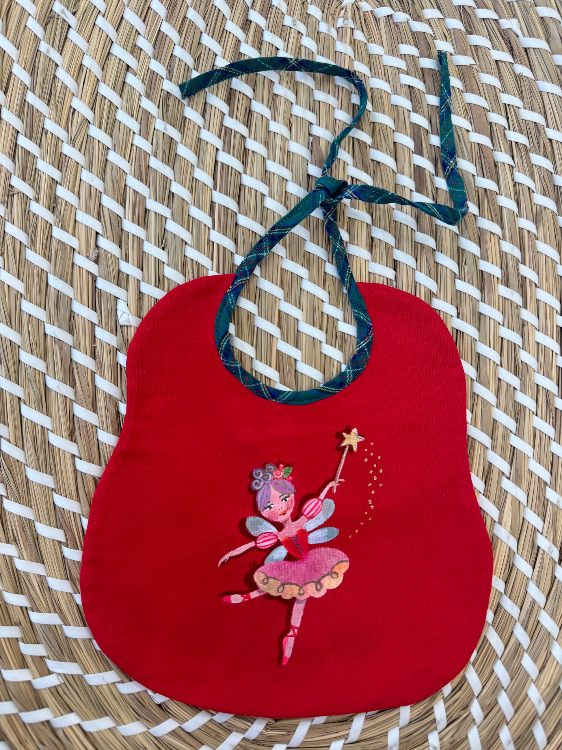 La bavetta è in tessuto rosso acceso, dalla forma arrotondata e con laccetti in fantasia scozzese verde e blu per la chiusura.