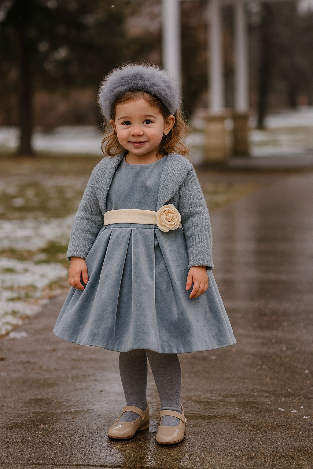 L’abito è un elegante vestitino da cerimonia invernale caratterizzato da linee raffinate e tonalità delicate.