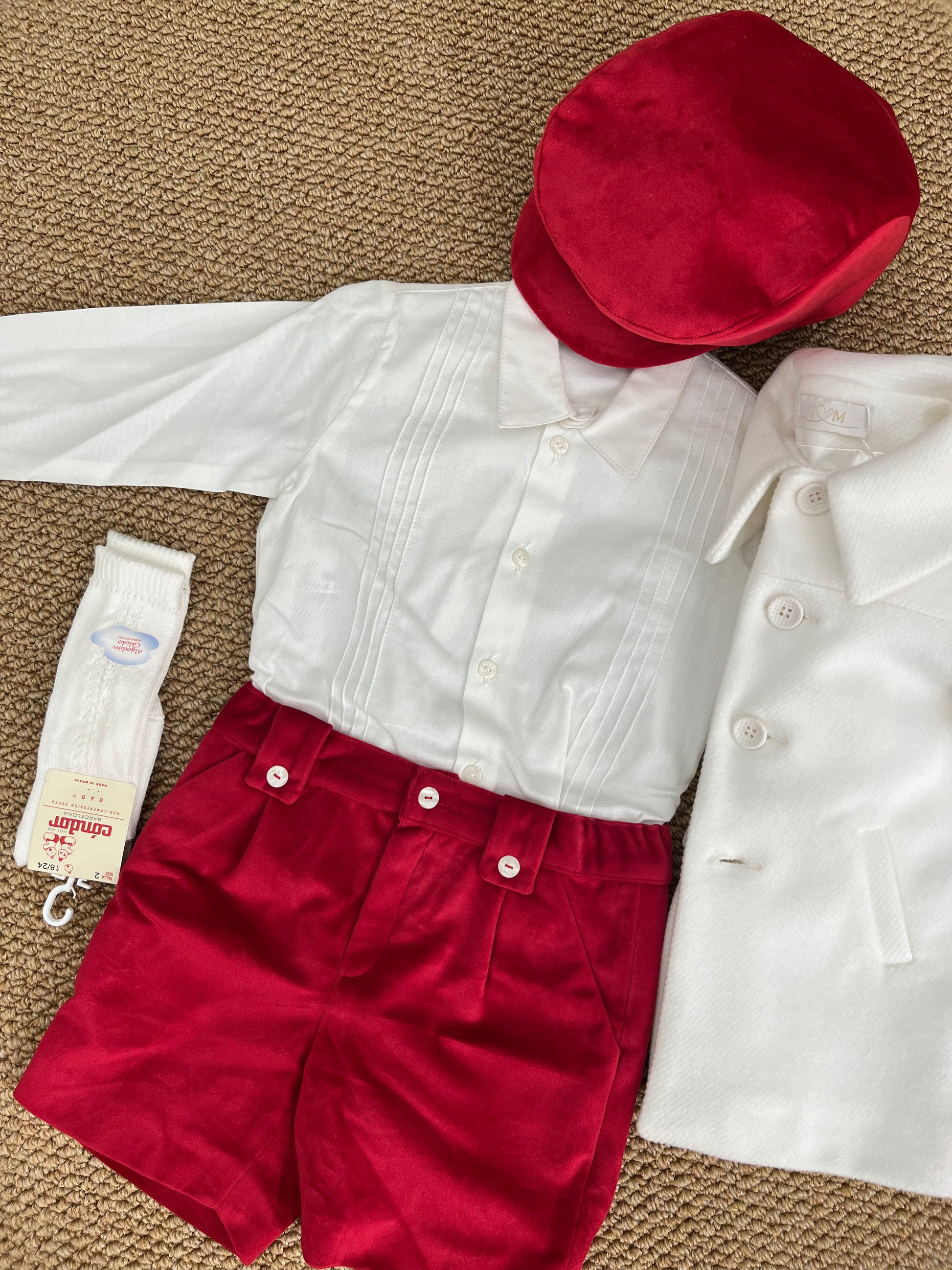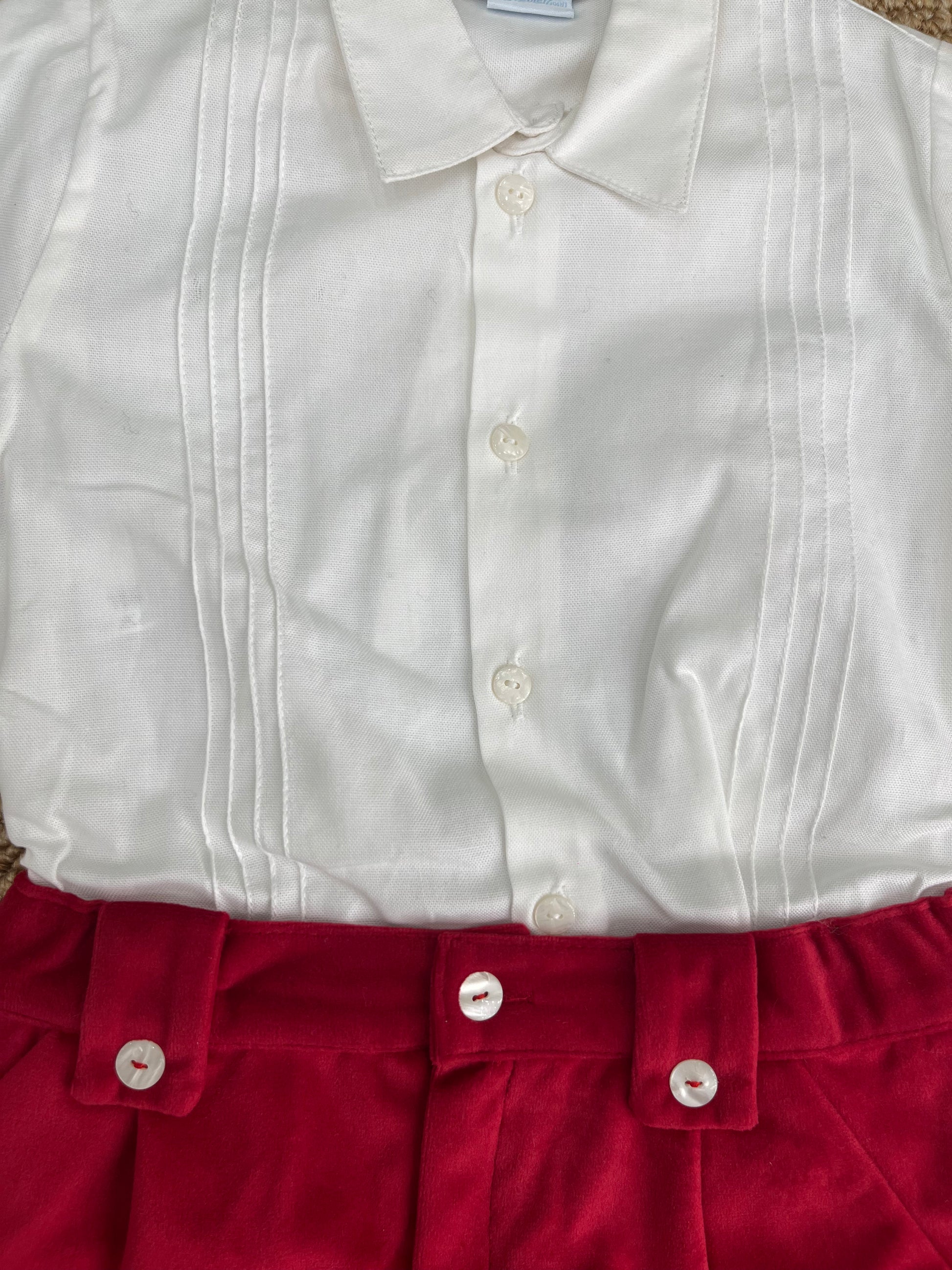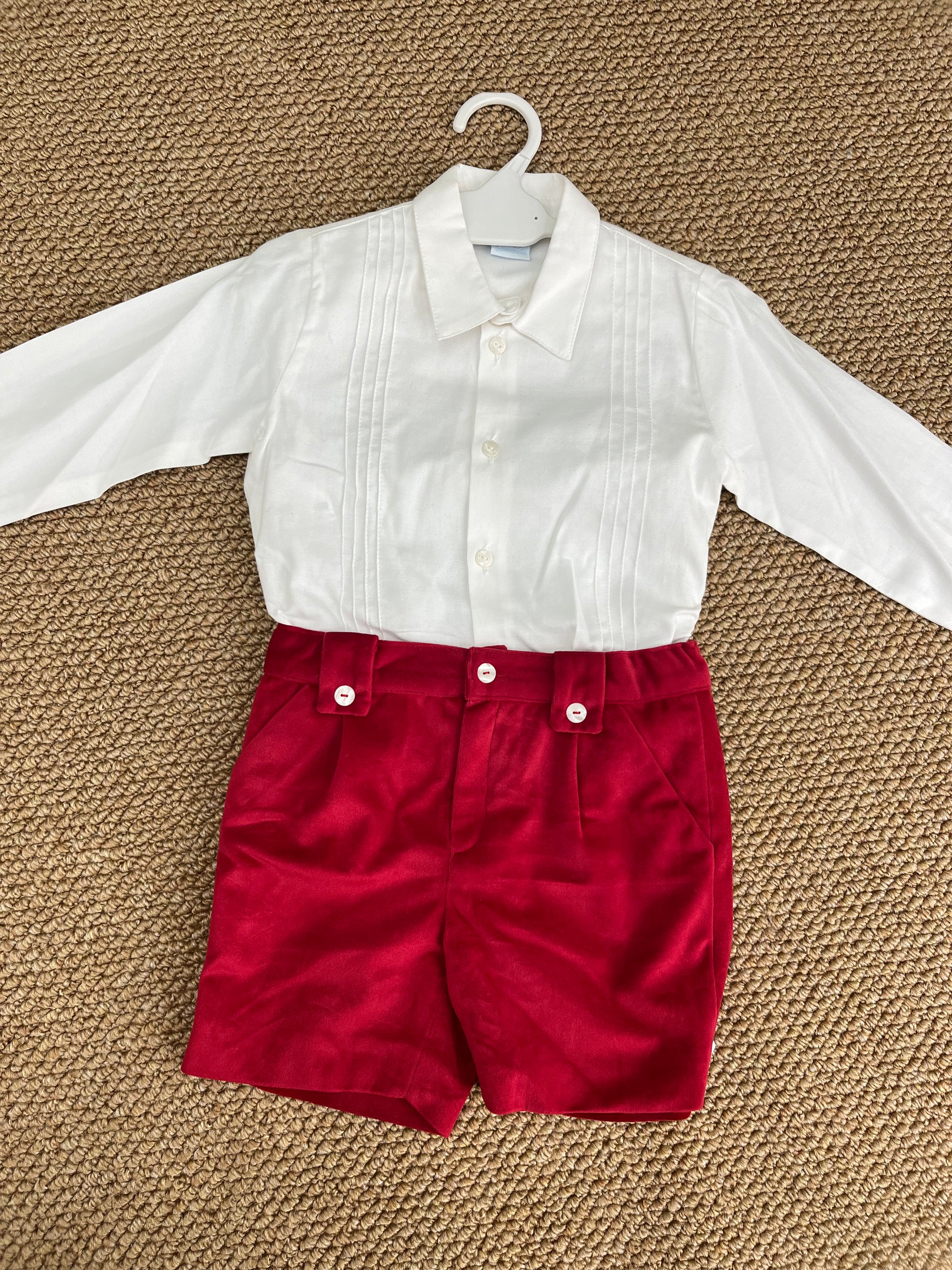 Pantaloncini: realizzati in velluto liscio rosso intenso, hanno una linea elegante e leggermente strutturata. Presentano una vita alta con passanti e due bottoni decorativi bianchi che richiamano la camicia, insieme a comode taschine laterali. Il tessuto morbido e luminoso rende il capo ideale per un look natalizio tradizionale ma confortevole.