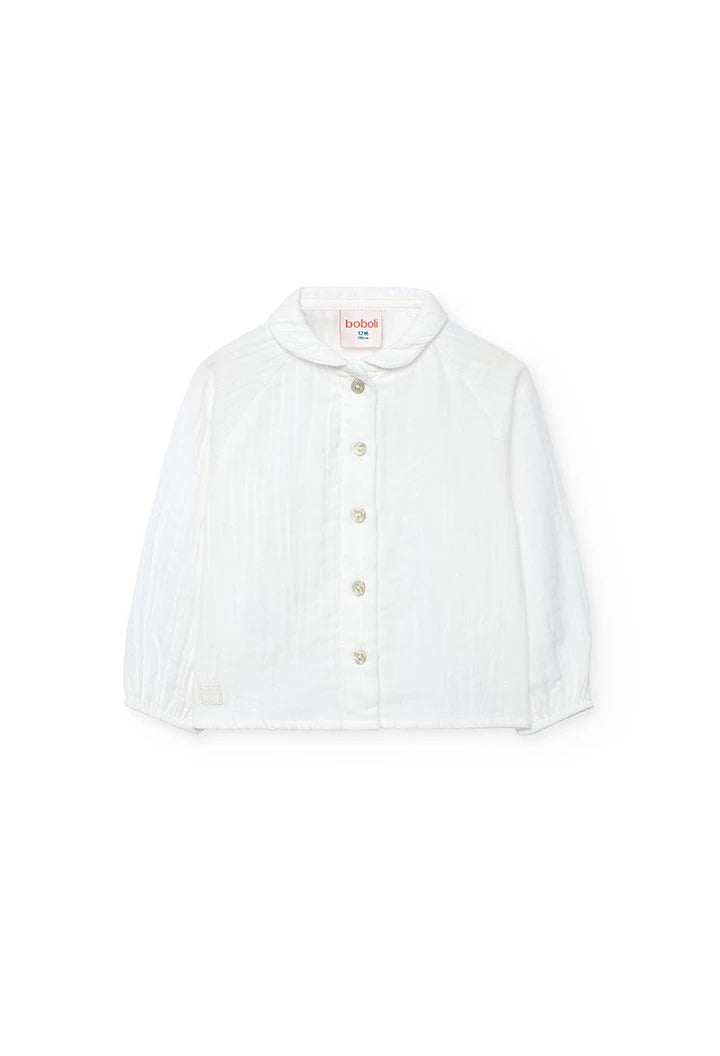 Camicia bianca per bambina, realizzata in un tessuto leggero e traspirante, ideale per le stagioni calde e garantendo comfort in ogni momento. Il design presenta un delicato scollo rotondo e piccoli bottoni sul davanti, che conferiscono uno stile classico e raffinato.