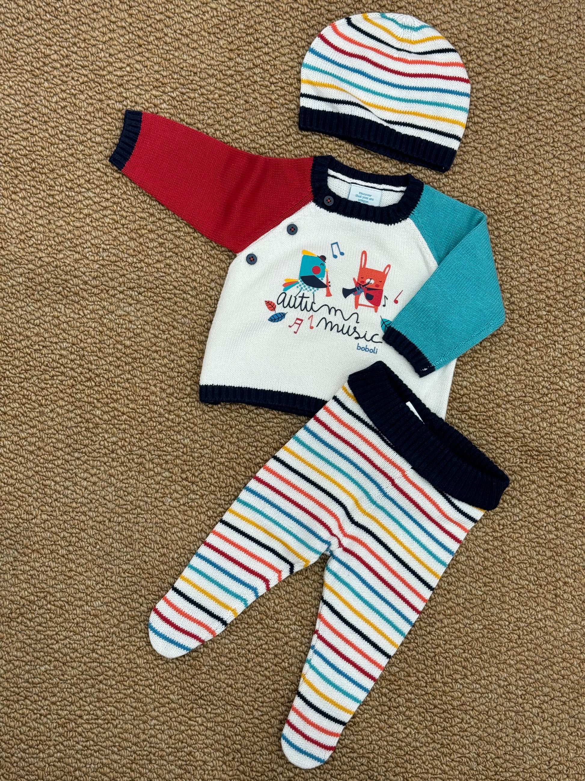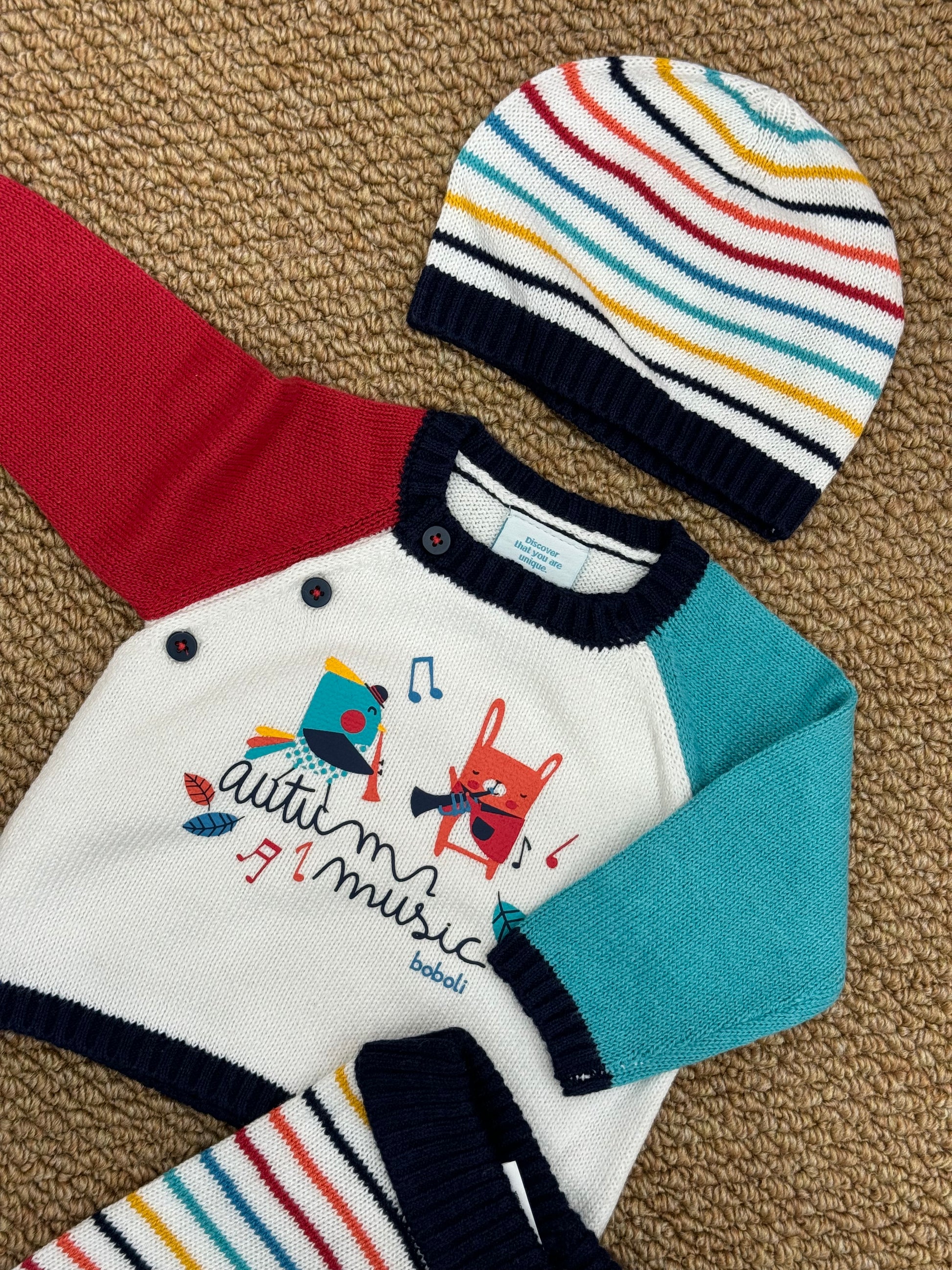 Questo completo in maglia firmato Boboli è allegro e colorato, perfetto per la stagione autunnale e per i primi freddi.