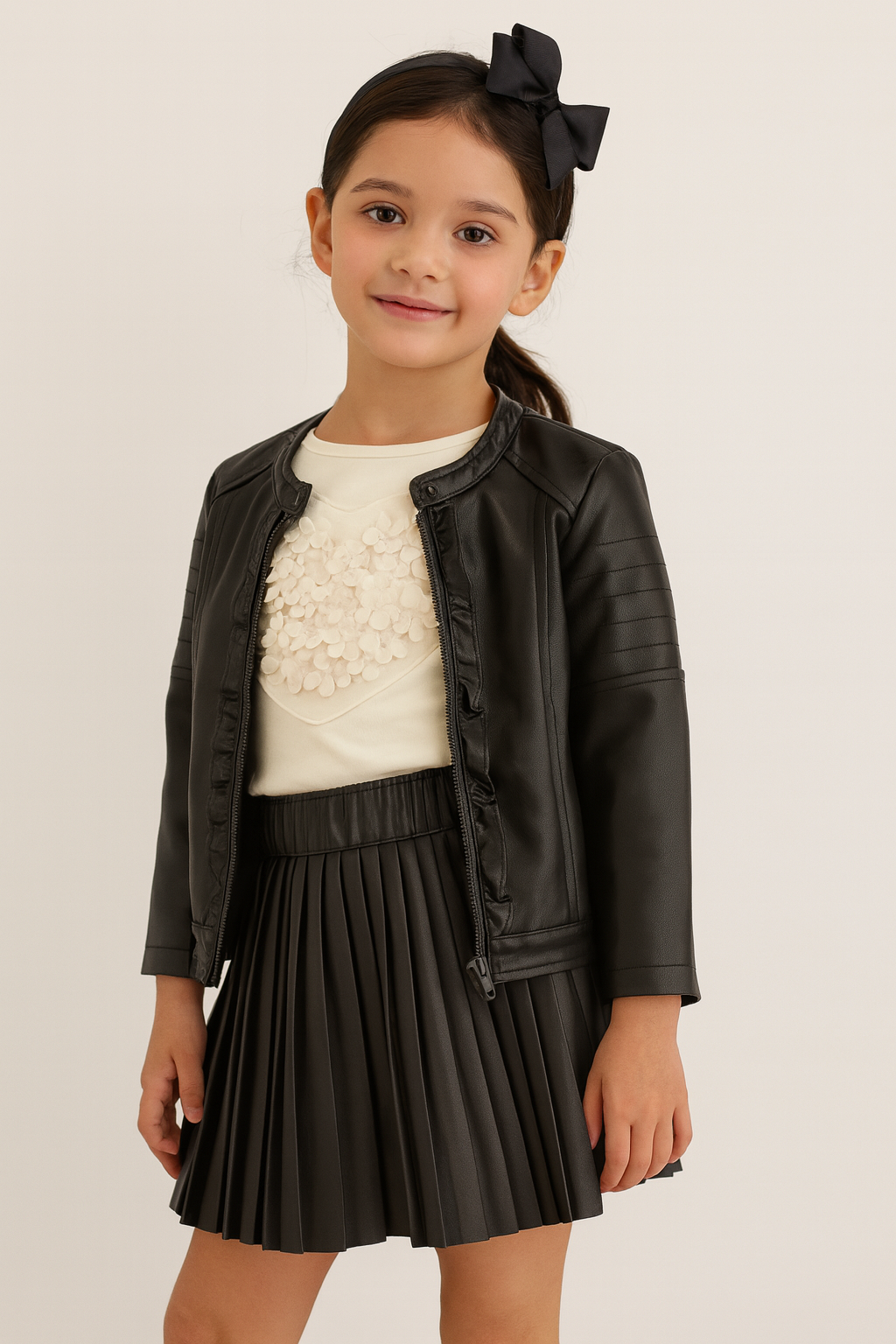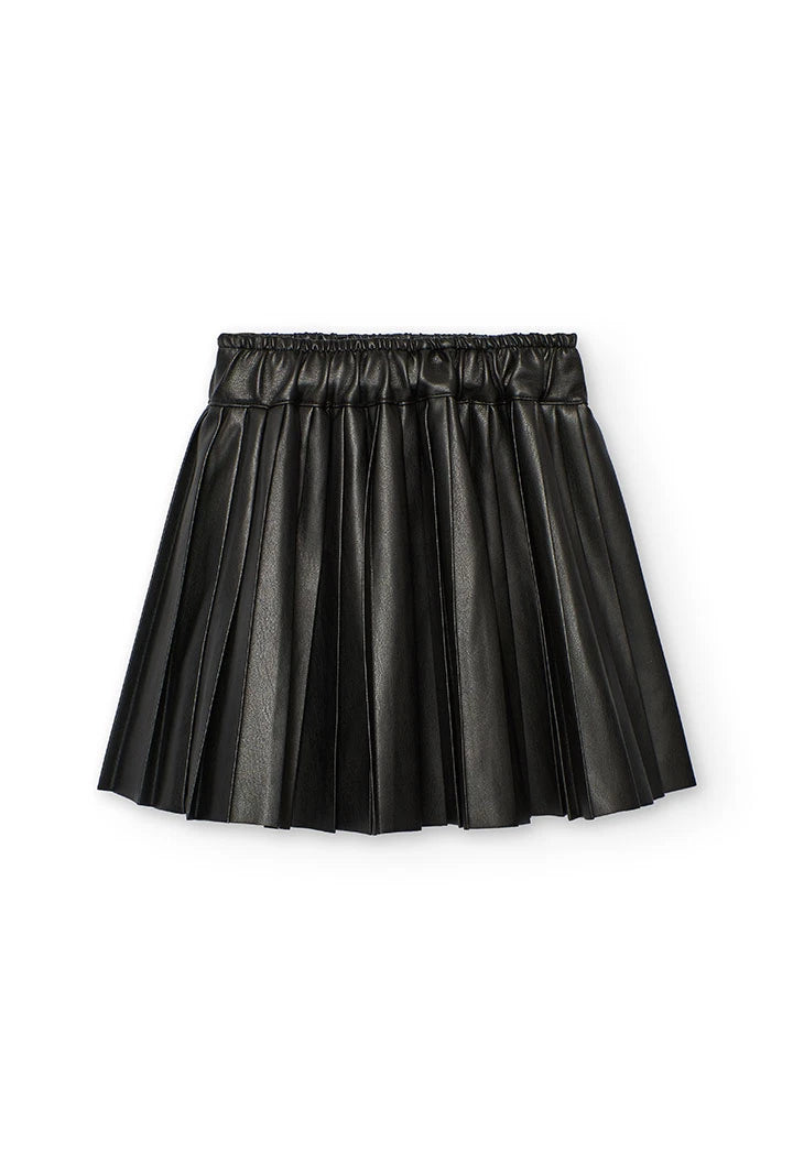 Gonna in similpelle nera, ideale per bambine durante la stagione autunnale e invernale. Realizzata in materiale sintetico con un attraente finitura lucida, si distingue per il suo stile contemporaneo ed elegante. Il design plissettato offre un movimento fluido, mentre la cintura elastica garantisce una vestibilità comoda e sicura. Il suo colore nero versatile permette di abbinarla facilmente con bluse, maglioni e cappotti, offrendo molteplici opzioni di stile.