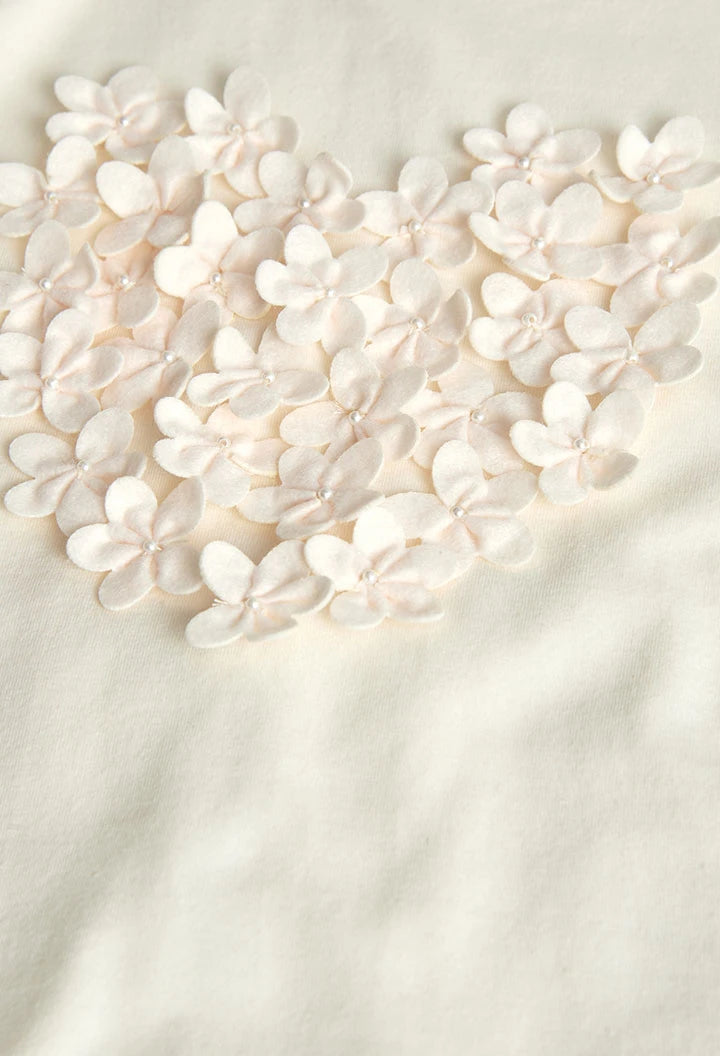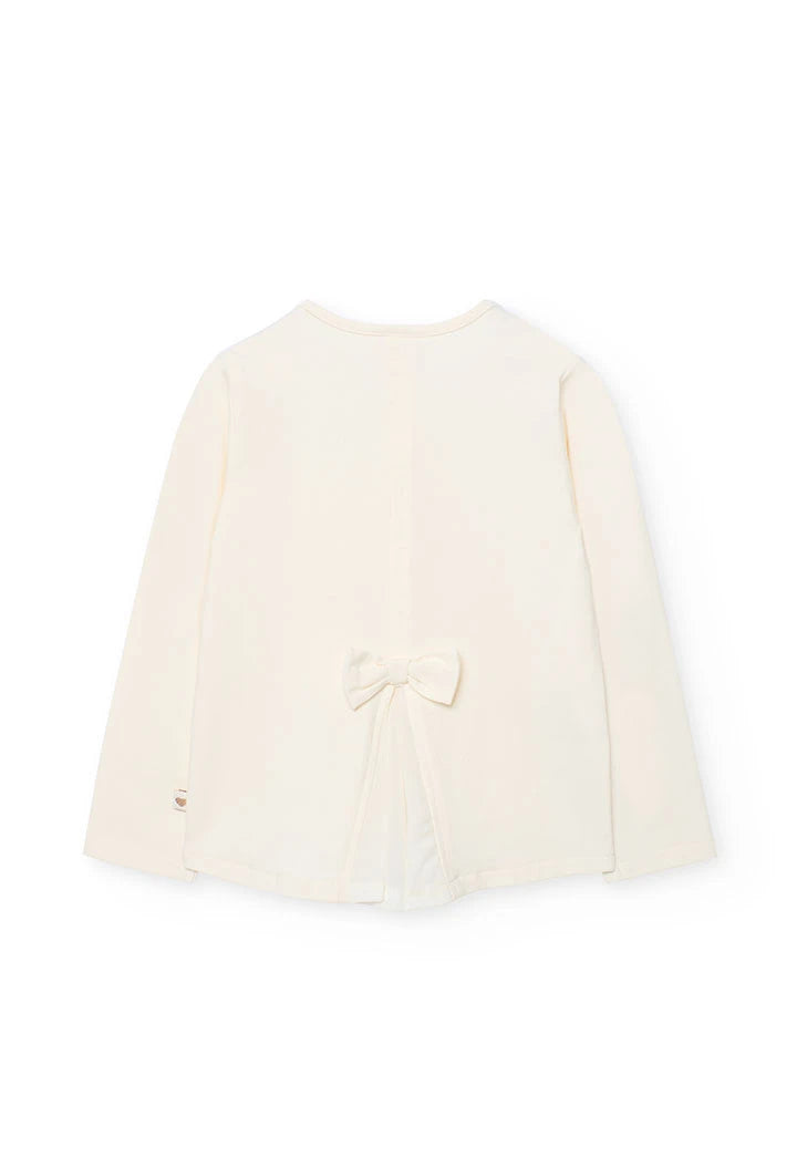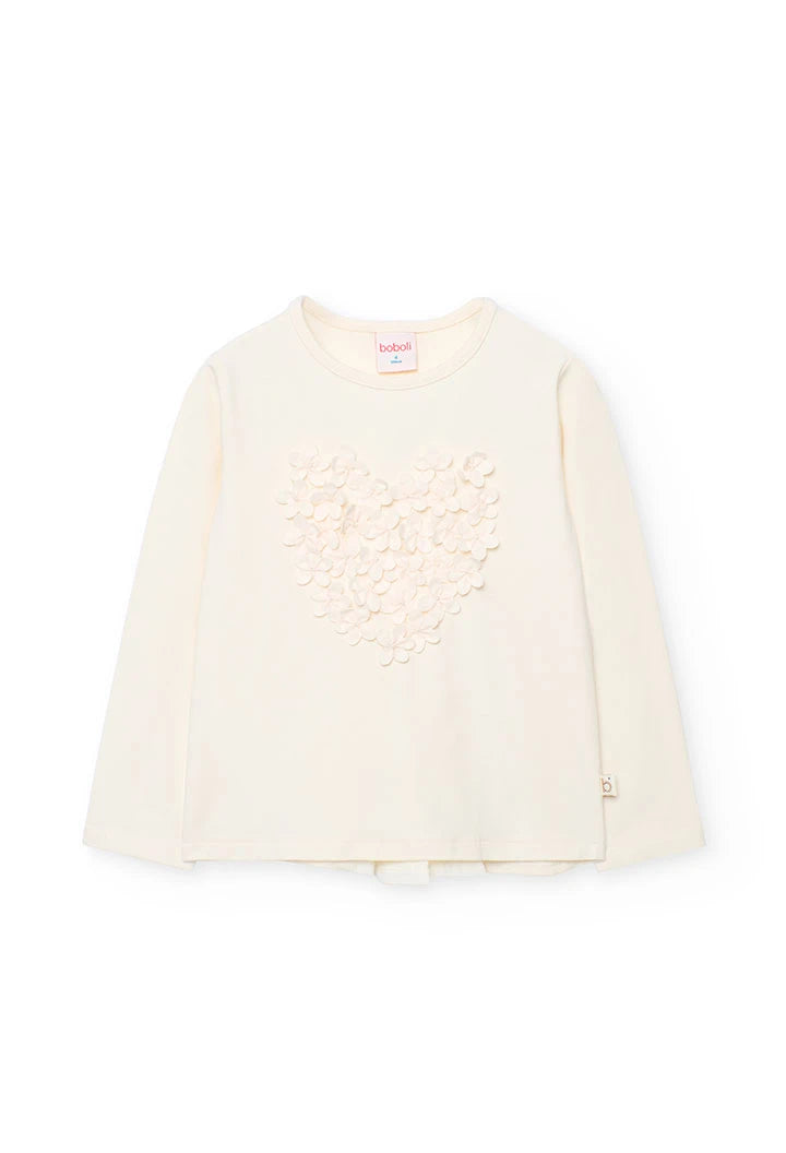 Maglietta in maglia per bambina in colore grezzo, ideale per le stagioni autunnali e invernali grazie al suo tessuto morbido che offre comfort e calore. Decorata con delicati applicazioni floreali sul davanti, aggiunge un tocco affascinante al guardaroba infantile. Il design a maniche lunghe e collo rotondo assicura una vestibilità facile e confortevole.