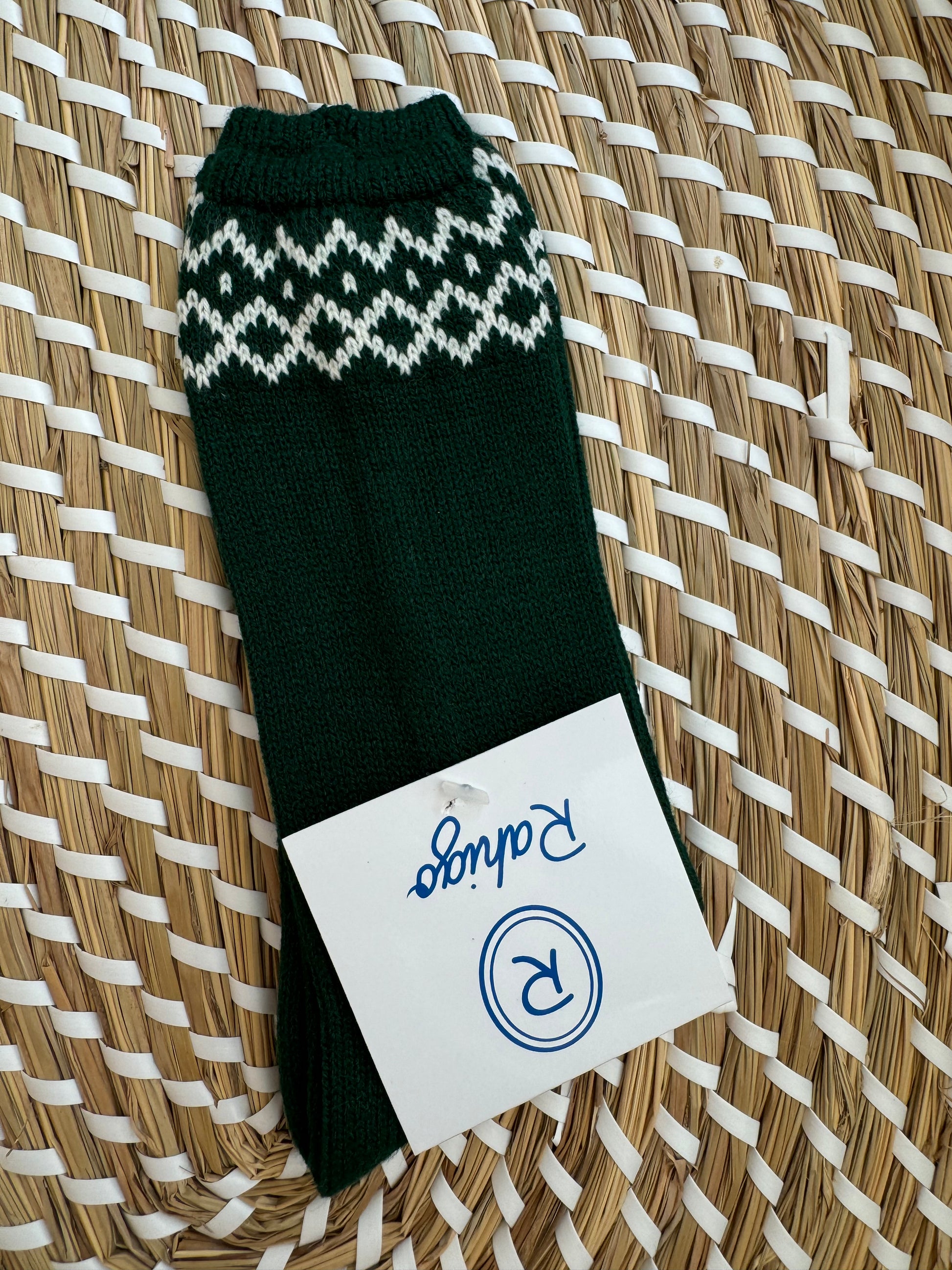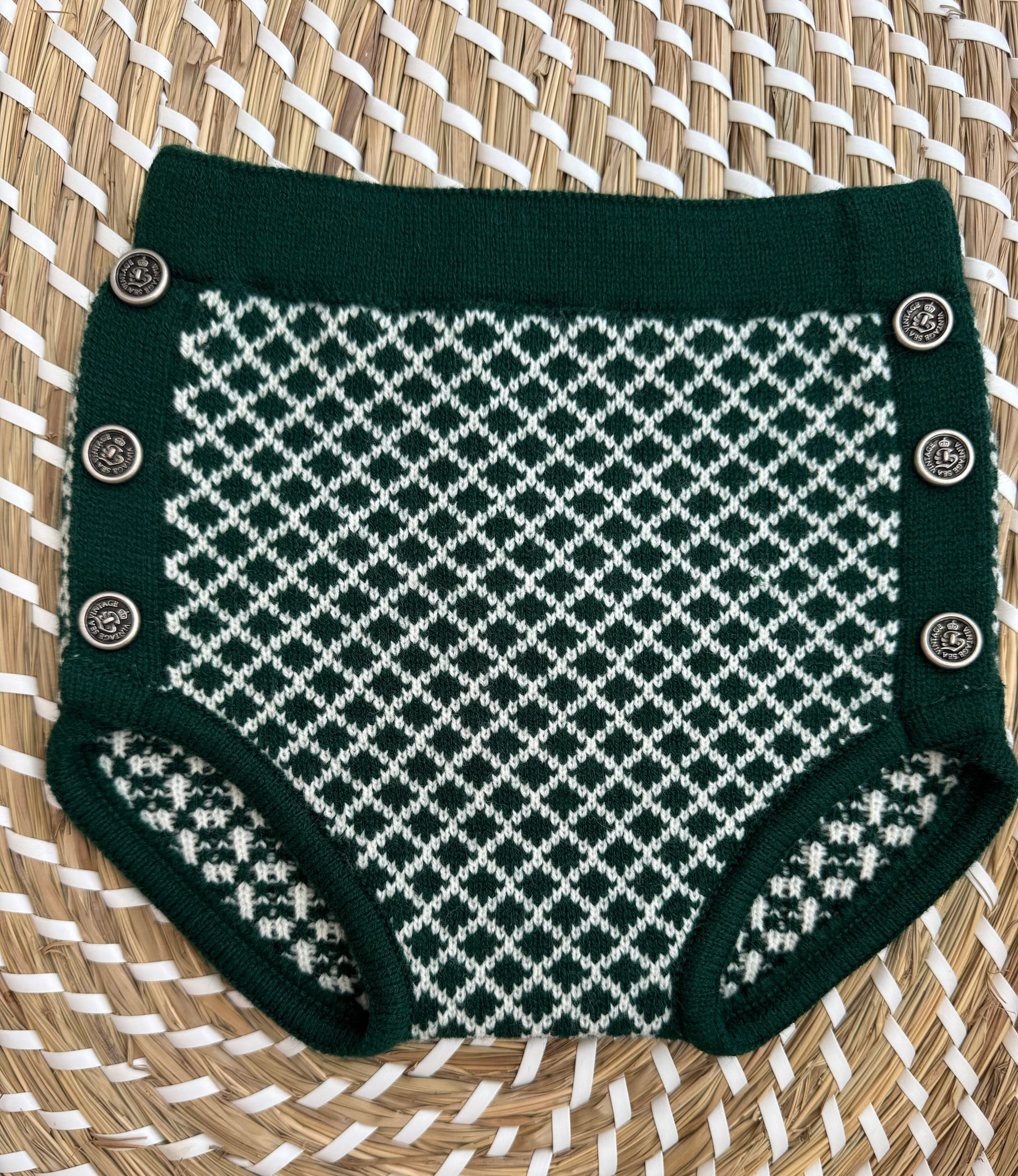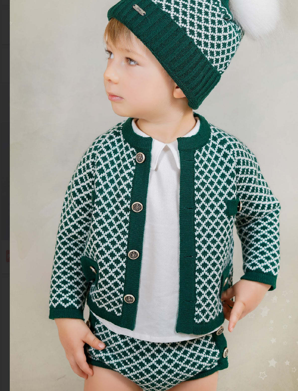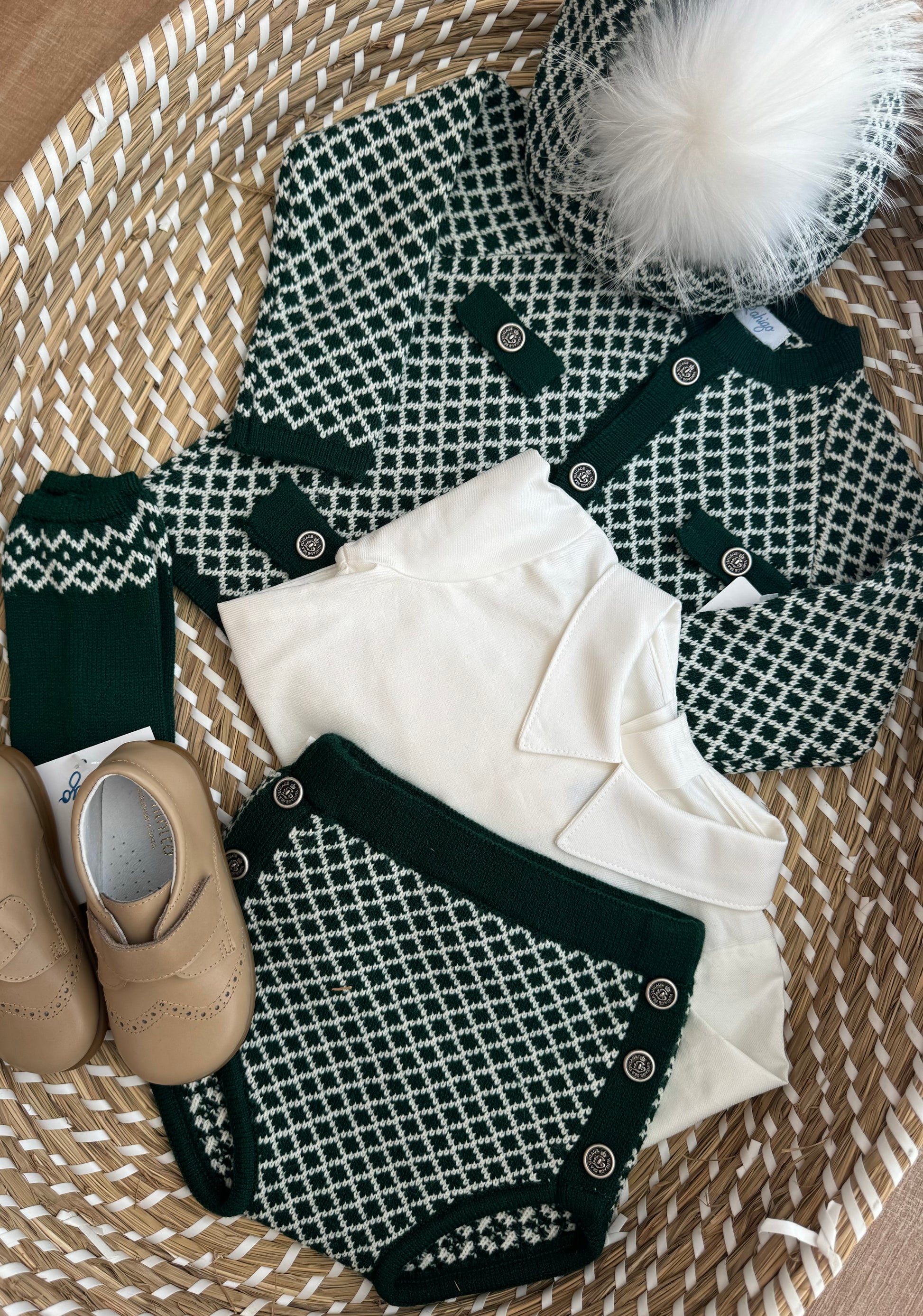 Completo composto da 4 pezzi: cardigan,camicia, culottina e calzini tutto in calda maglia in verde avete e fantasia rombi.