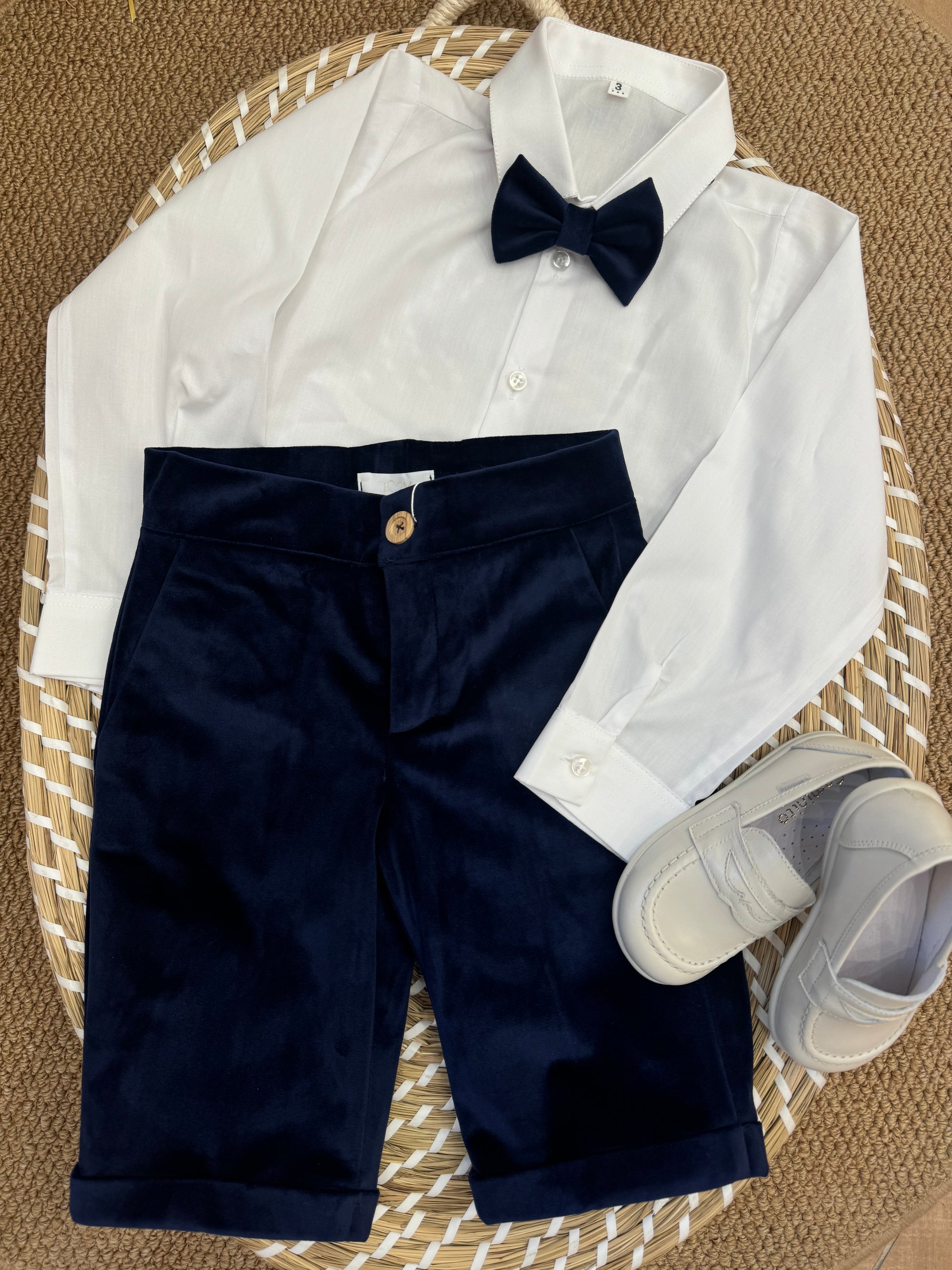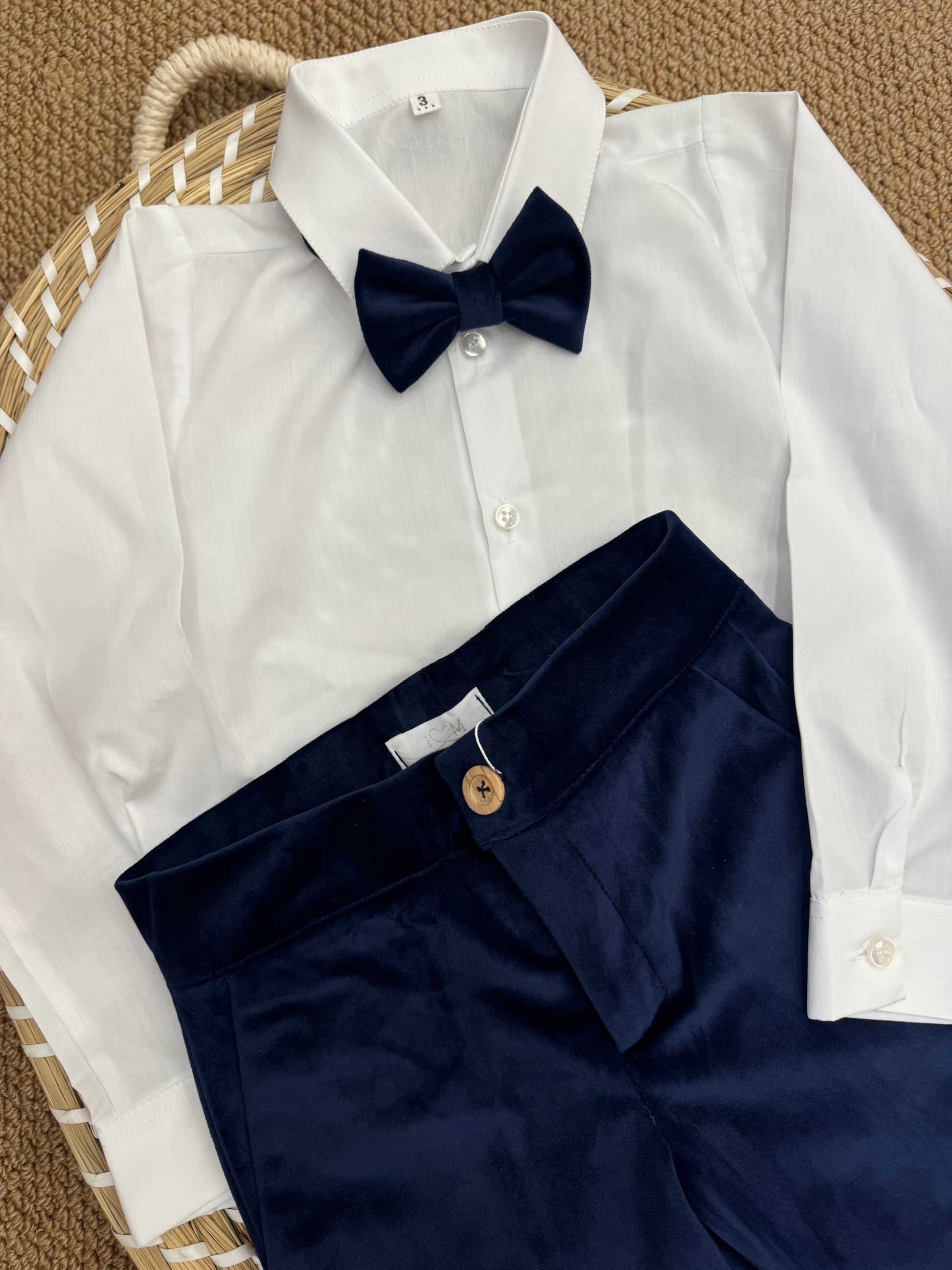 - Completata da un papillon in velluto liscio blu notte, che aggiunge un tocco di sofisticata eleganza. Pantaloni stile