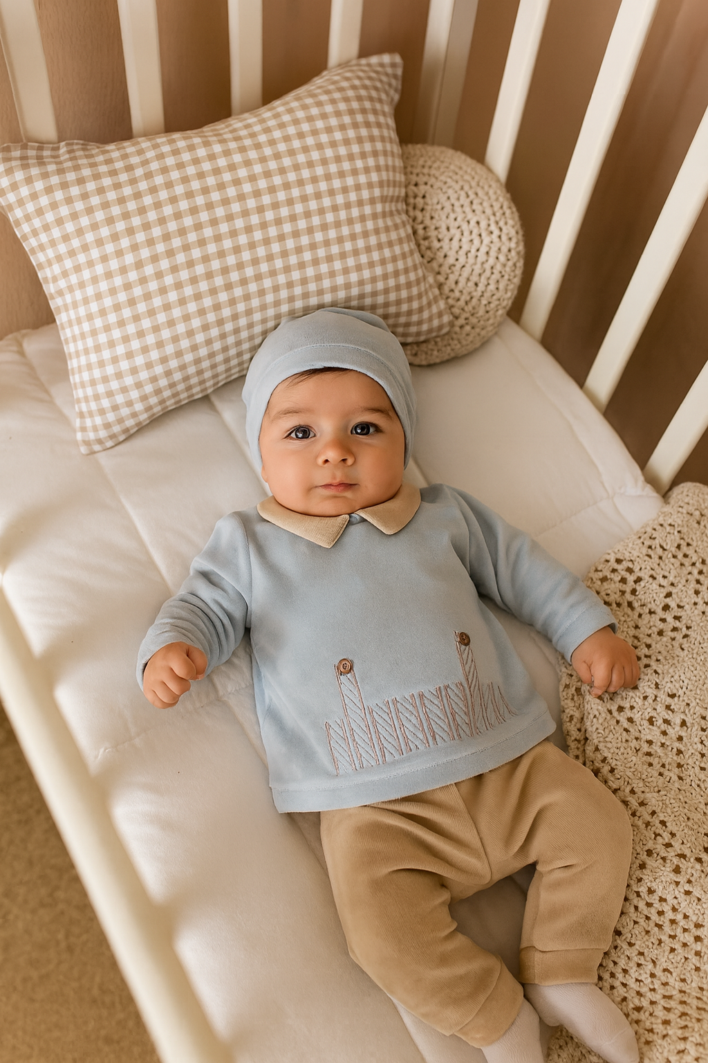 Cappellino In ciniglia azzurro come la parte superiore, dal design semplice e avvolgente, perfetto per proteggere la testolina del neonato.