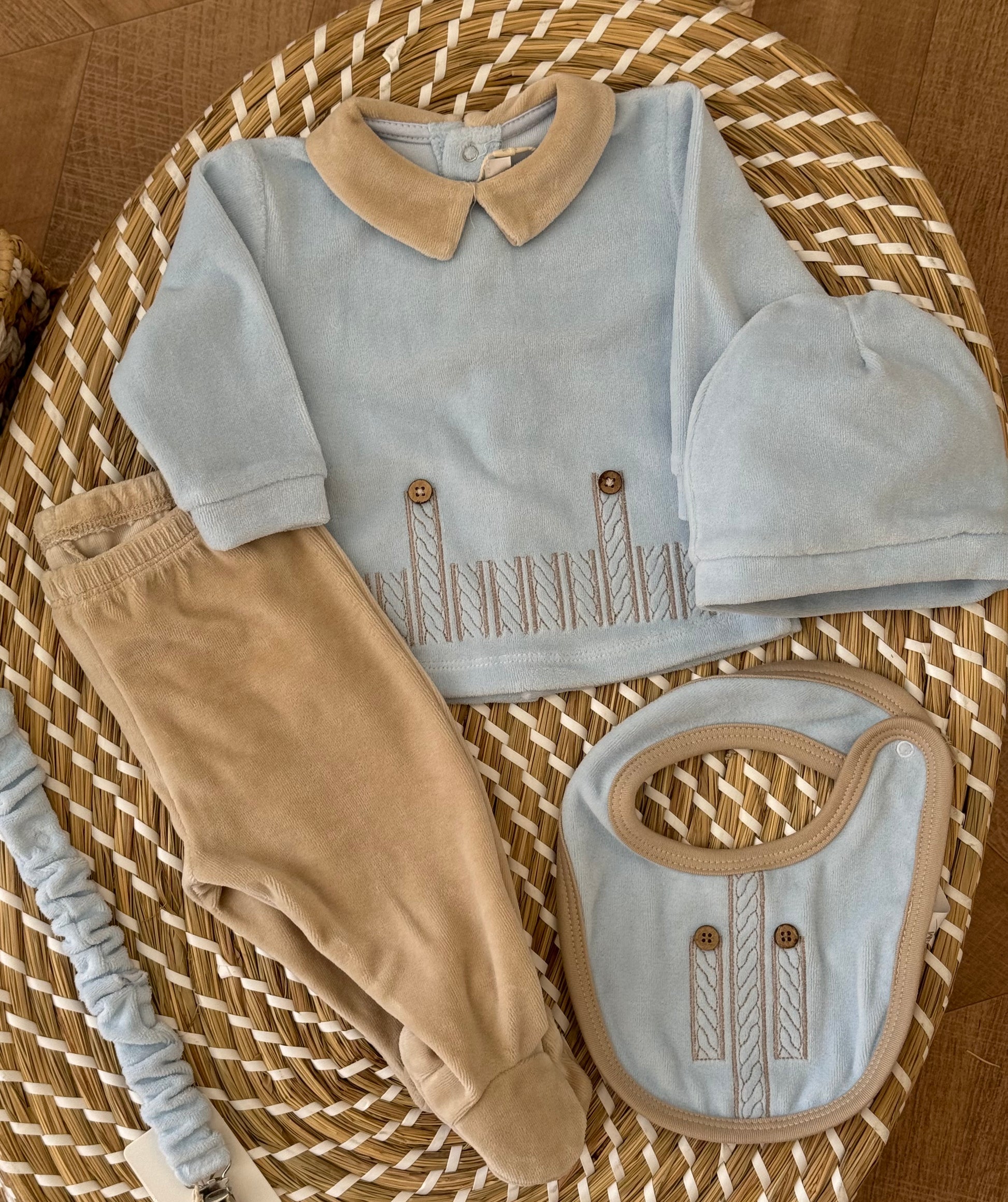 Bavetta : Abbinata al completo, in azzurro e beige con le stesse decorazioni e bottoncini , chiusura laterale con automatico.