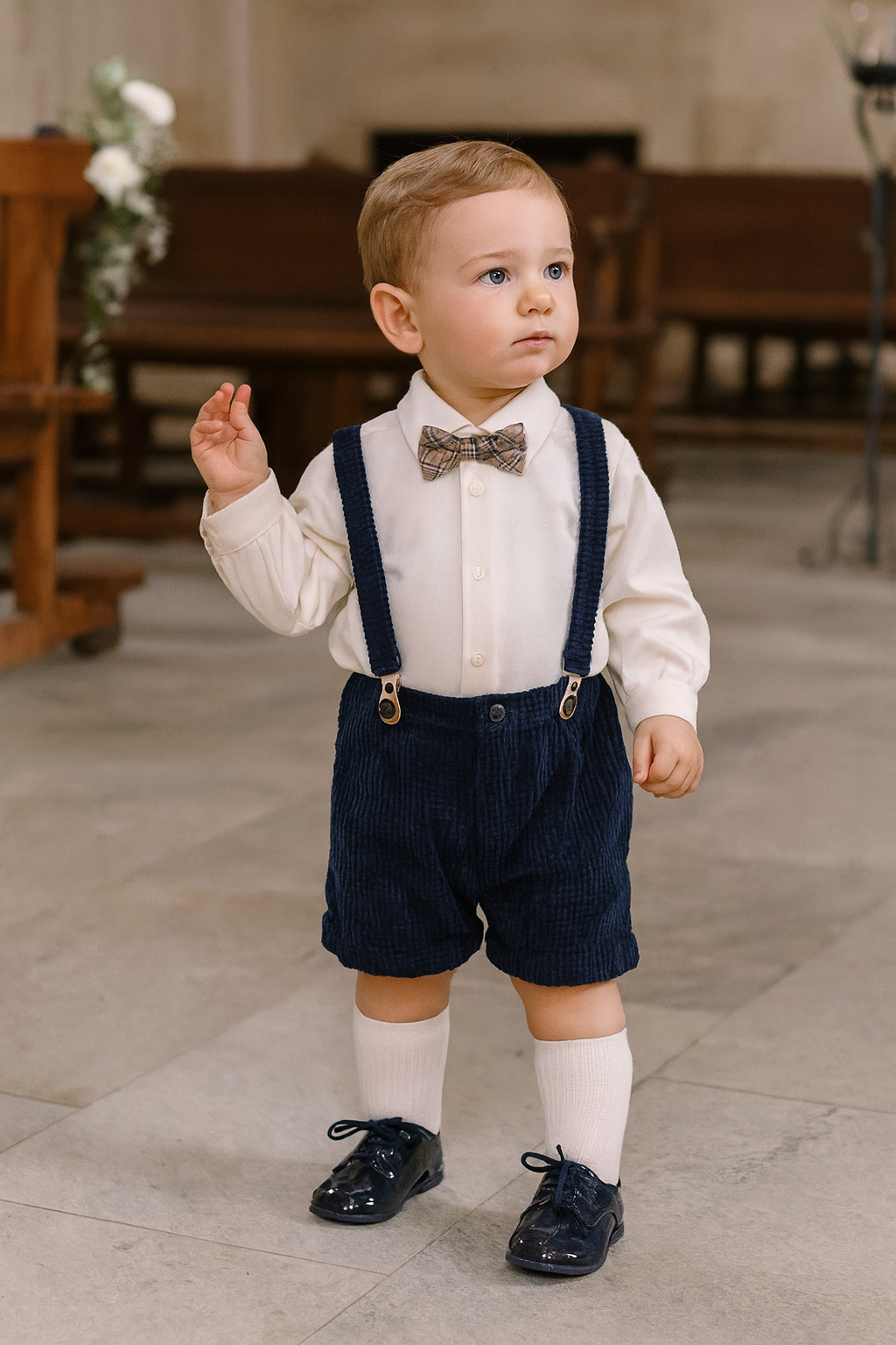 Completo composto da camicia in caldo cotone con papillon fantasia quadri e il pantalone in blu notte a coste in velluto con bretelle.