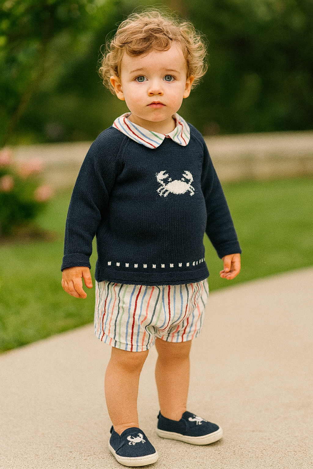 Il completo è un delizioso outfit estivo per bambino, dal gusto marinaro e raffinato.