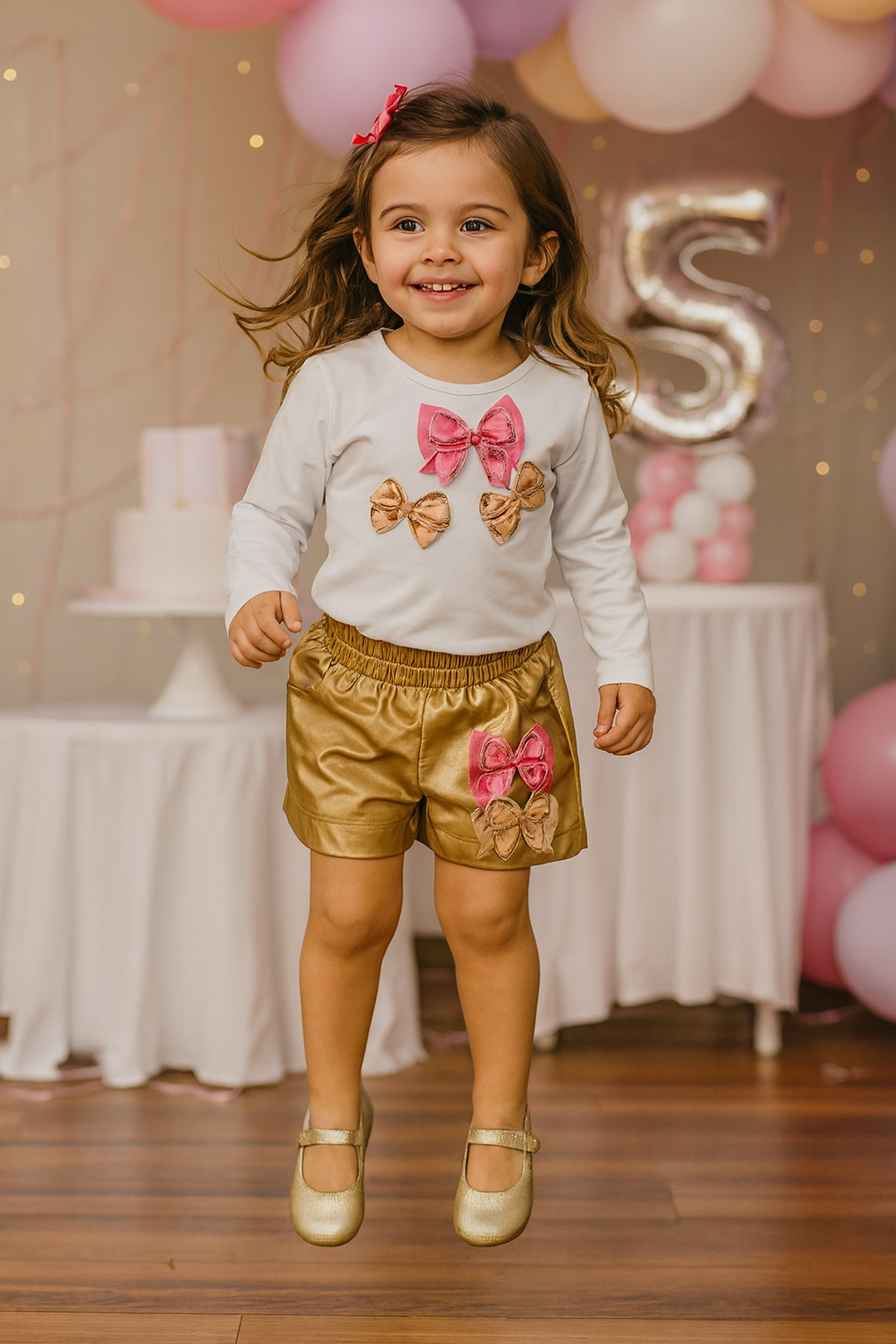 Completo t shirt bianca manica lunga in cotone con applicazioni in rilievo, short in ecopelle dorata con applicazioni in rilievo