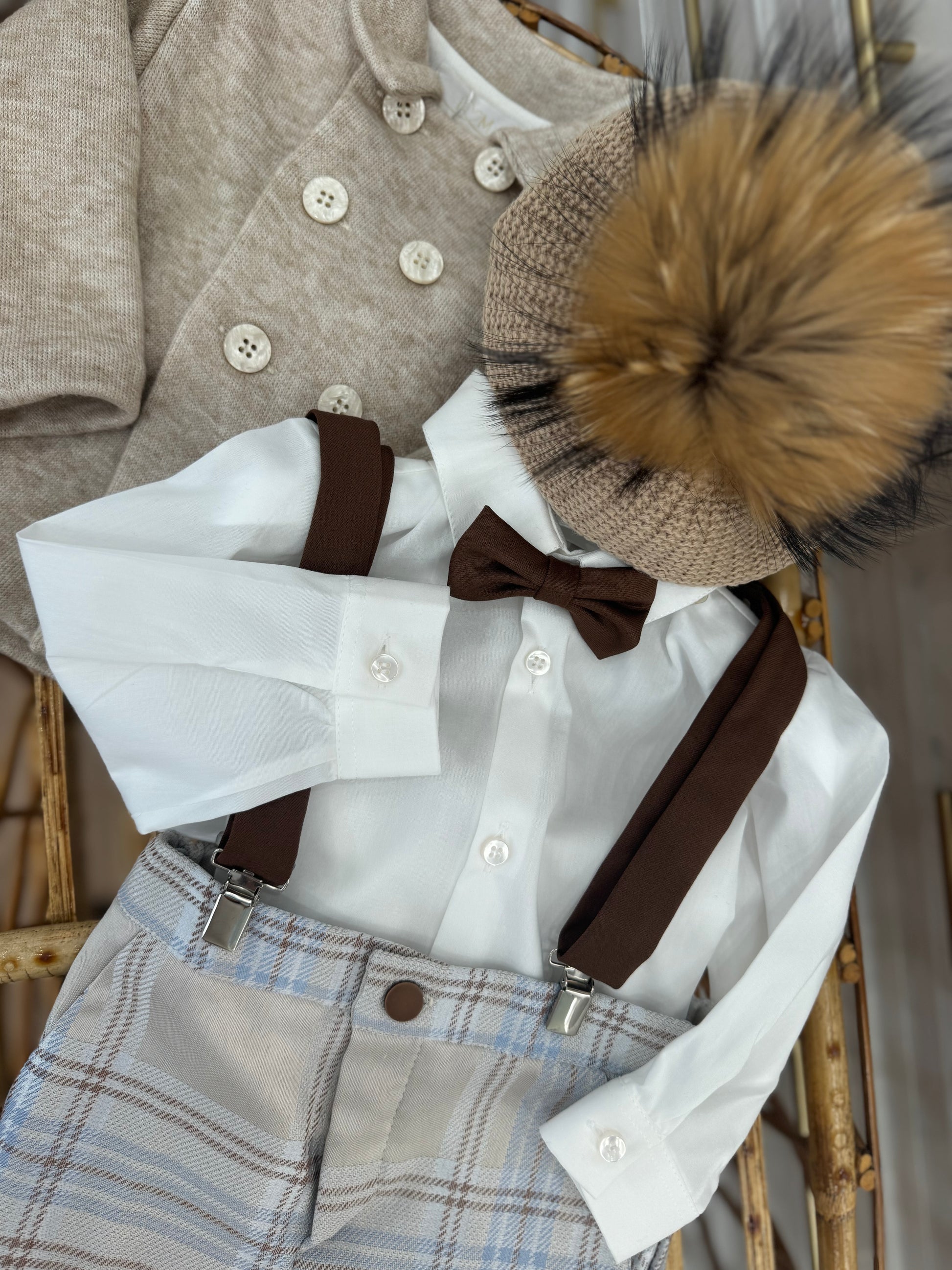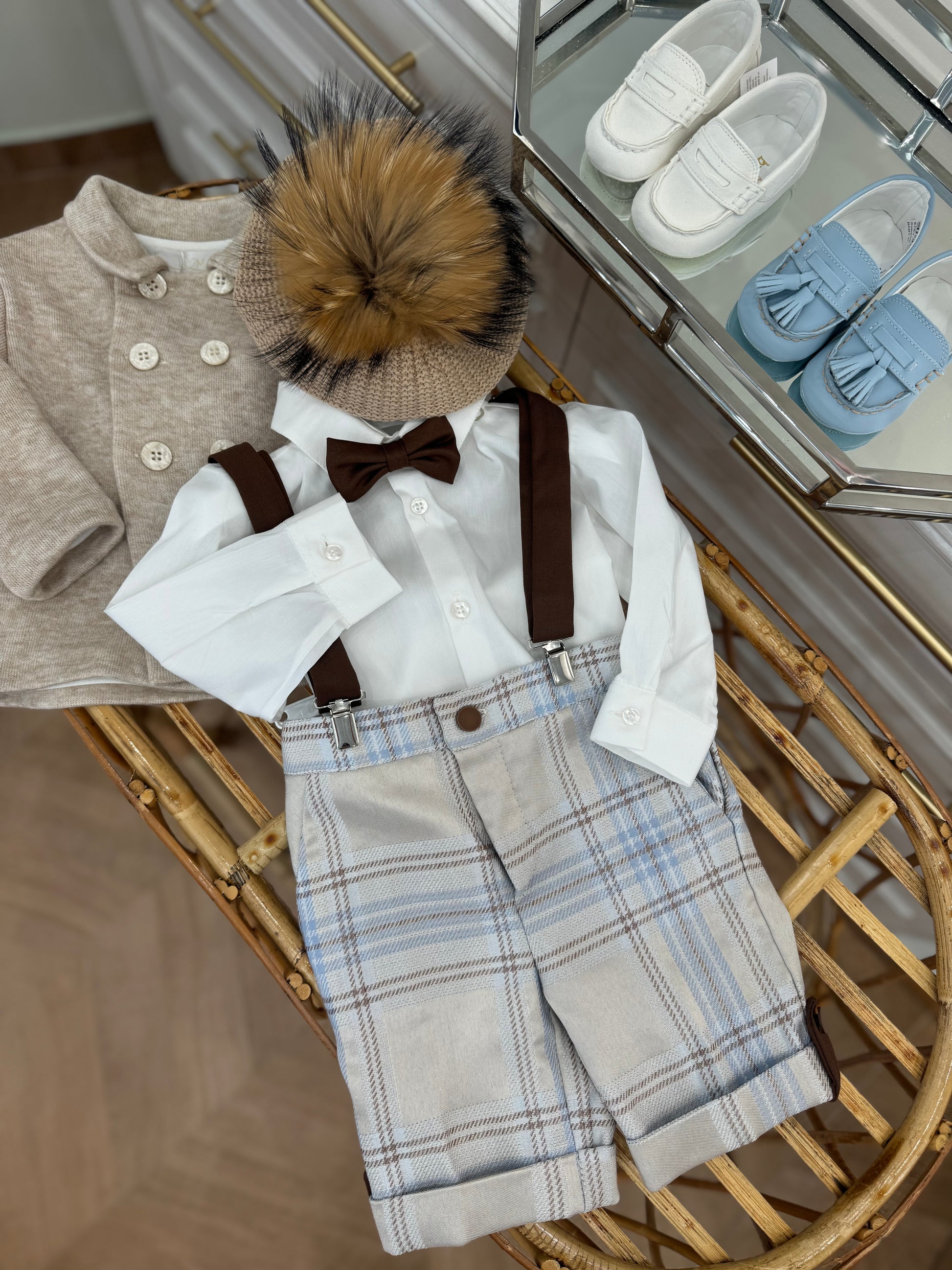 Completo stile inglese con fantasia quadroni in celeste,beige e marrone.