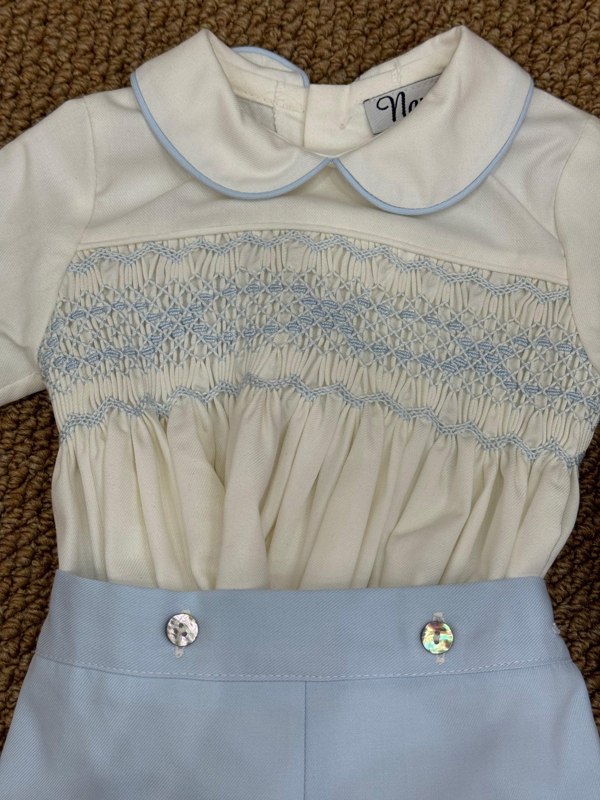 La camicia bianca è impreziosita da un raffinato ricamo smock azzurro sul petto e da un colletto tondo profilato in celeste, che dona un aspetto dolce e curato. Le maniche lunghe terminano con polsini chiusi da un piccolo bottone in madreperla, mantenendo uno stile tradizionale.