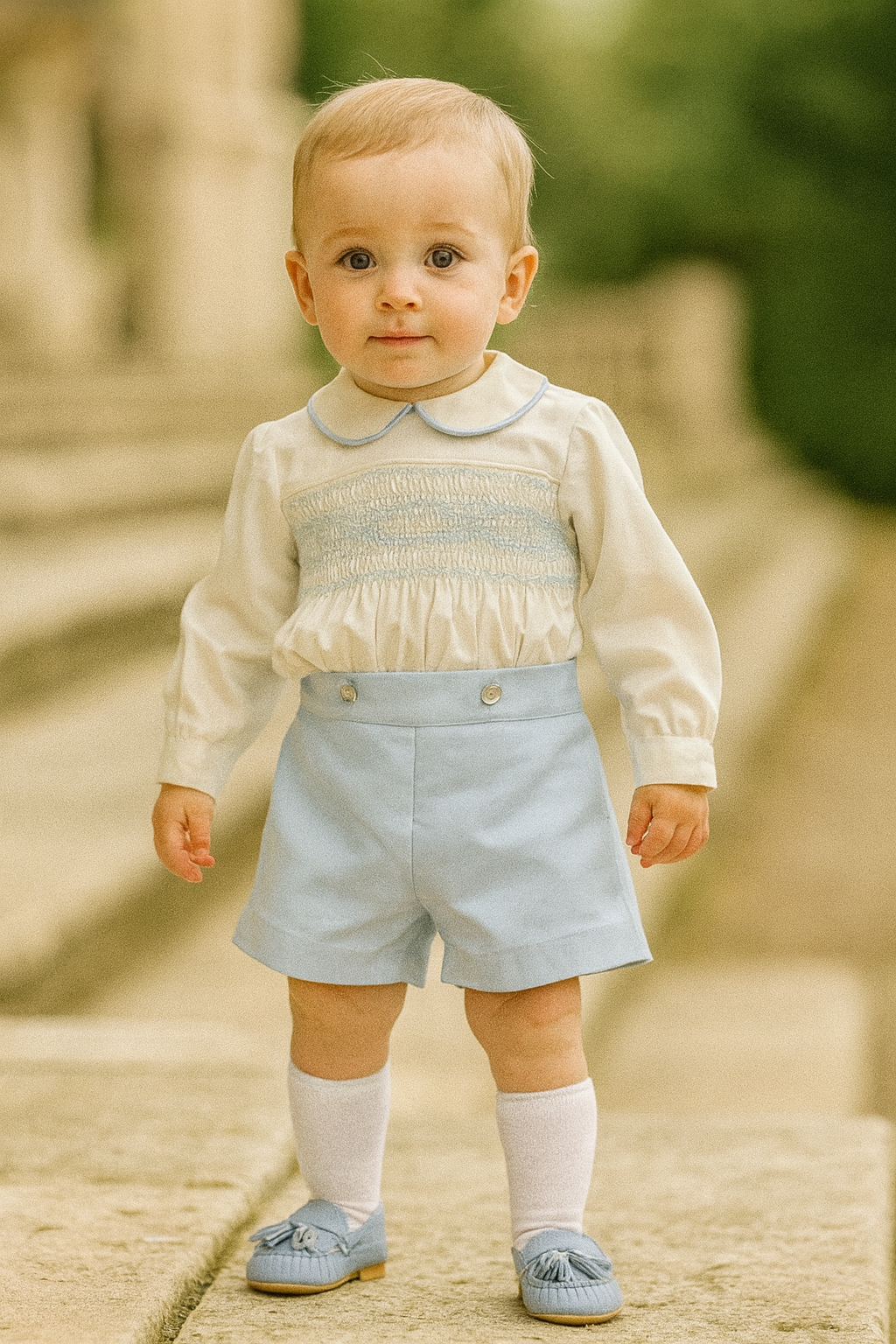 I pantaloni corti color azzurro polvere sono abbinati alla camicia tramite una vita alta con due bottoncini frontali, che richiamano il taglio vintage dei completi da bimbo di una volta.