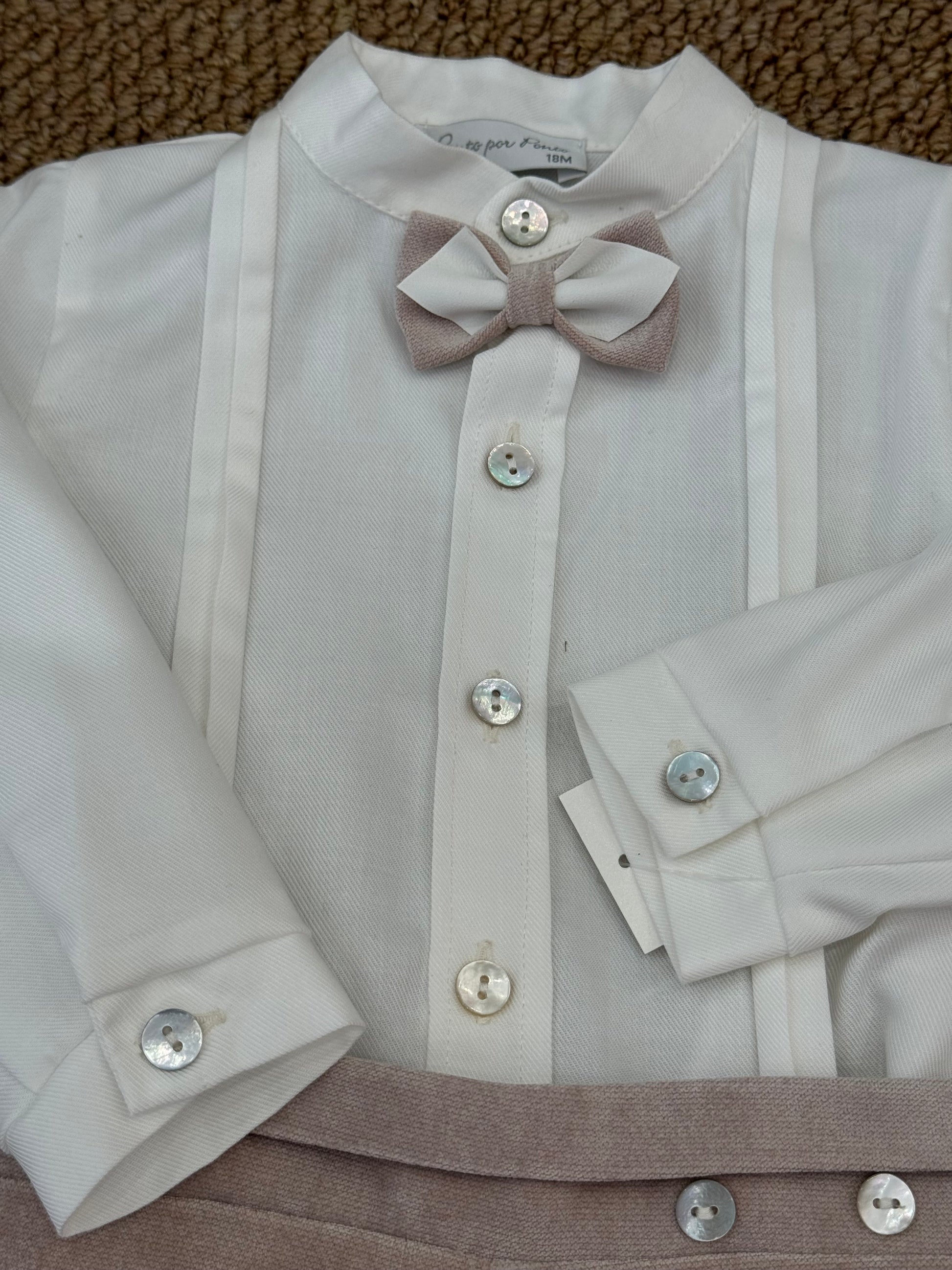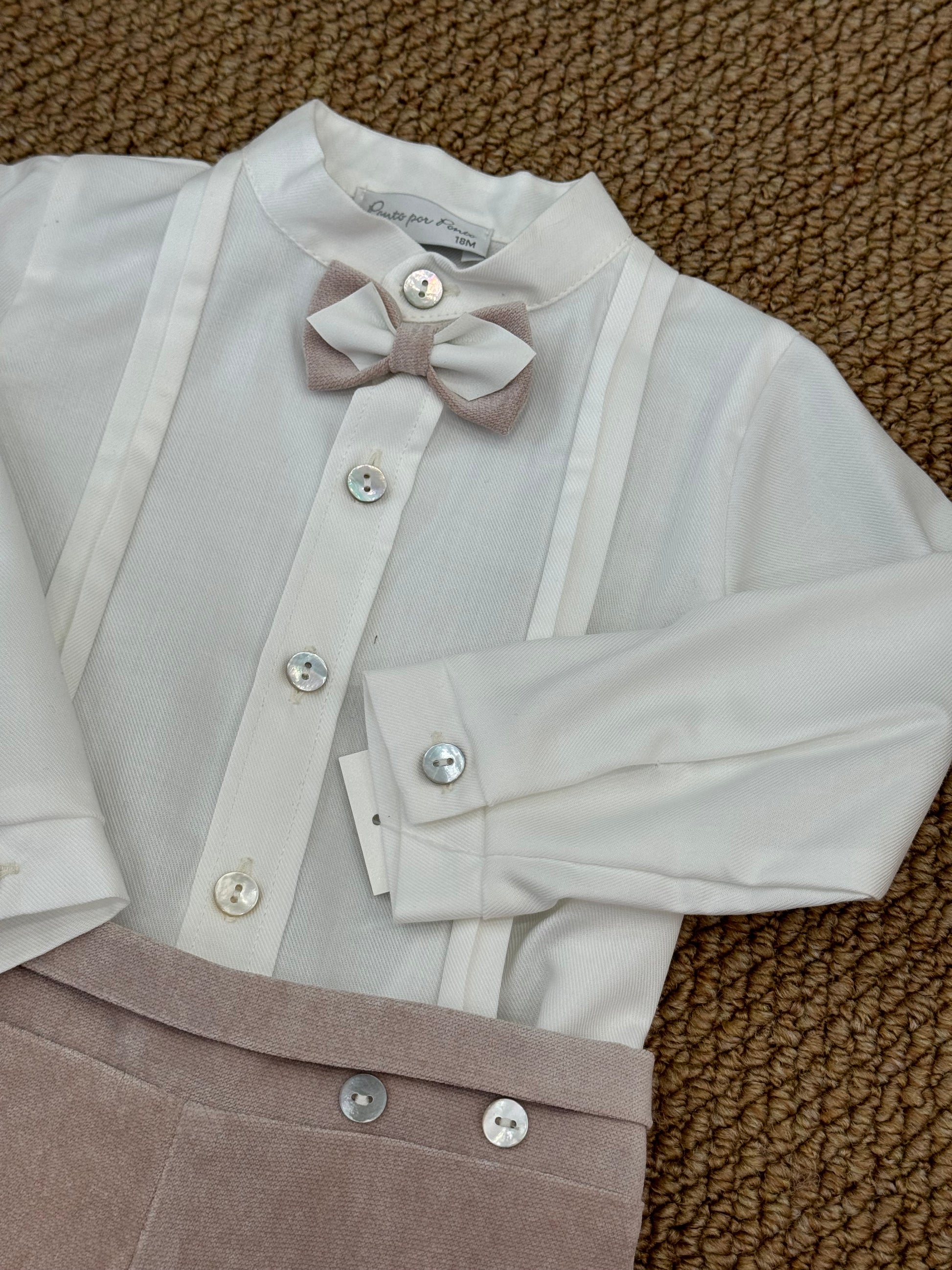 Compro composto da camicia in cotone caldo con bottoni in madreperla, pantaloncini in velluto con bottoni in madreperla come dettaglio.
