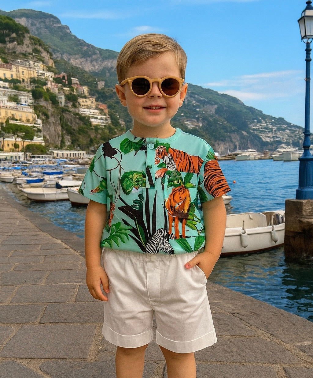 camicia fantasia giungla in cotone effetto seta e dettagli in rilievo