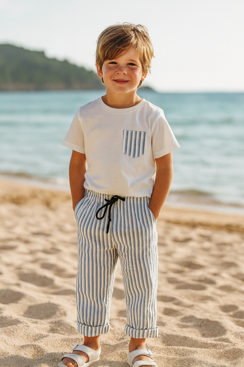 Completo millerighe con t-shirt in cotone con taschino che richiama la fantasia del pantalaccio tutto in un fresco cotone.