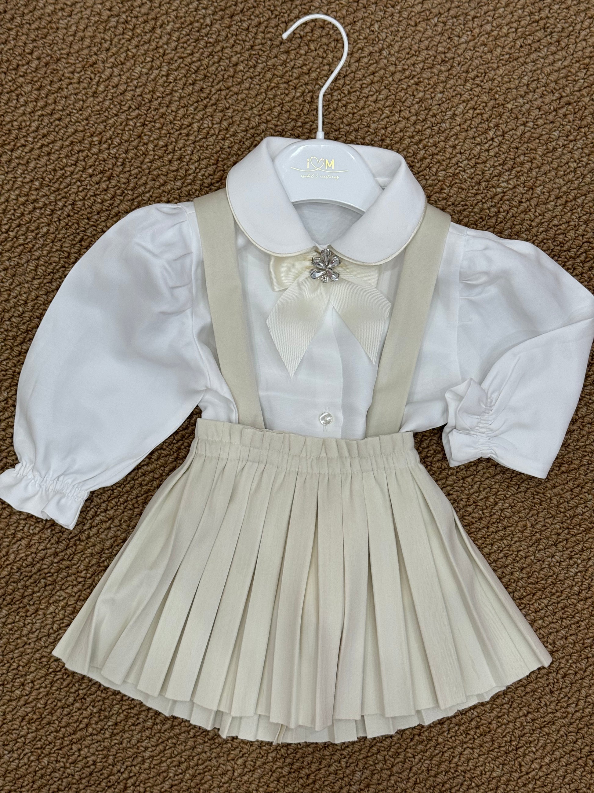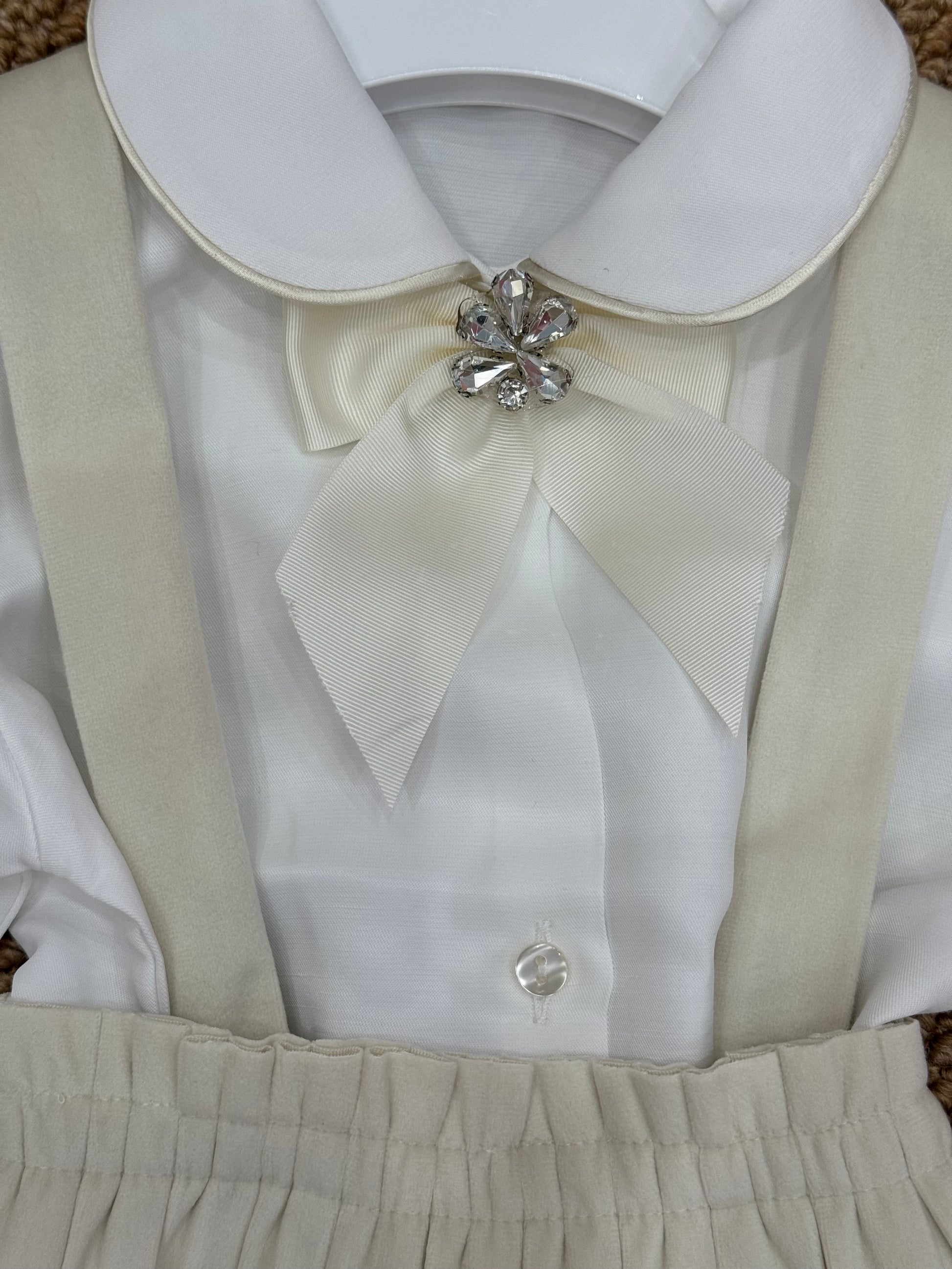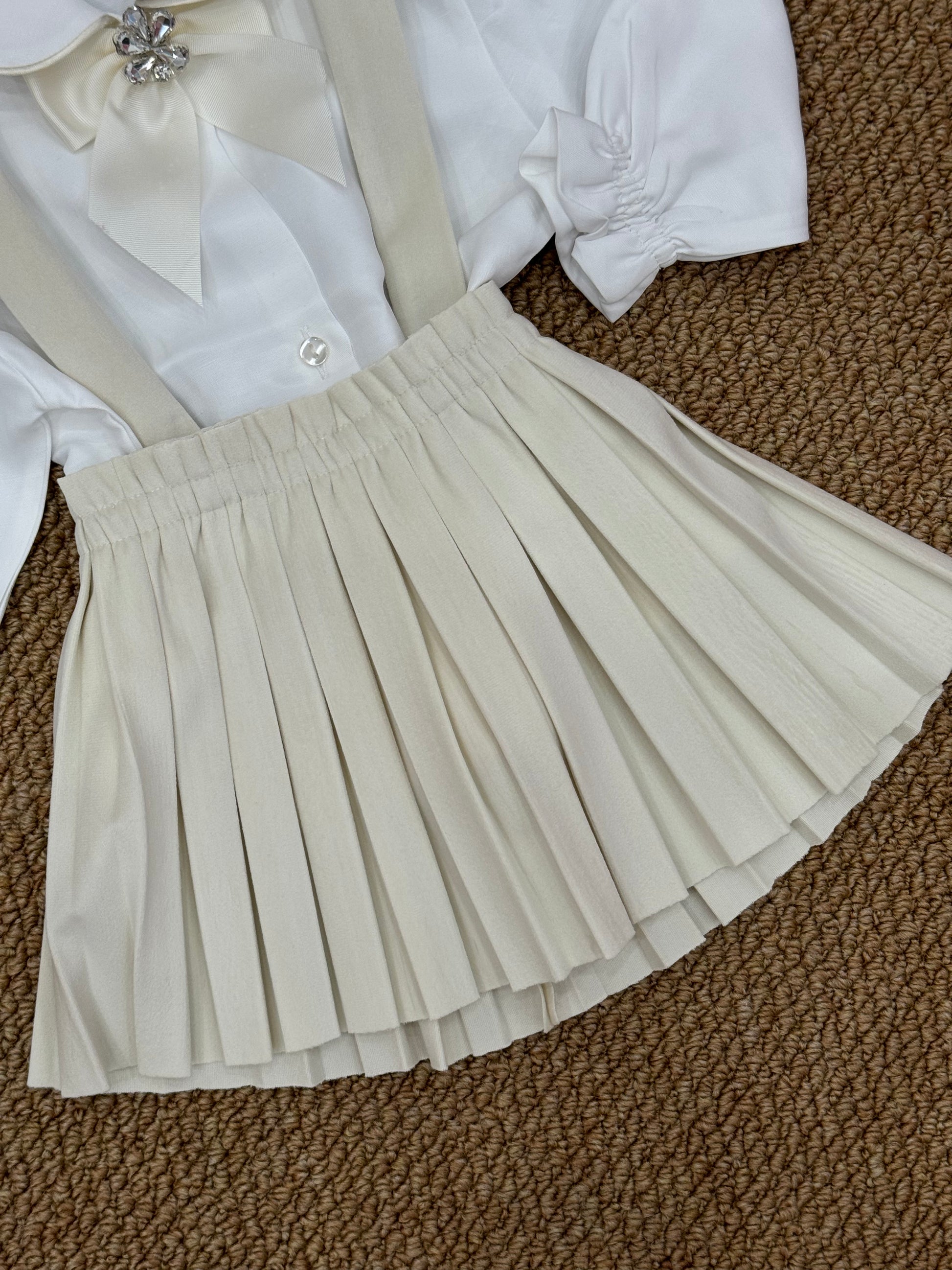 - Gonna in velluto liscio plissettata color crema con bretelle coordinate.