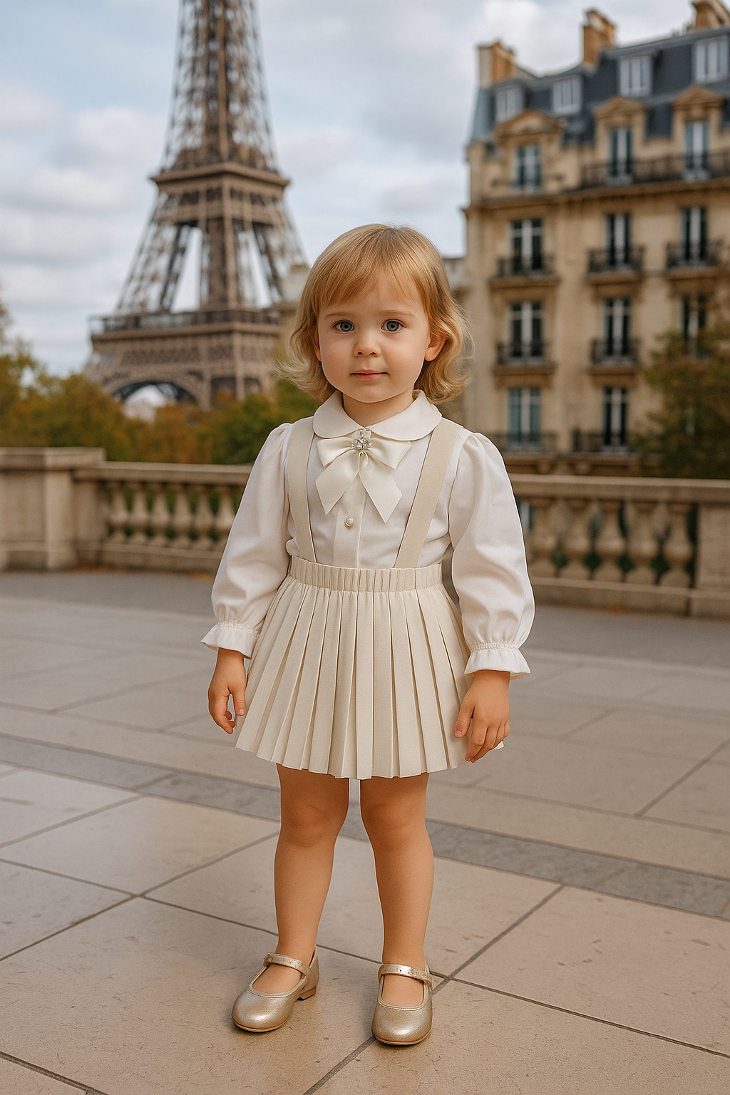 Il completo mostrato in foto è un outfit elegante da bambina, dallo stile classico e raffinato, perfetto per cerimonie o occasioni speciali.