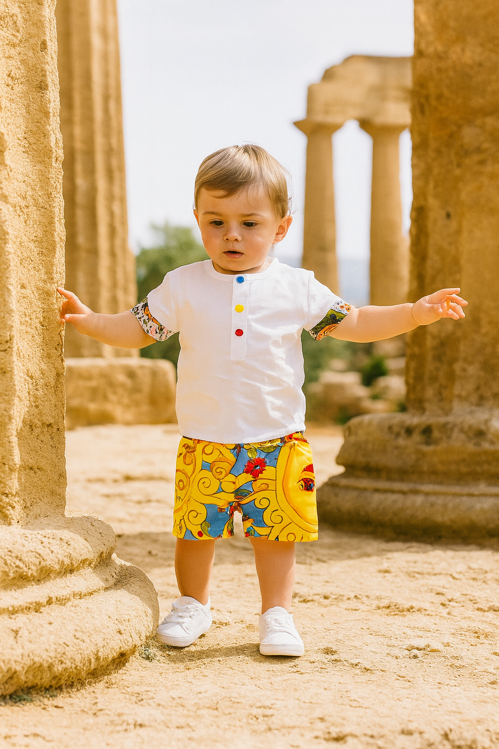Il completo è un outfit estivo per bambino ispirato ai colori e alla vitalità della Sicilia.