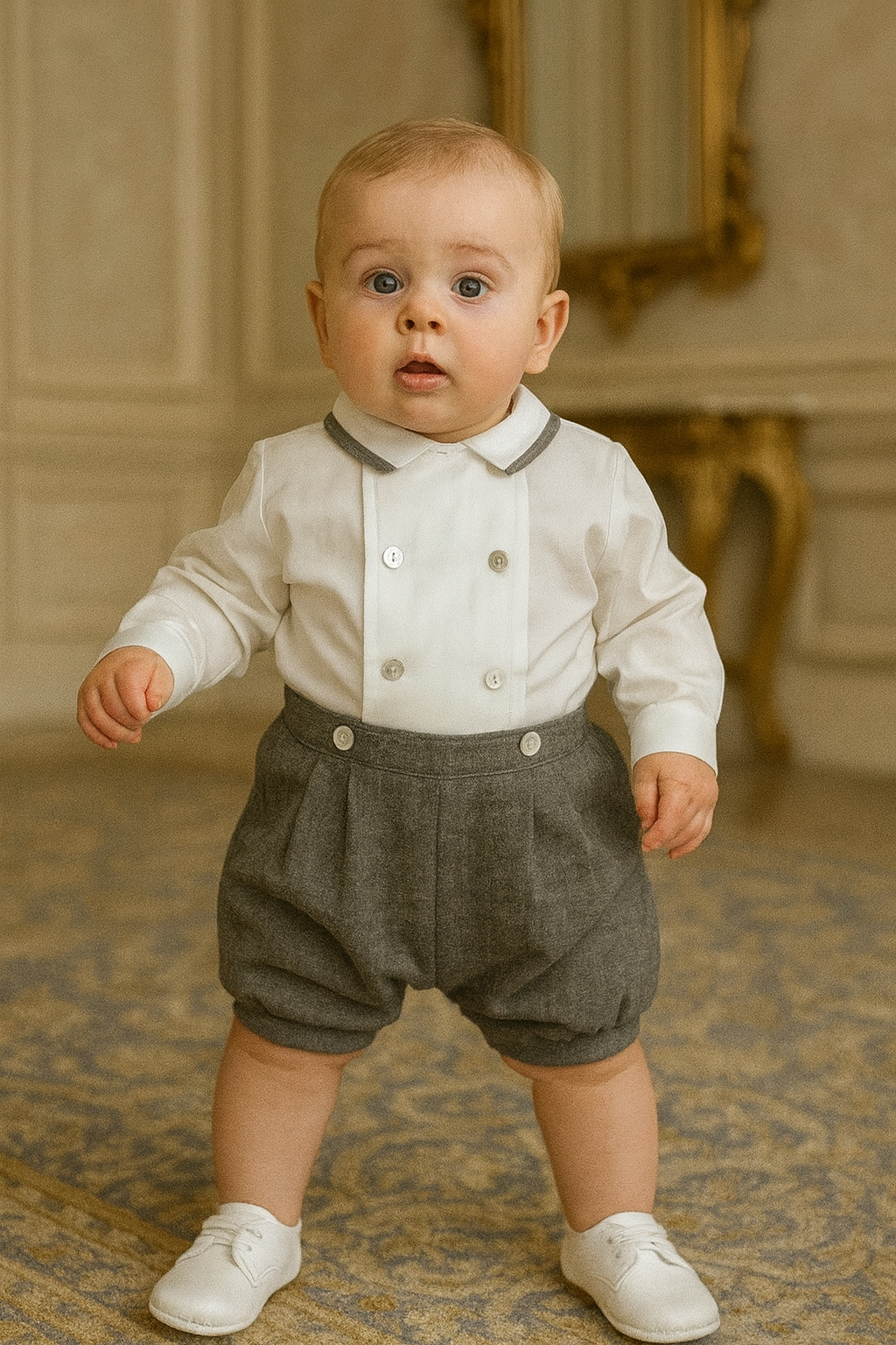 Completo con camicia doppio petto con bottoni madreperla pantaloni in grigio scuro con elastico.