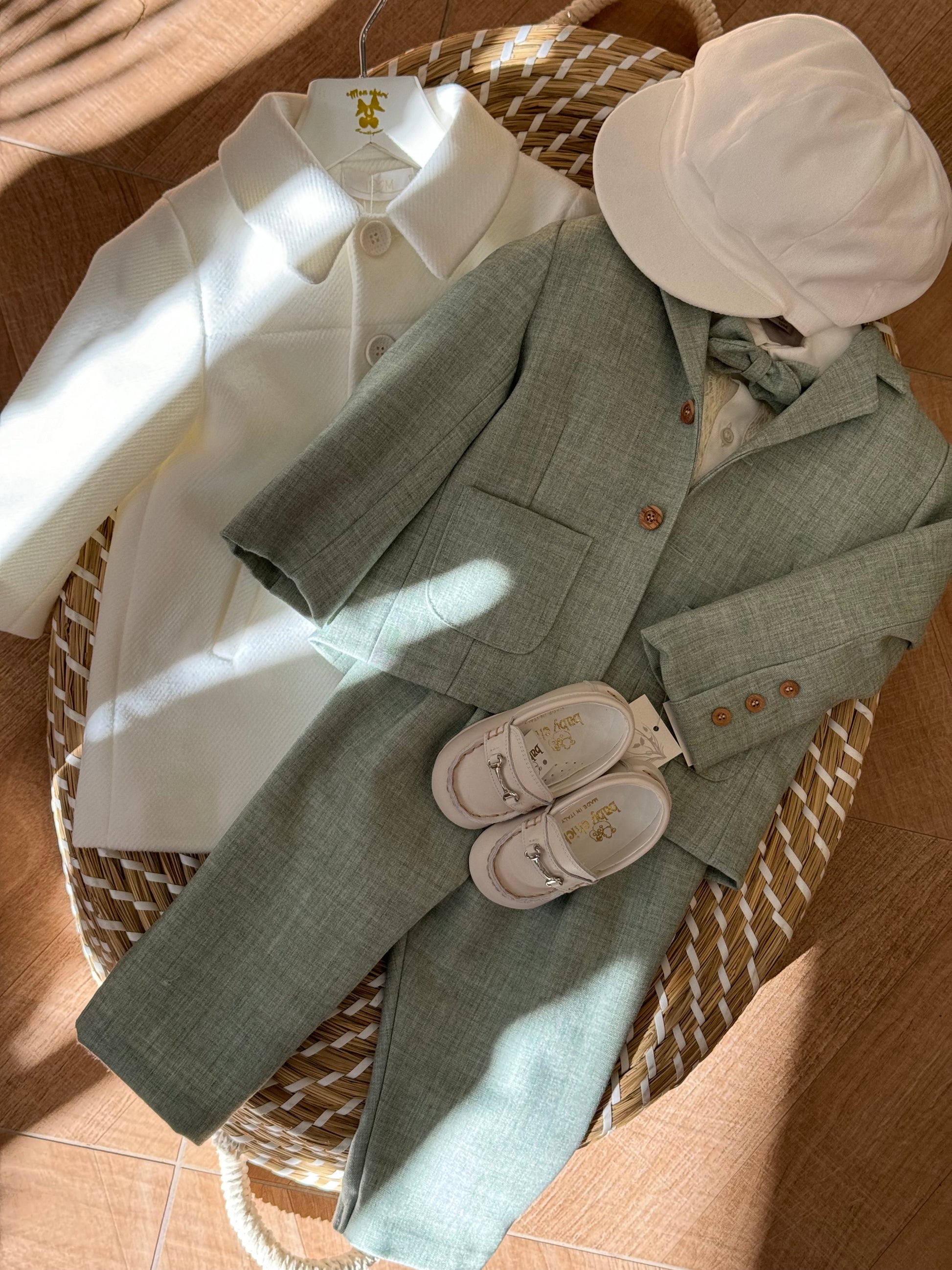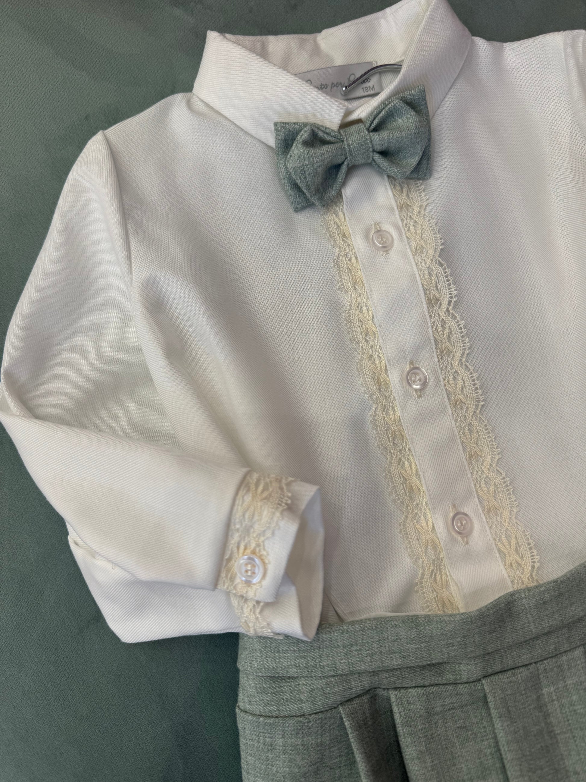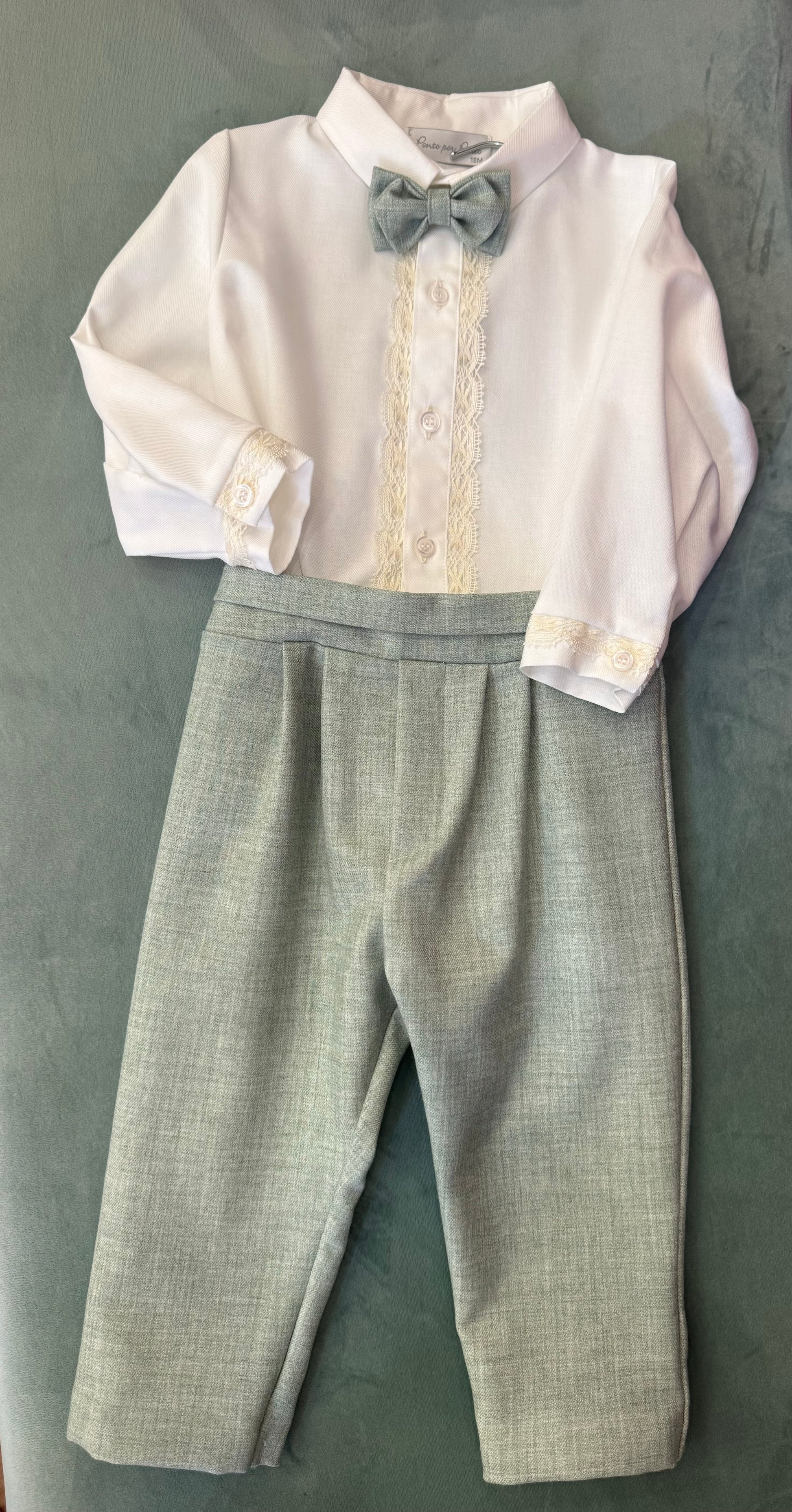 Papillon coordinato – in tessuto verde salvia chiaro con una texture leggermente melangiata, perfettamente abbinato ai pantaloni.