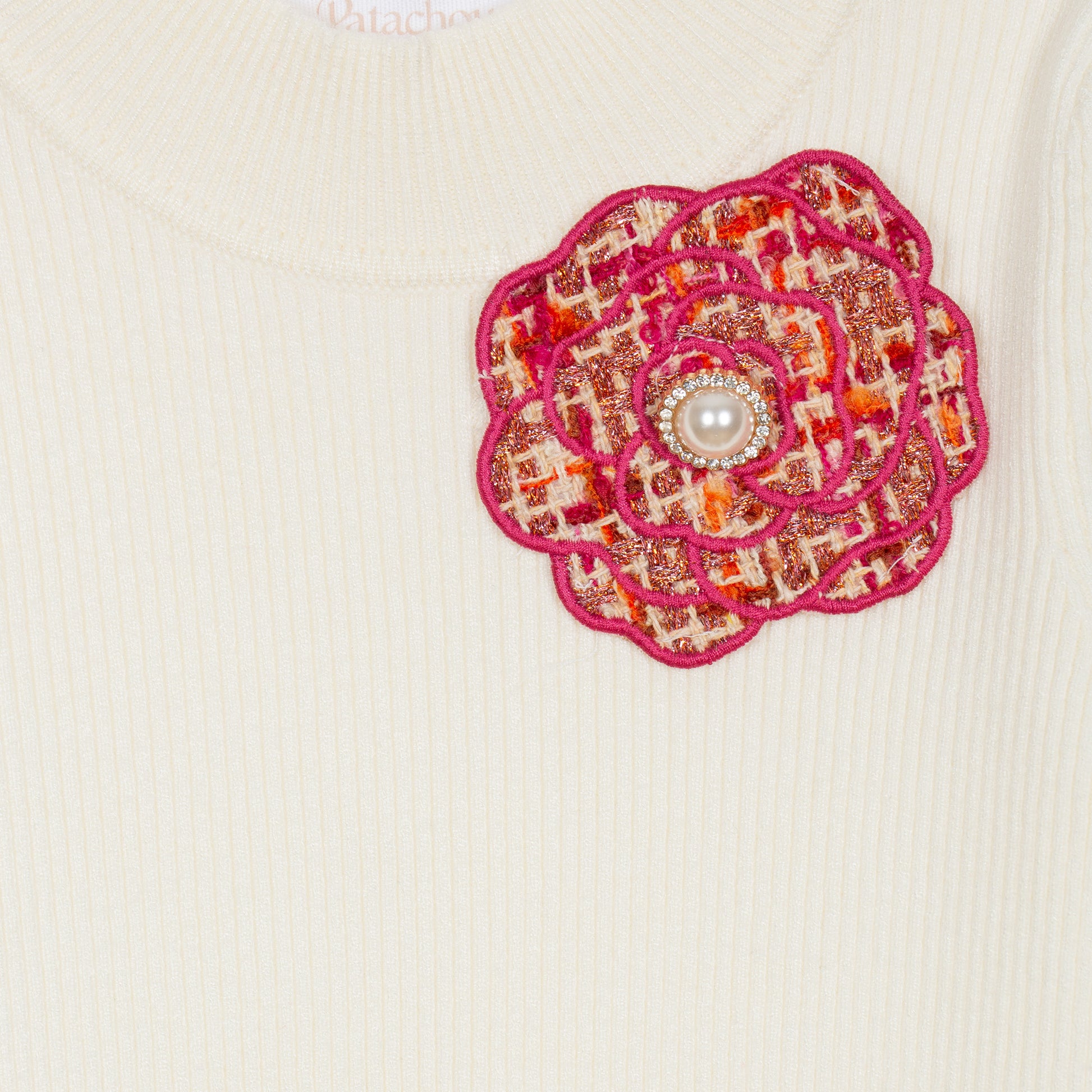 Completo composto da dolcevita micro costine con spilla fiore che richiama la trama della