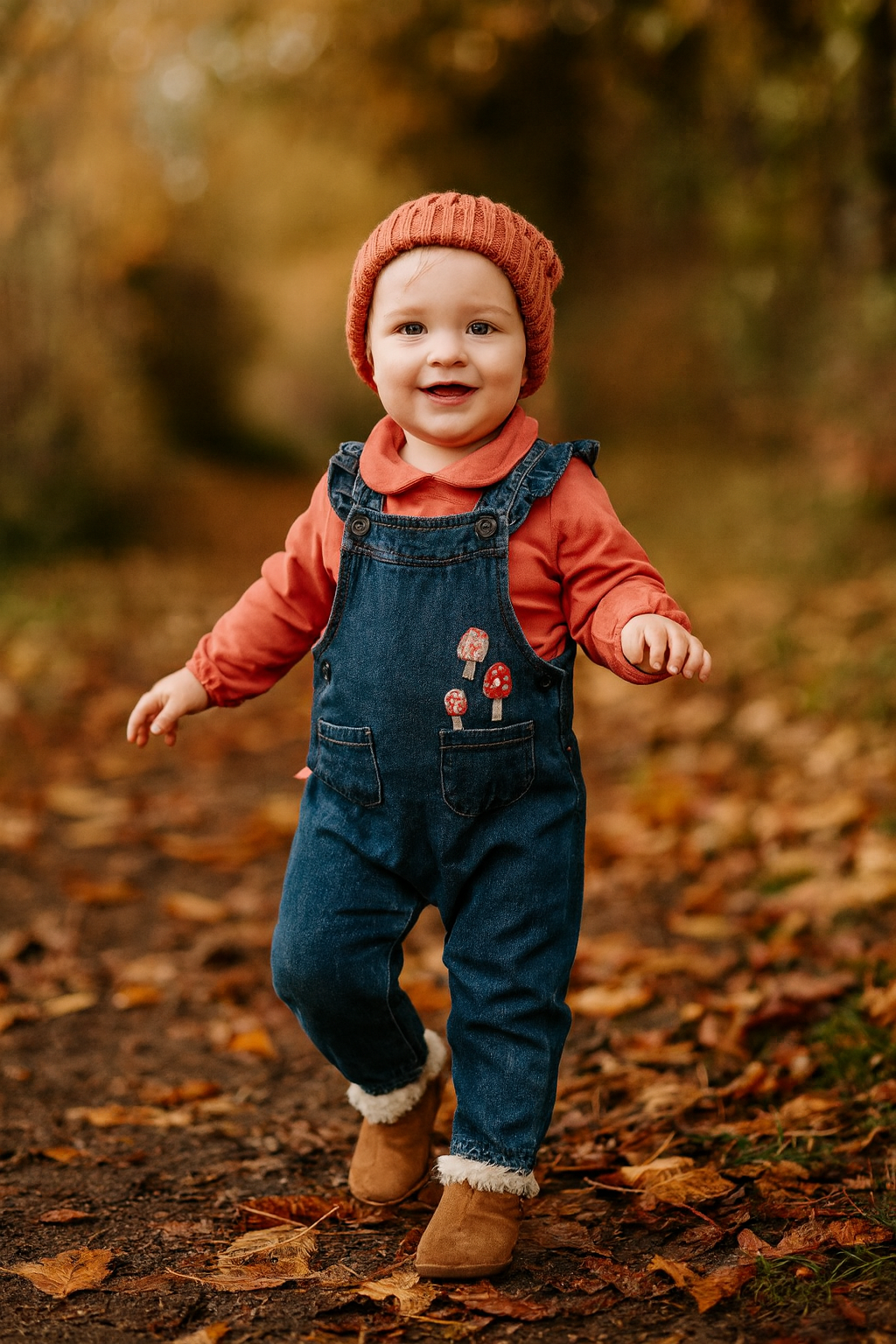 Delizioso completo composto da una salopette in denim blu con taschine frontali e ricamo di funghetti colorati, abbinata a una maglia a maniche lunghe rosa corallo con colletto arrotondato. Un outfit pratico e stiloso, perfetto per la quotidianità e per le prime uscite autunnali.