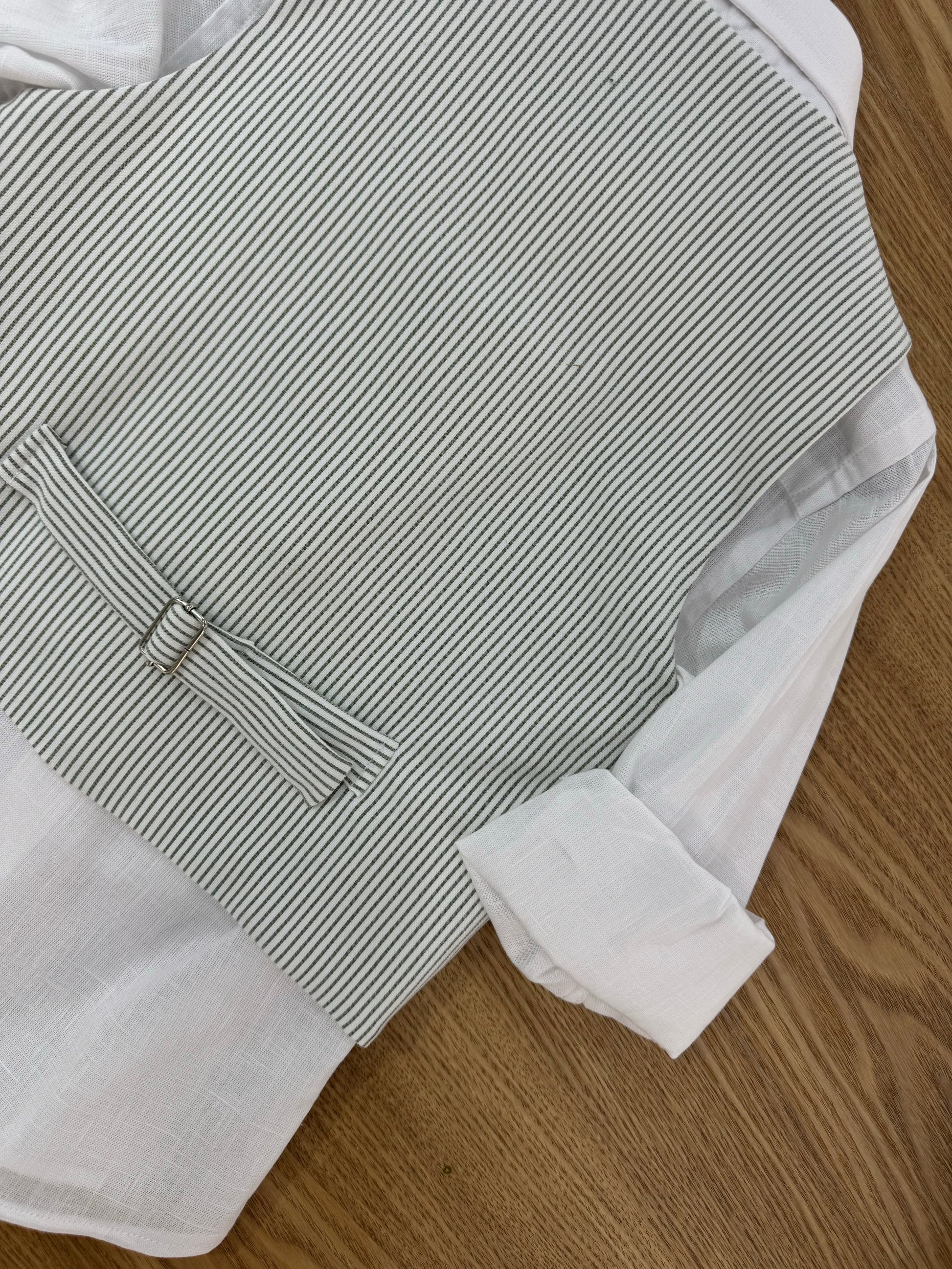 • Gilet a righe sottilissime verde salvia e bianco, con tre bottoni centrali tono su tono e taschine decorative