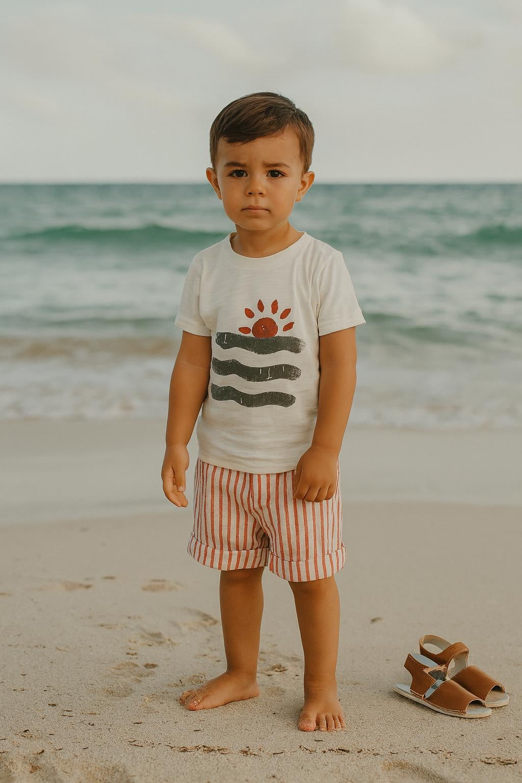 Completo con t-shirt in cotone e pantalone a righe color mattone e avorio.