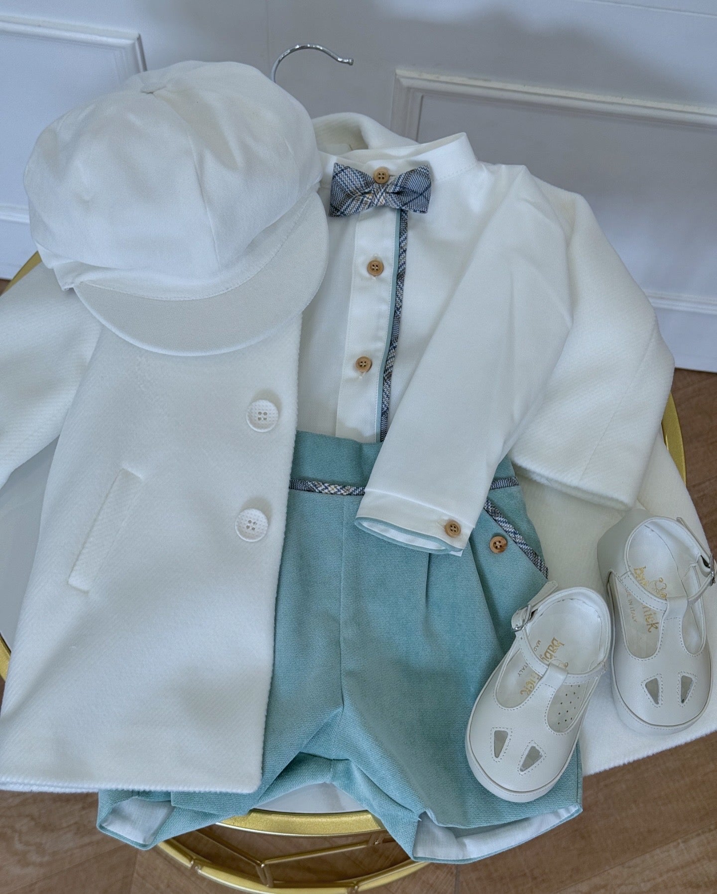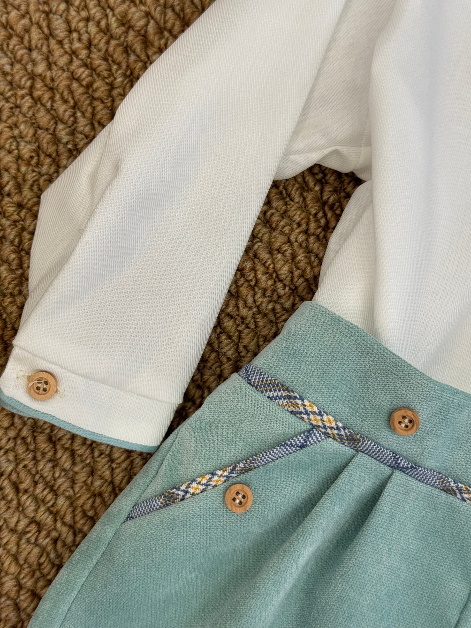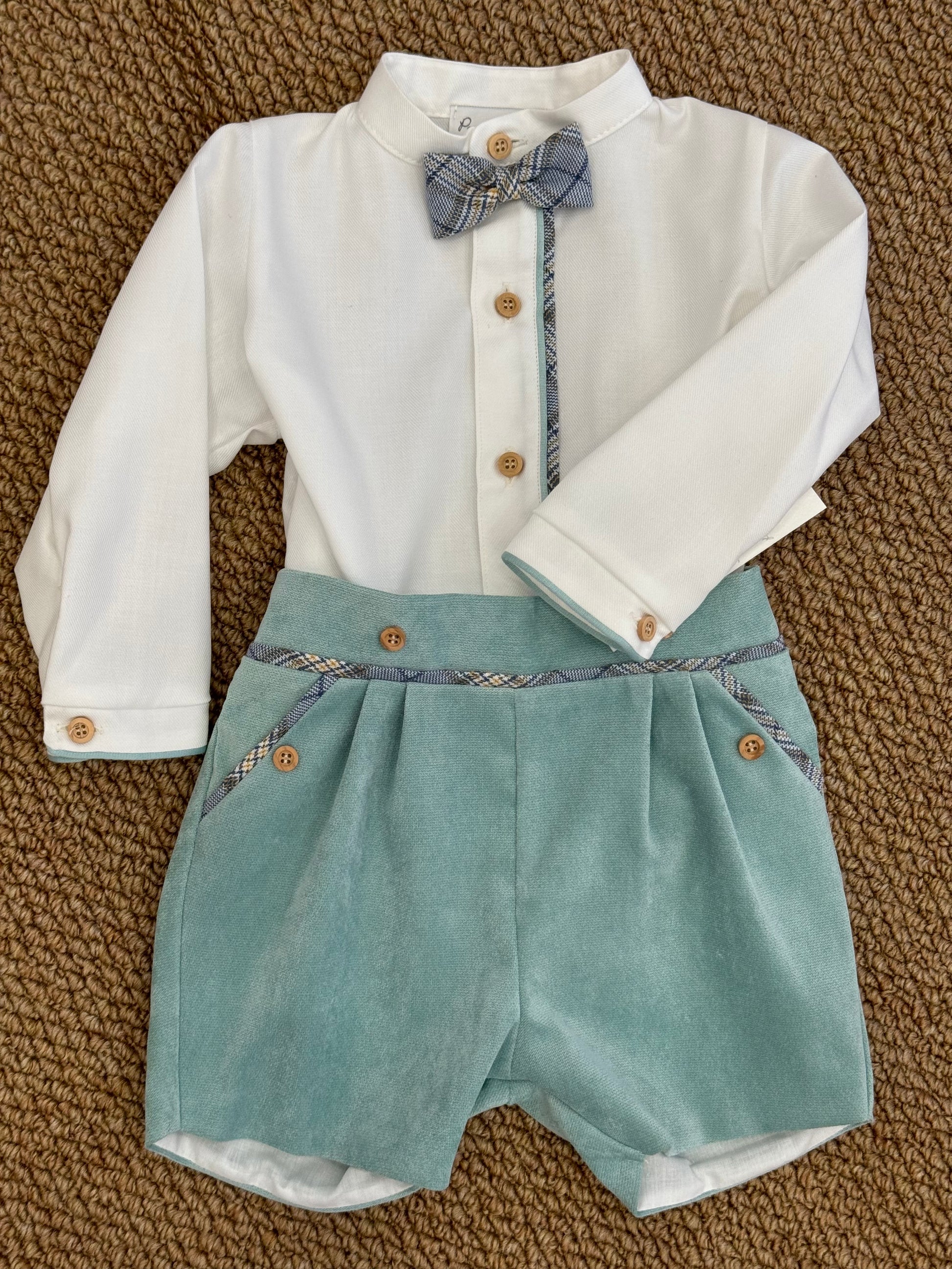 camicia in caldo cotone con rifiniture in fantasia , bottoncini in legno e papillon fantasia
