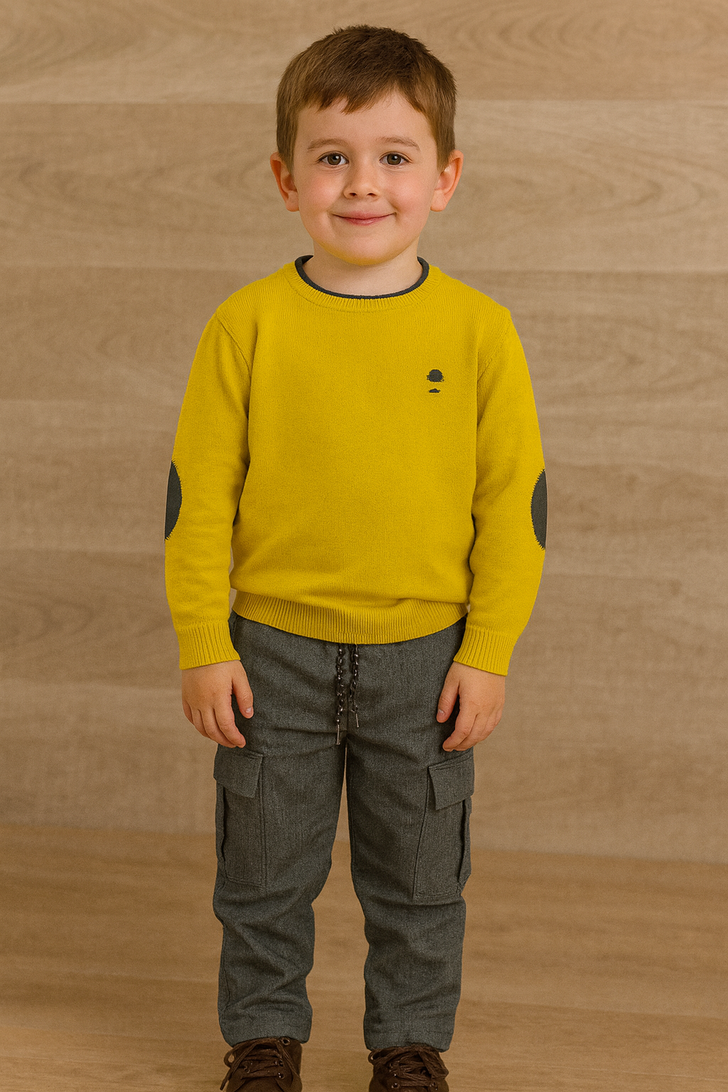 Maglione verde da bambino, progettato per offrire comfort e stile in ogni occasione. Realizzato in morbido tessuto a maglia, presenta un collo rotondo e maniche lunghe che conferiscono un look moderno ed elegante.