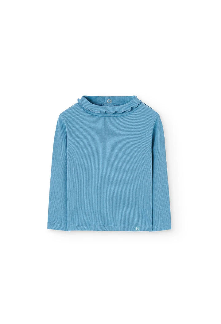 Maglietta di cotone per bambina, di colore verde acqua, ideale per i climi più freschi. Disegnata con un elegante collo rotondo adornato da un delicato volant e maniche lunghe, offre comfort e adattabilità.