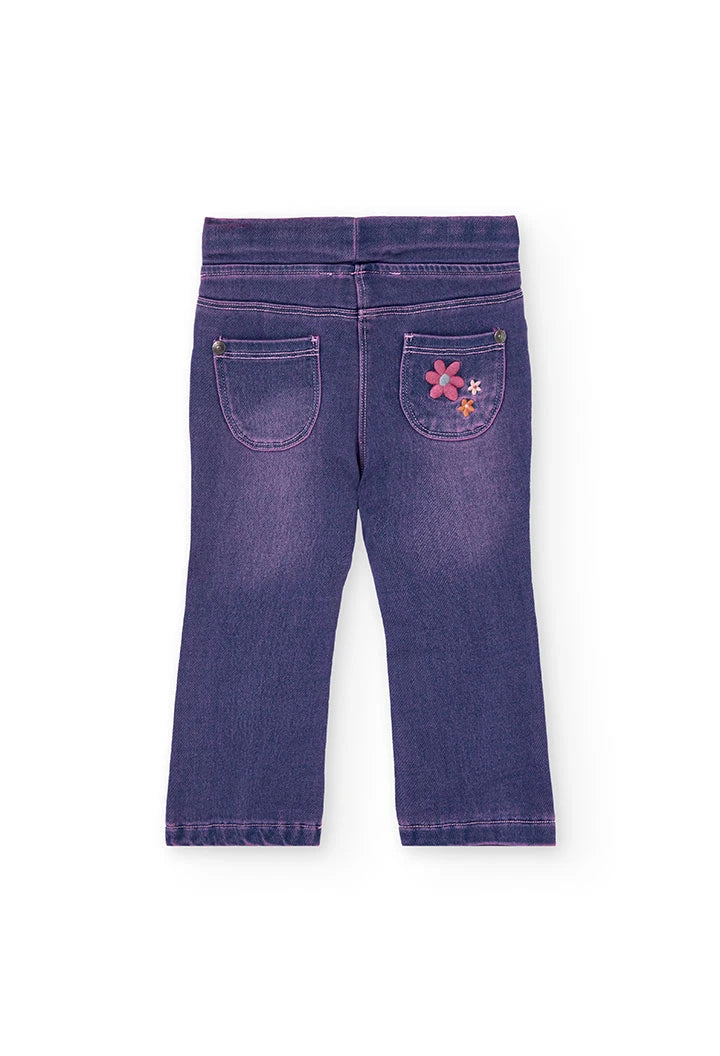 Pantaloni in denim lavorato a maglia per bambina di colore blu decorati con fiori, ideali per le stagioni autunnali e invernali. Realizzati in un tessuto morbido ed elastico, garantiscono comodità e libertà di movimento per l'uso quotidiano.