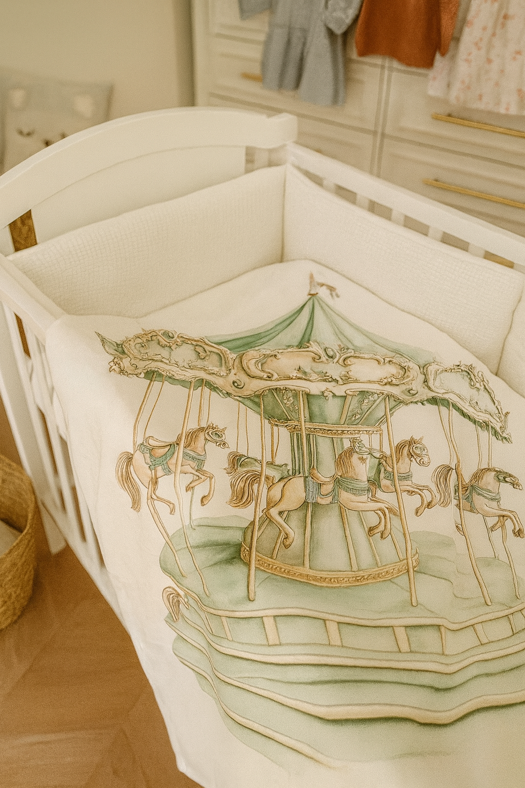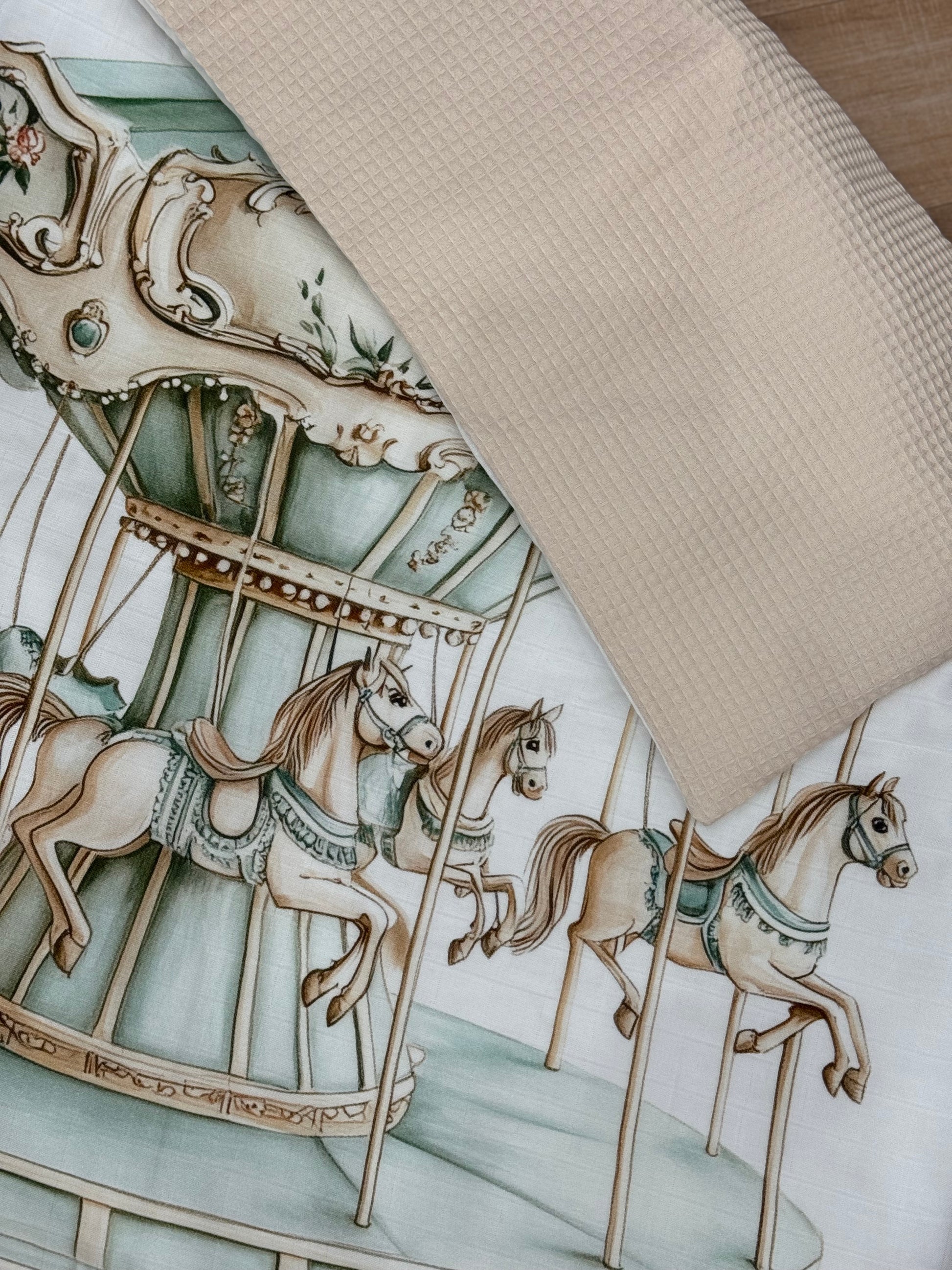 È realizzata in tessuto di cotone bambù morbido, con una superficie bianca decorata da un motivo tenero e raffinato: giostra carosello nei toni del beige e verde salvia ideale sia per bimbo che bimba.
