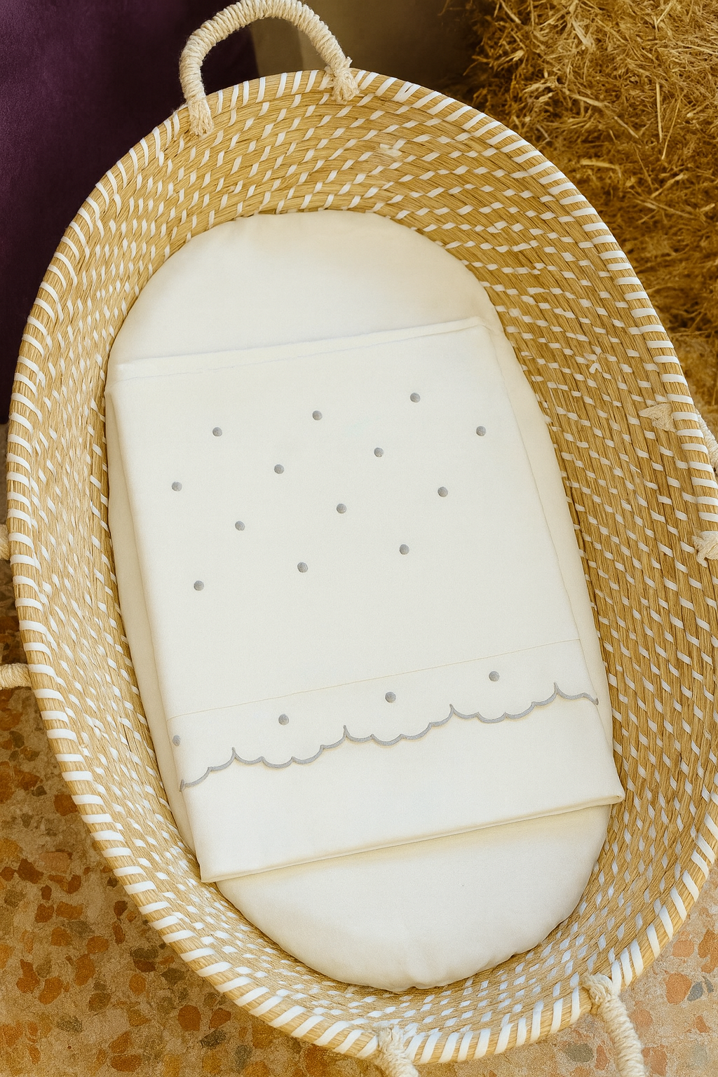 il set è composto da: federa, copri materasso e lenzuolo con ricami a poins color grigio silver.