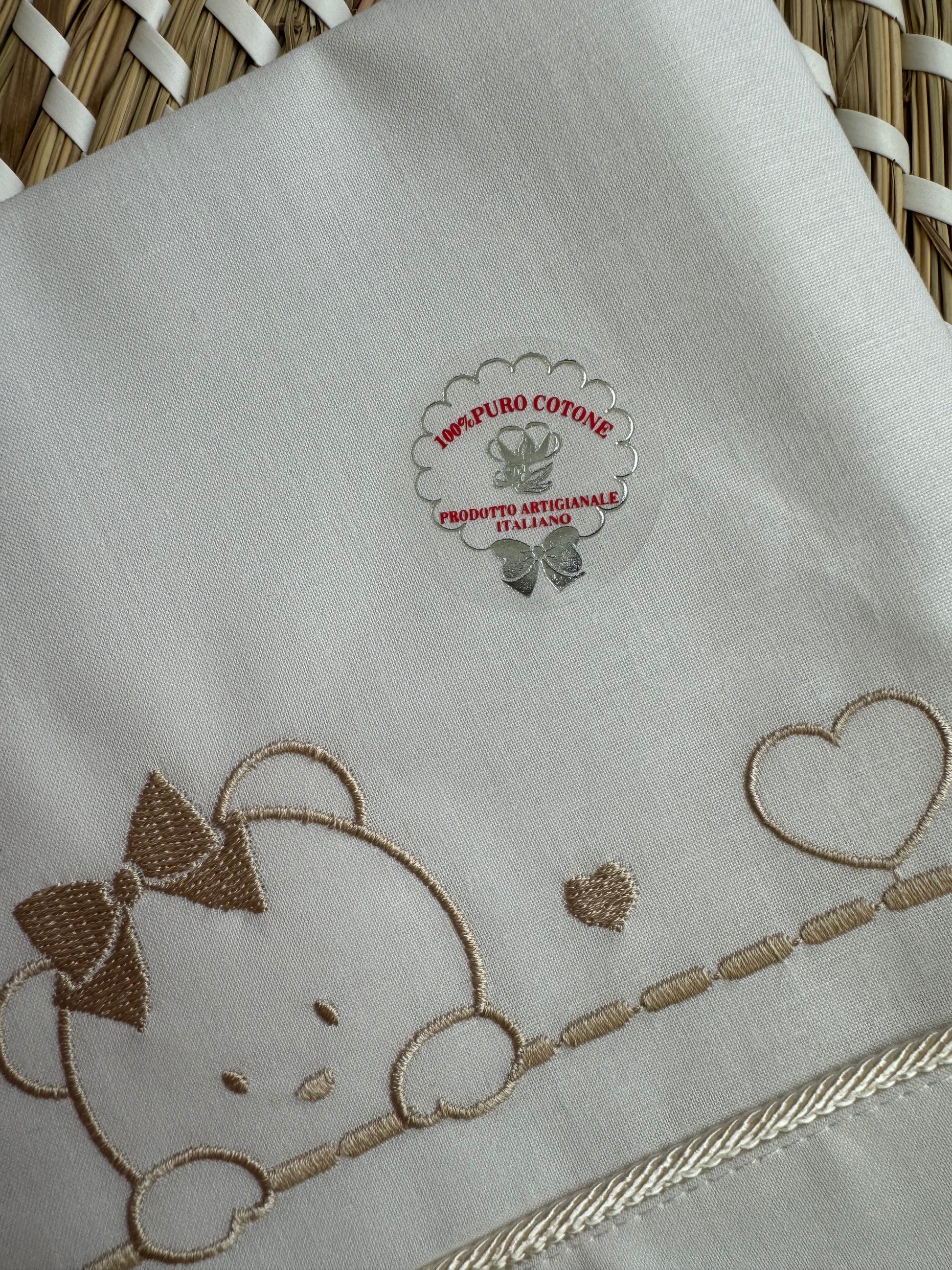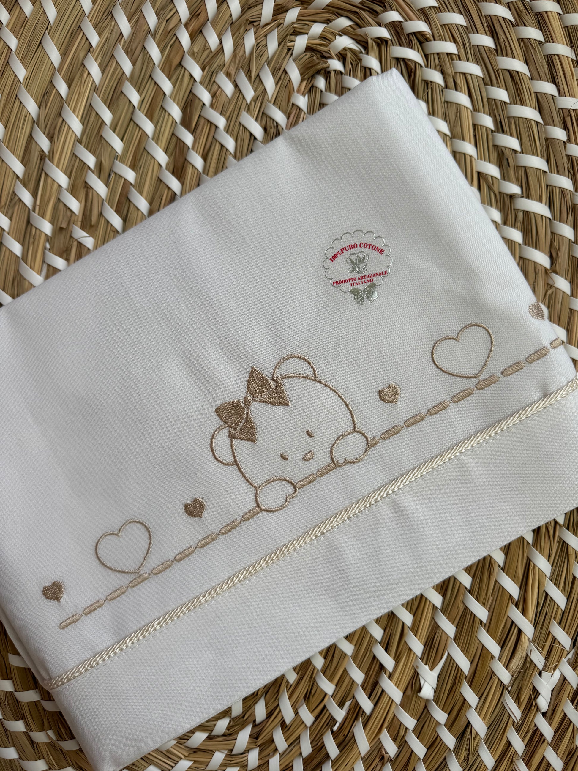 Lenzuola in 100% cotone con ricamo in beige.