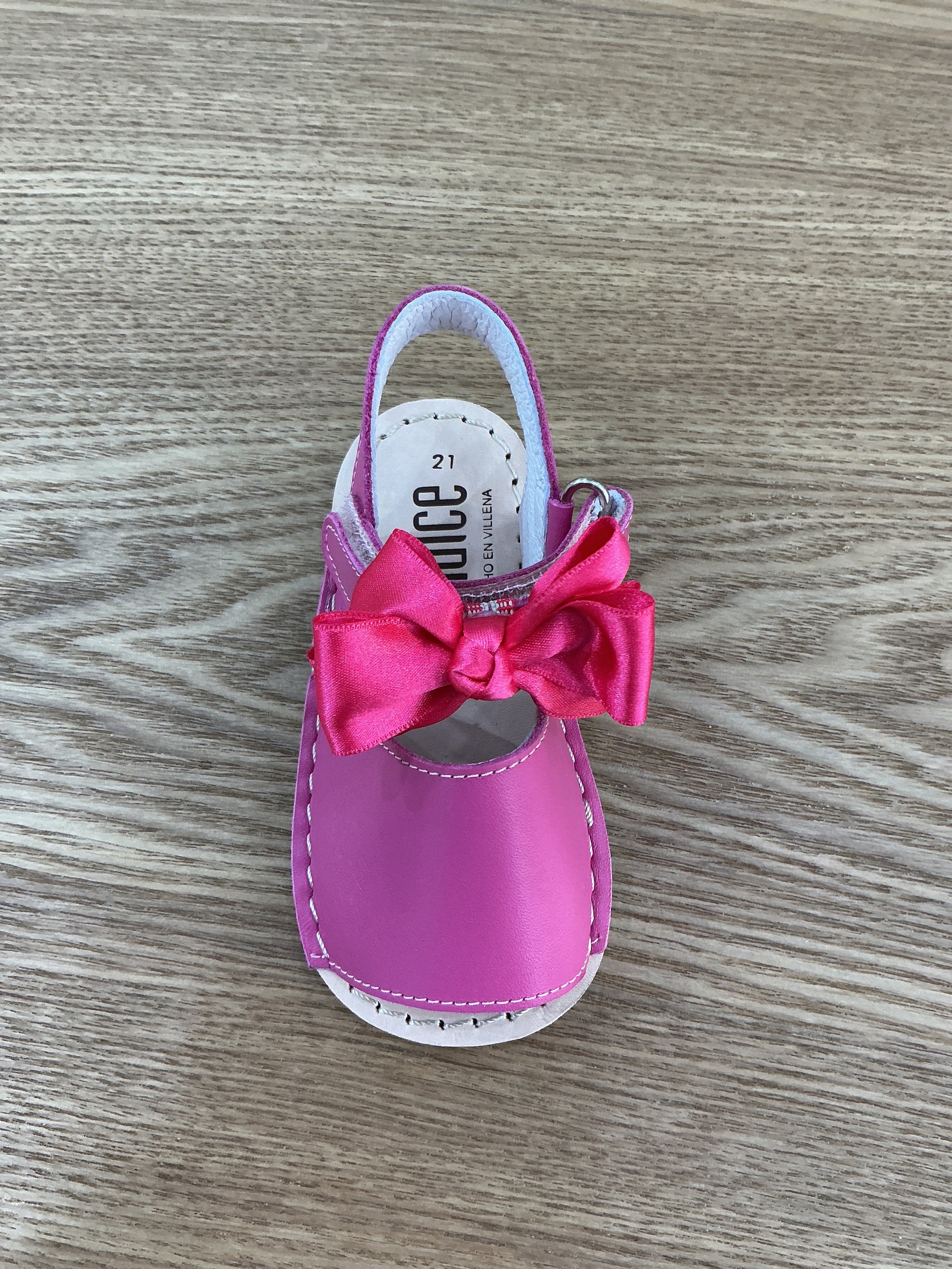 Minorchina primi passi in pelle color fucsia con apertura strappo e fiocco in raso estraibile.