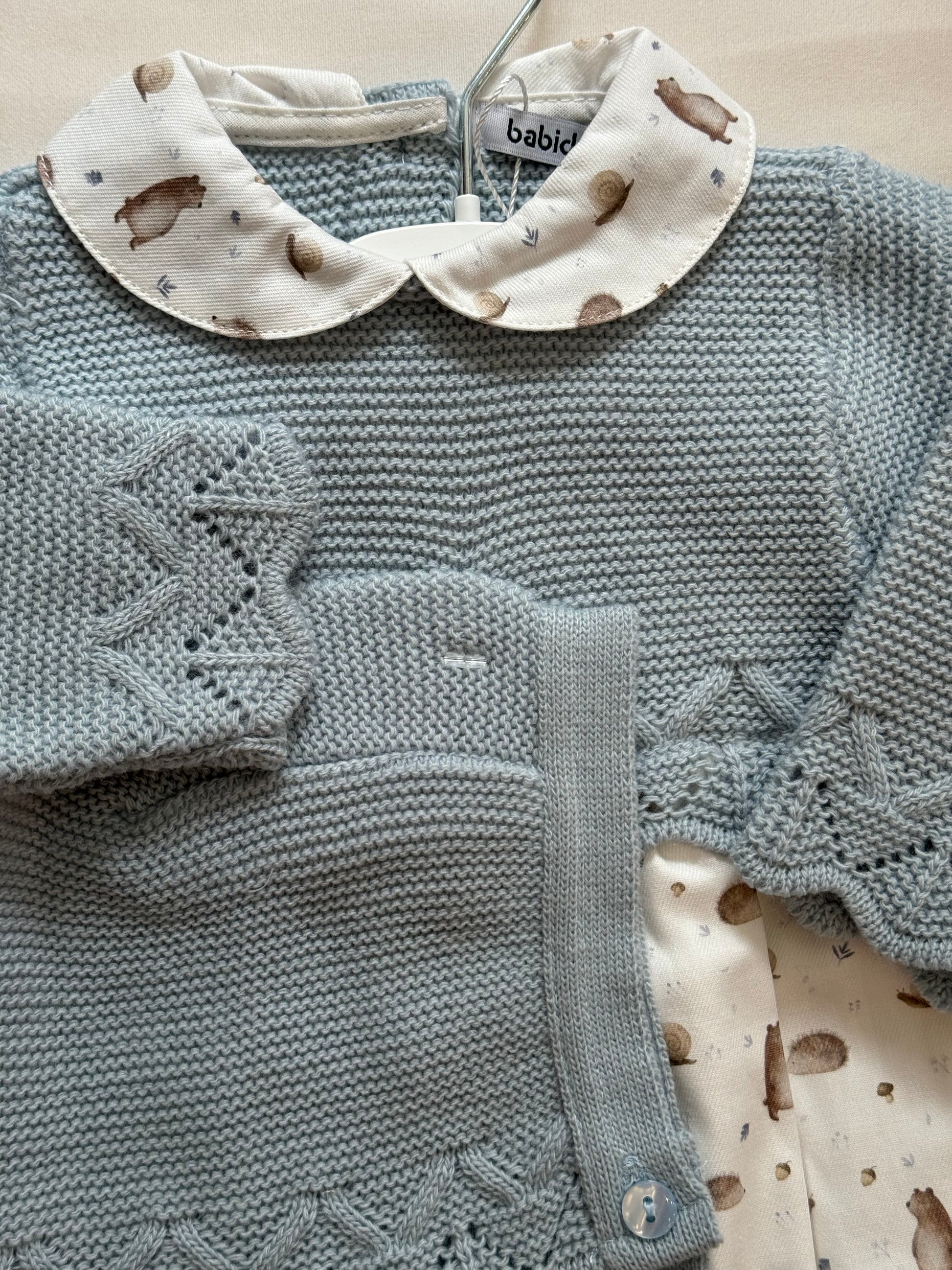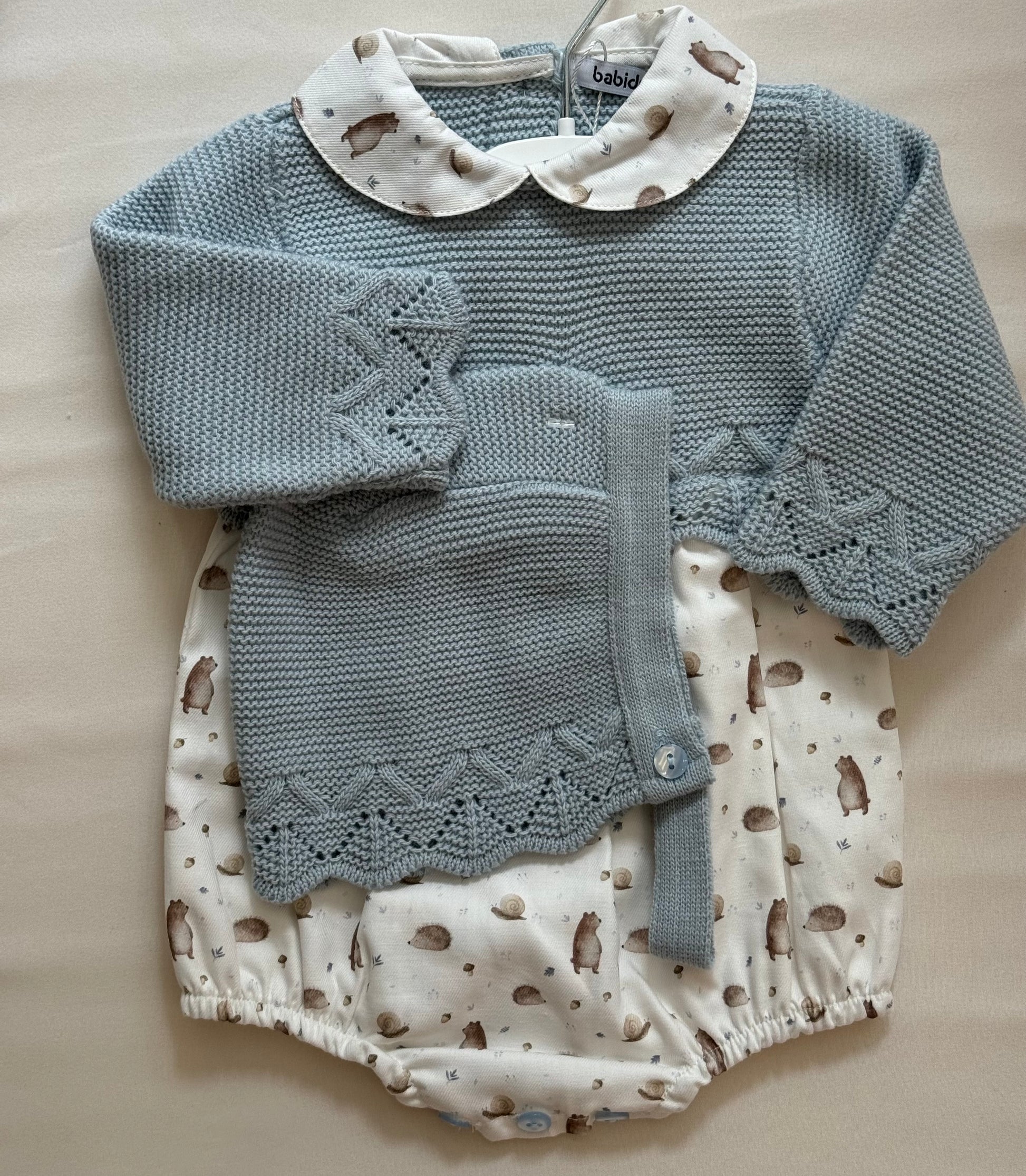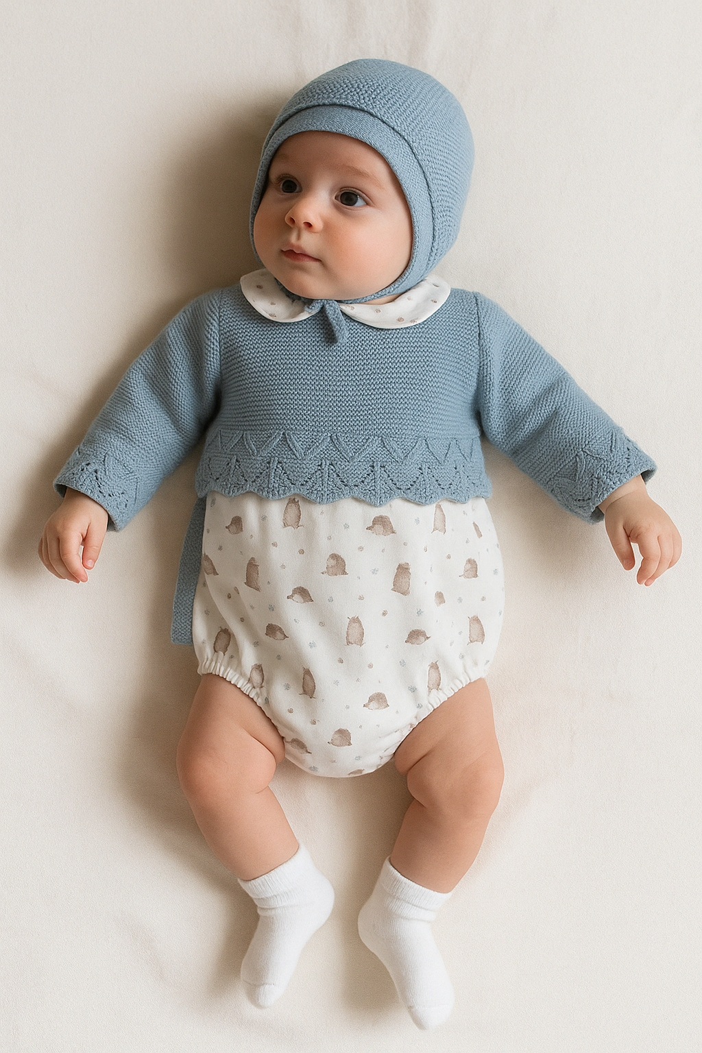 - Cuffietta coordinata in maglia dello stesso azzurro, che avvolge la testolina e si chiude sotto il mento con un laccetto, perfetta per le stagioni più fresche.