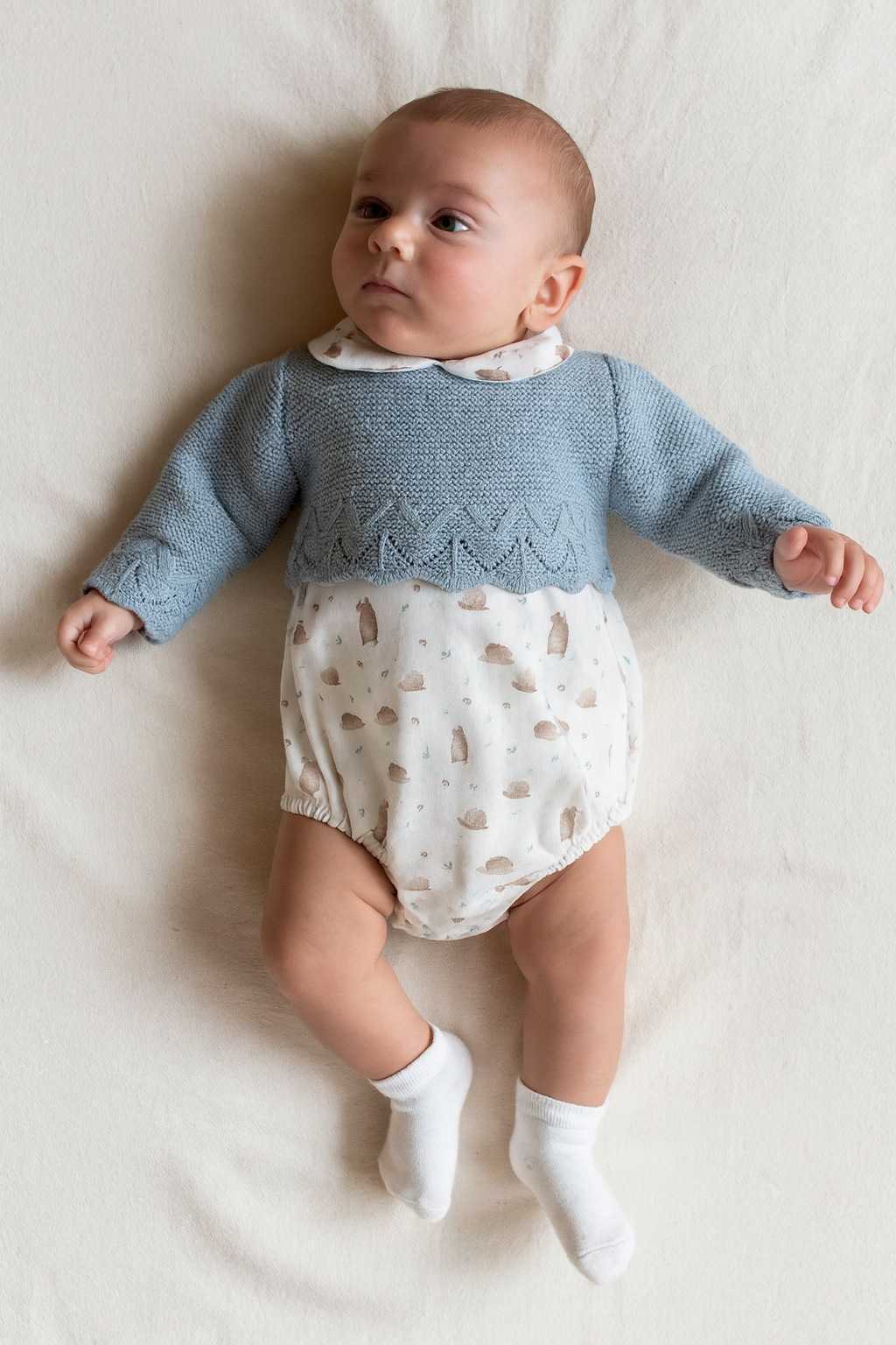 il look trasmette tenerezza e cura nei dettagli, ideale per occasioni speciali o giornate in cui si desidera vestire il bimbo con eleganza e comfort.